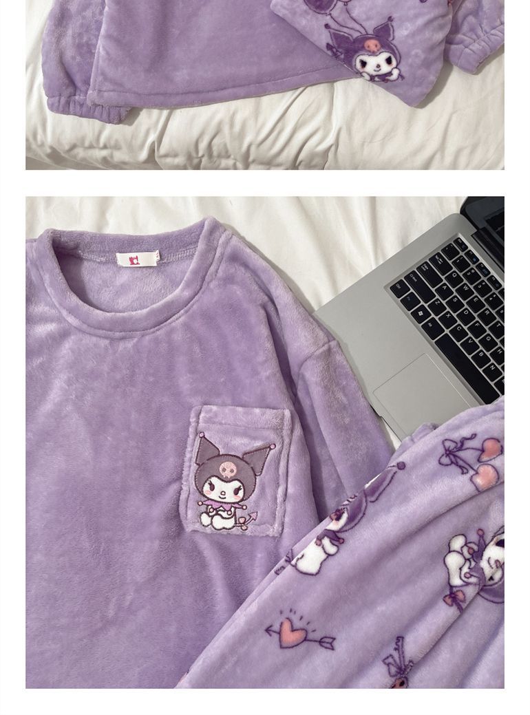 가을과 겨울 플란넬 파자마 여성 기모 두꺼운 크루 넥 산호 양털 만화 투피스 세트 홈 옷