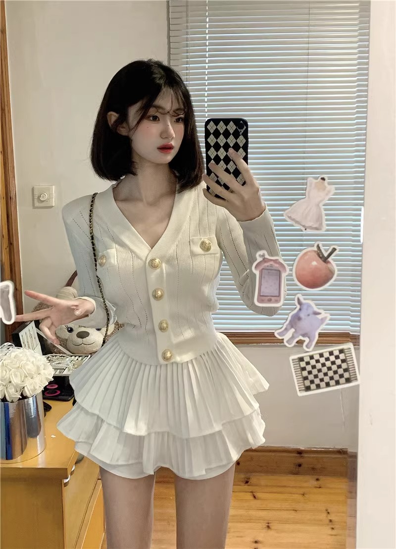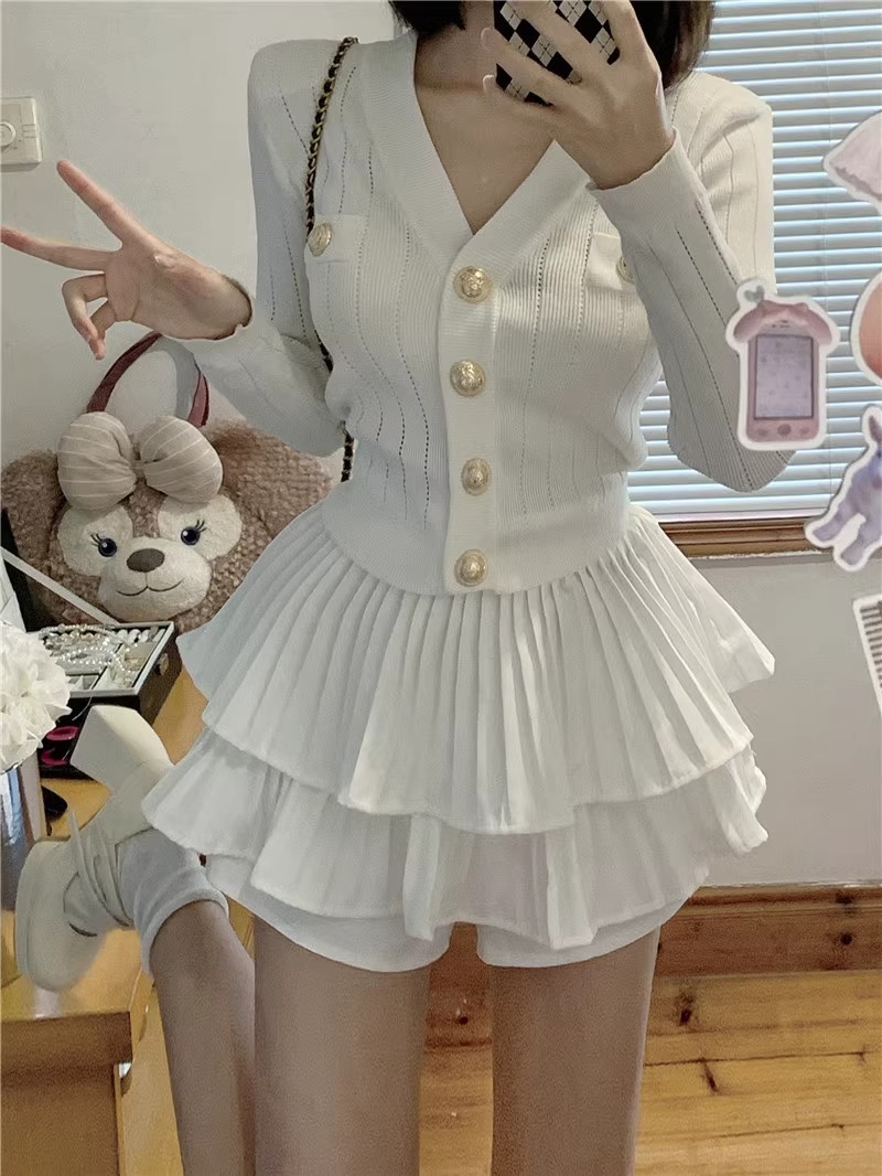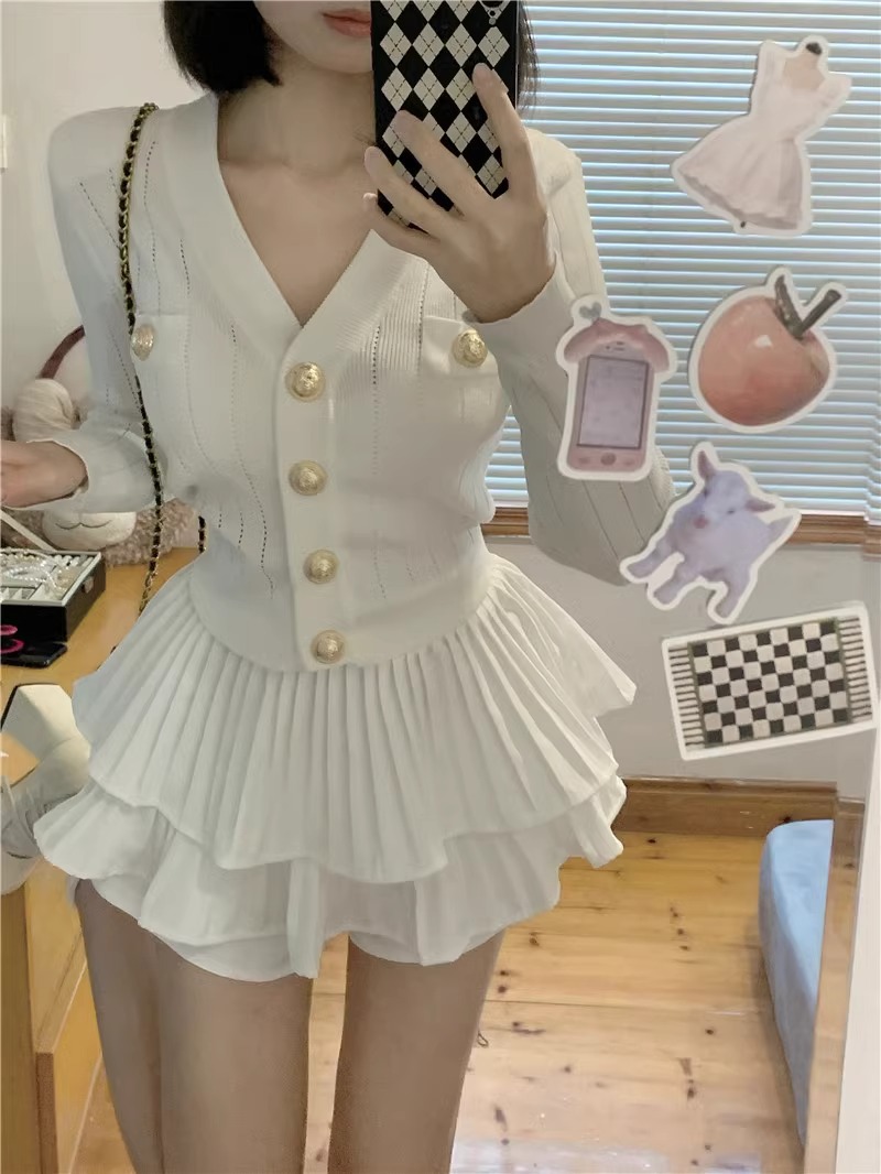샤넬 스타일 V 넥 슬림 핏 긴팔 스웨터 Pleated 케이크 스커트 여성 가을 새 발레 스타일 투피스 세트