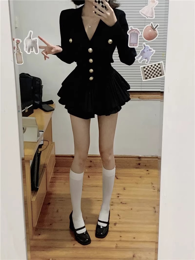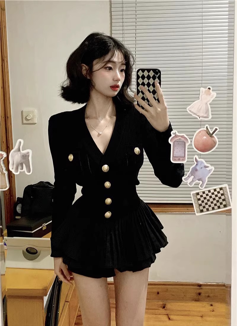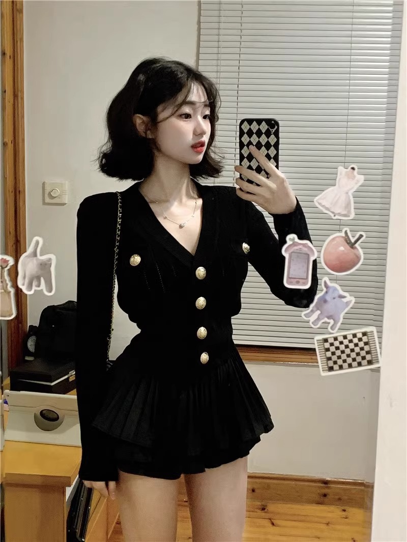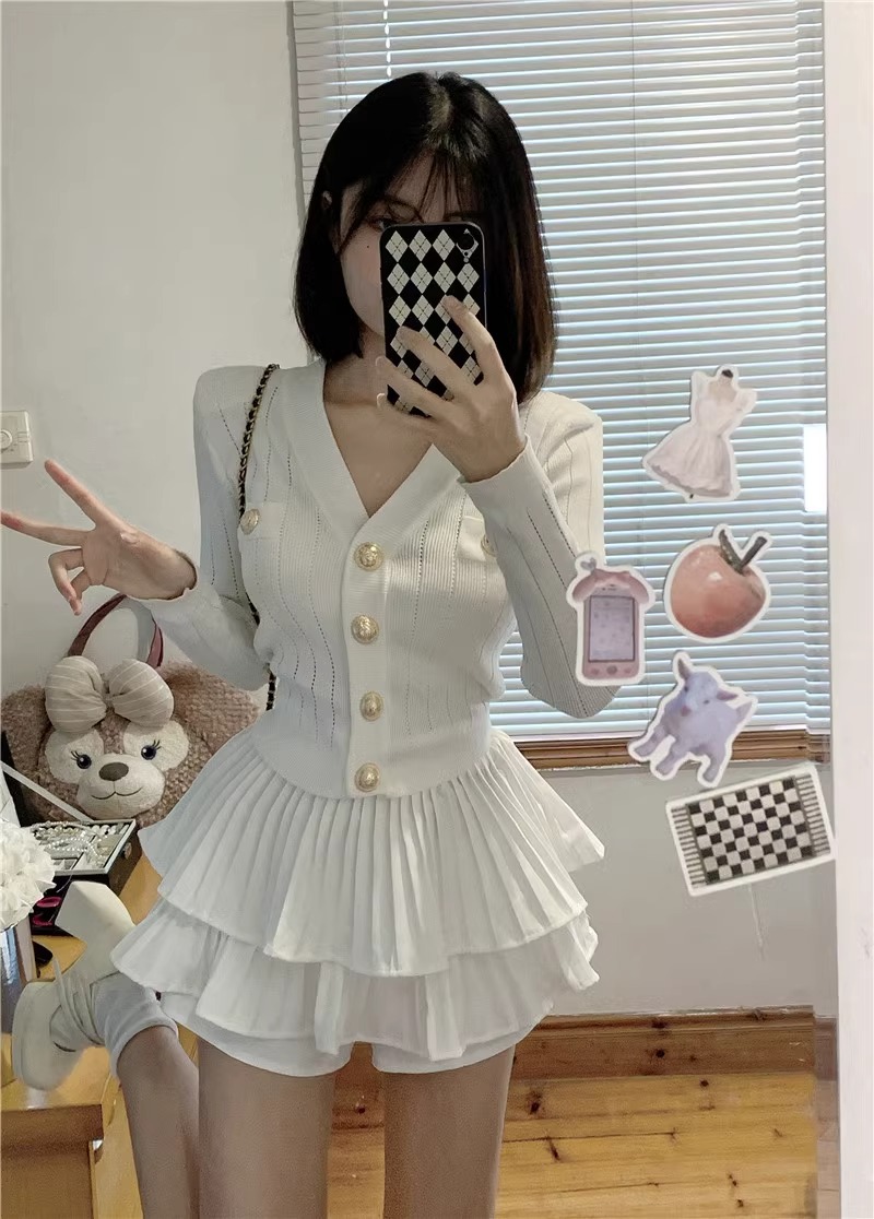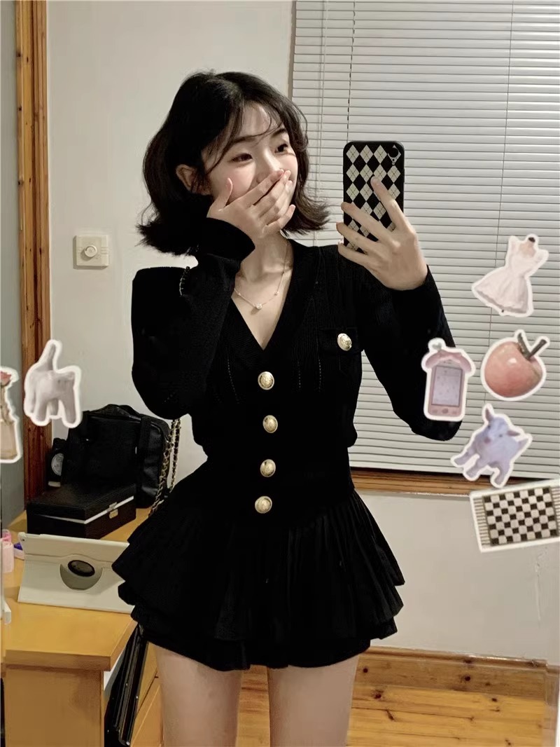 샤넬 스타일 V 넥 슬림 핏 긴팔 스웨터 Pleated 케이크 스커트 여성 가을 새 발레 스타일 투피스 세트스토어 가기
