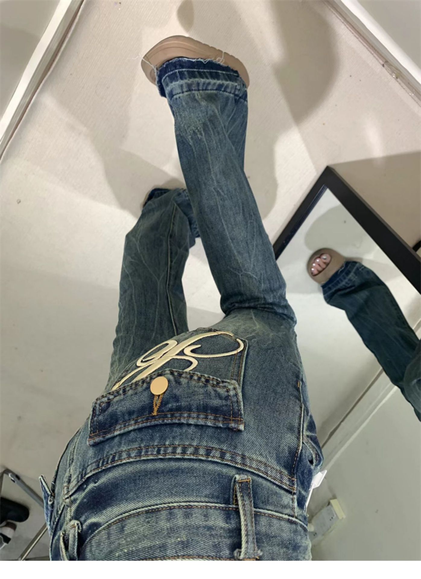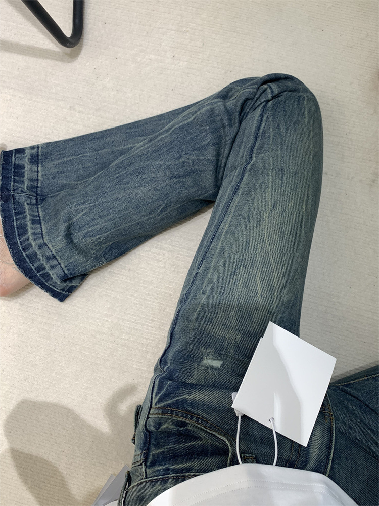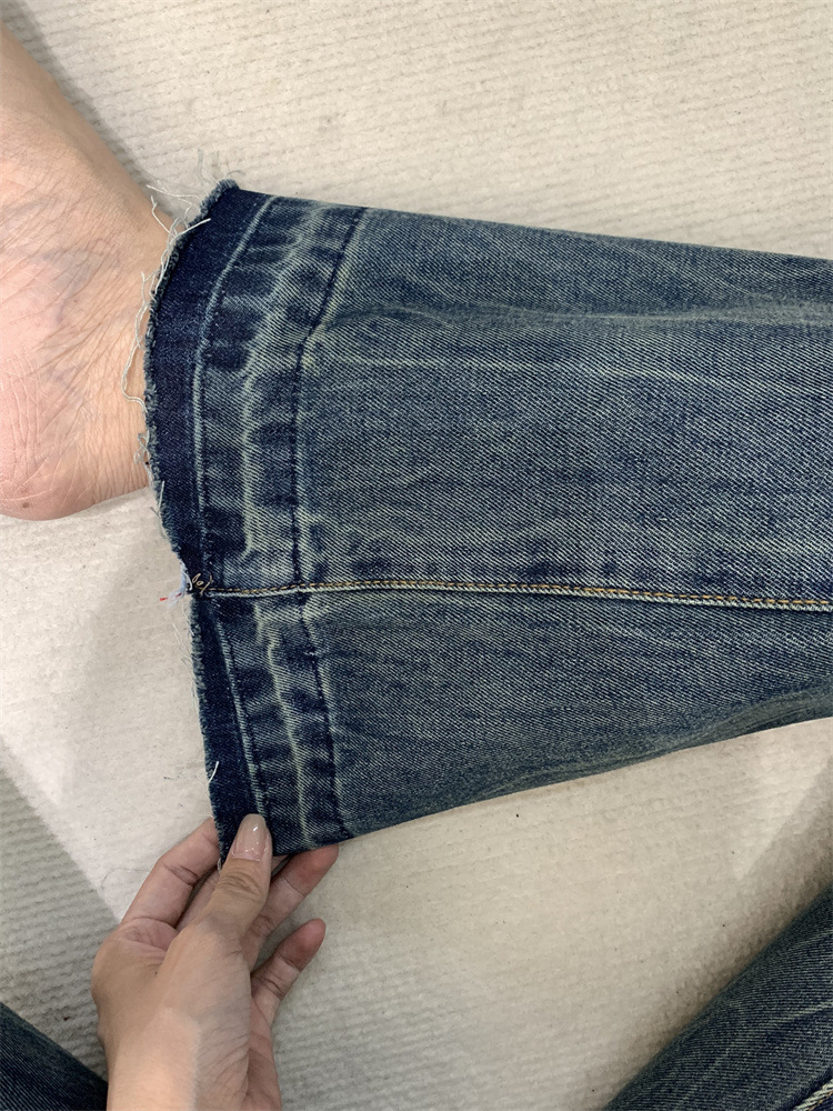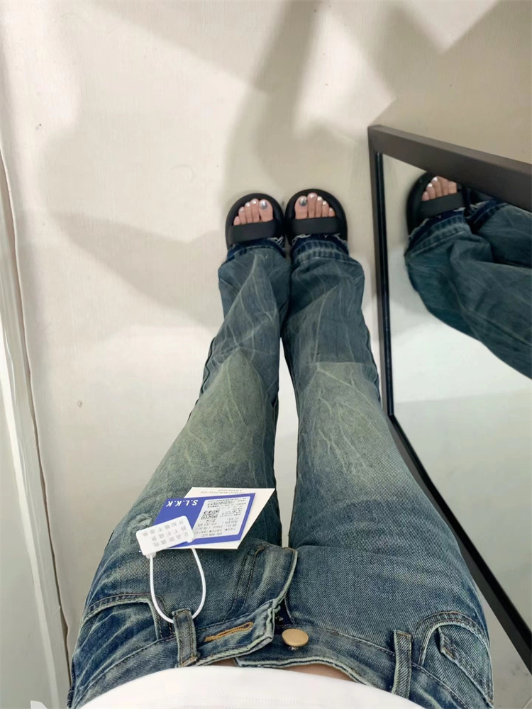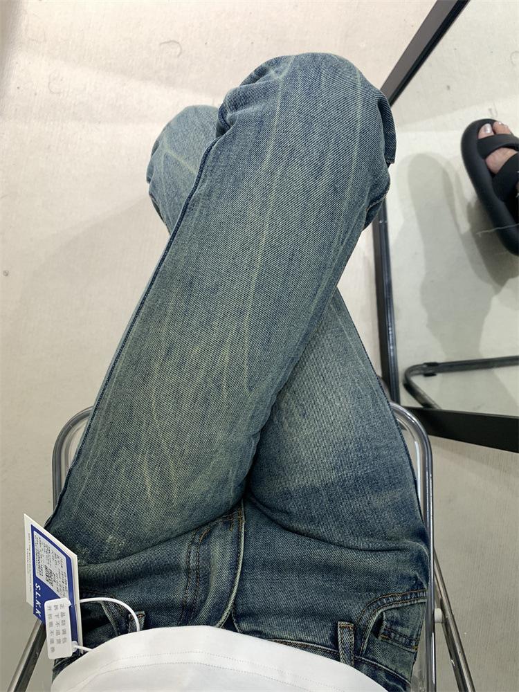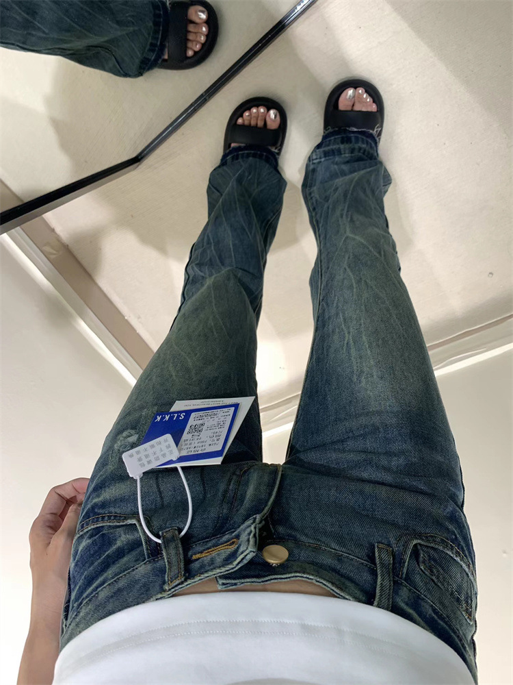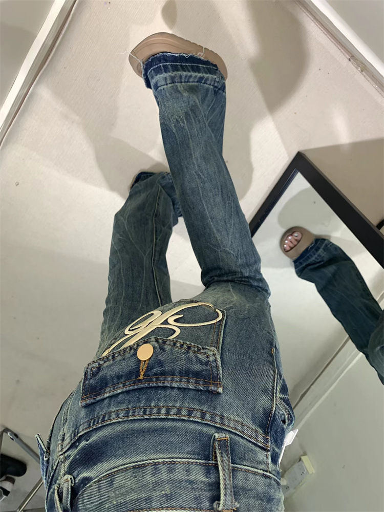 2026년 봄/가을 레트로 블루 뒷면 자수 플레어 진, 아메리칸 하이 스트리트 스타일, 신축성 있는 마이크로 플레어, 여성용 하이웨이스트 슬림핏스토어 가기