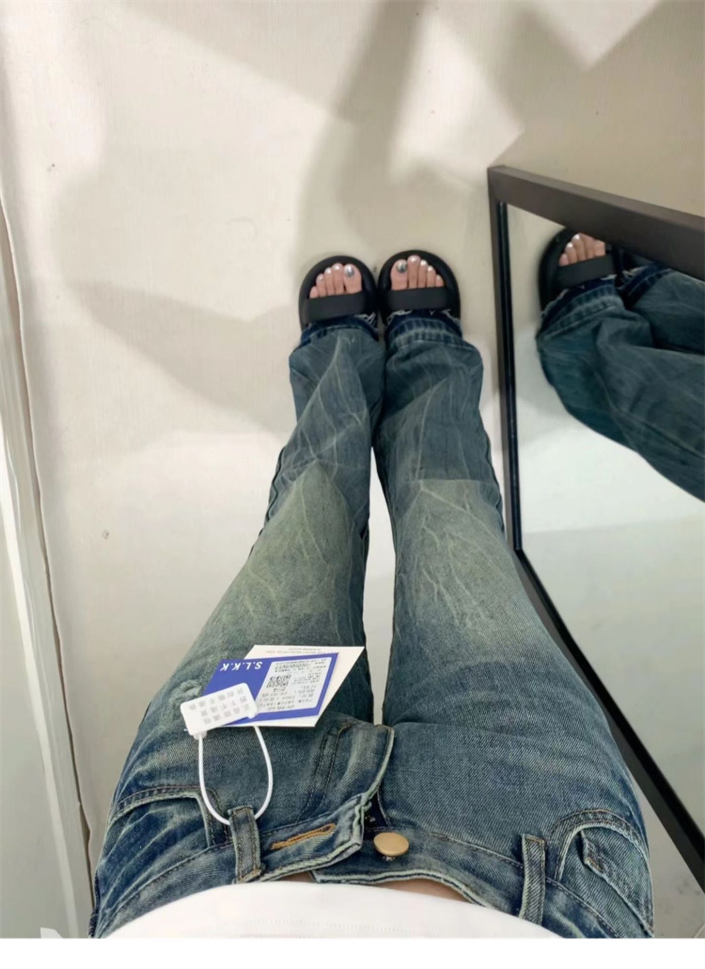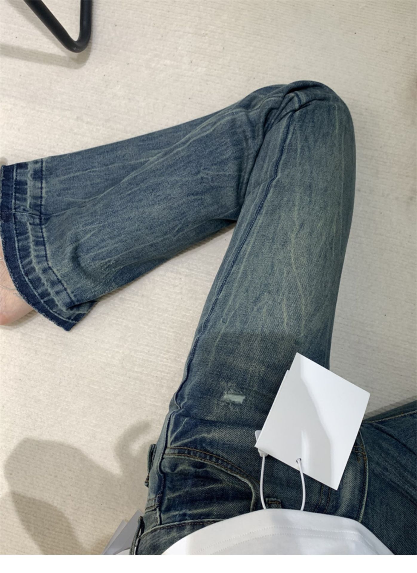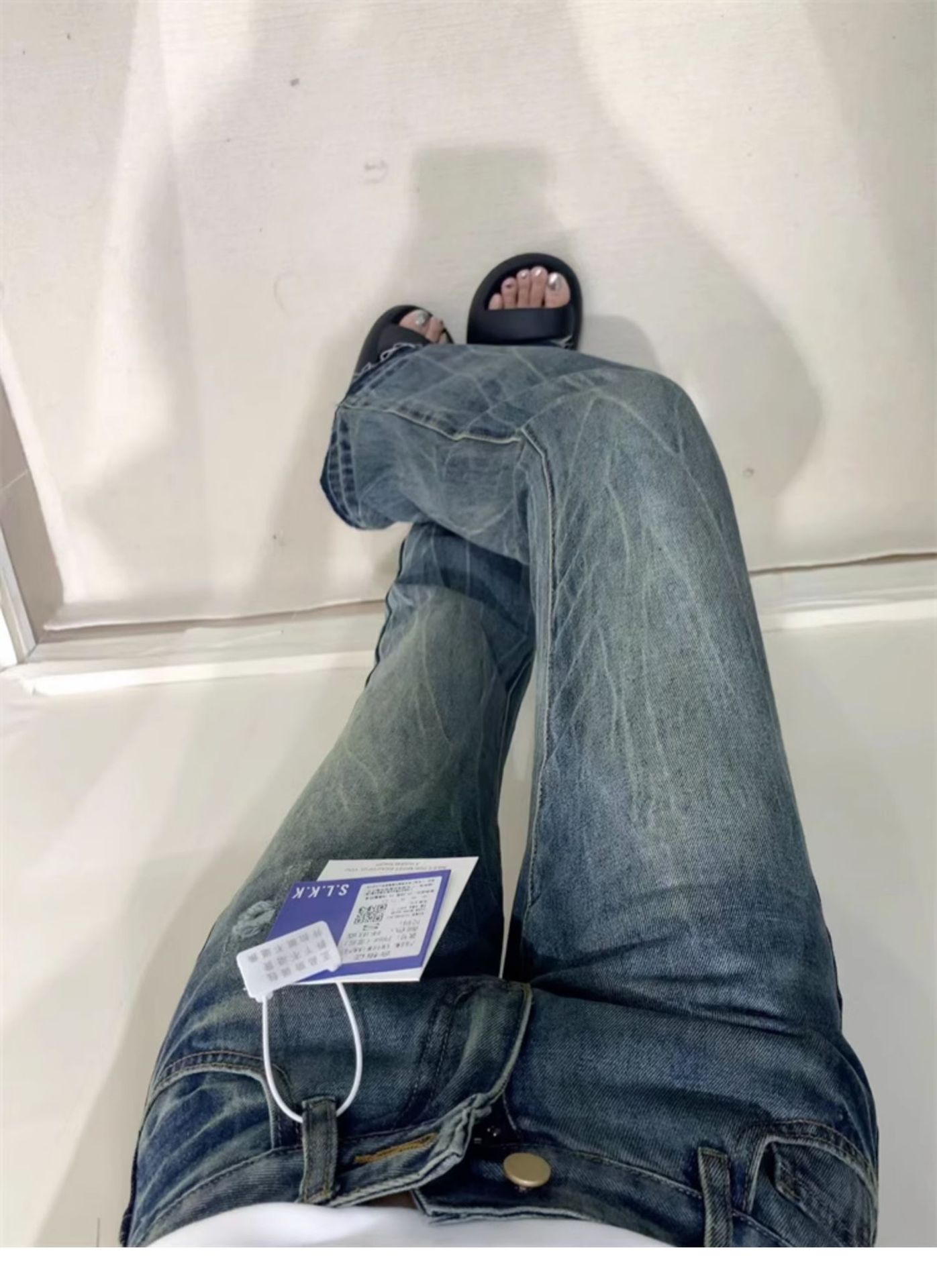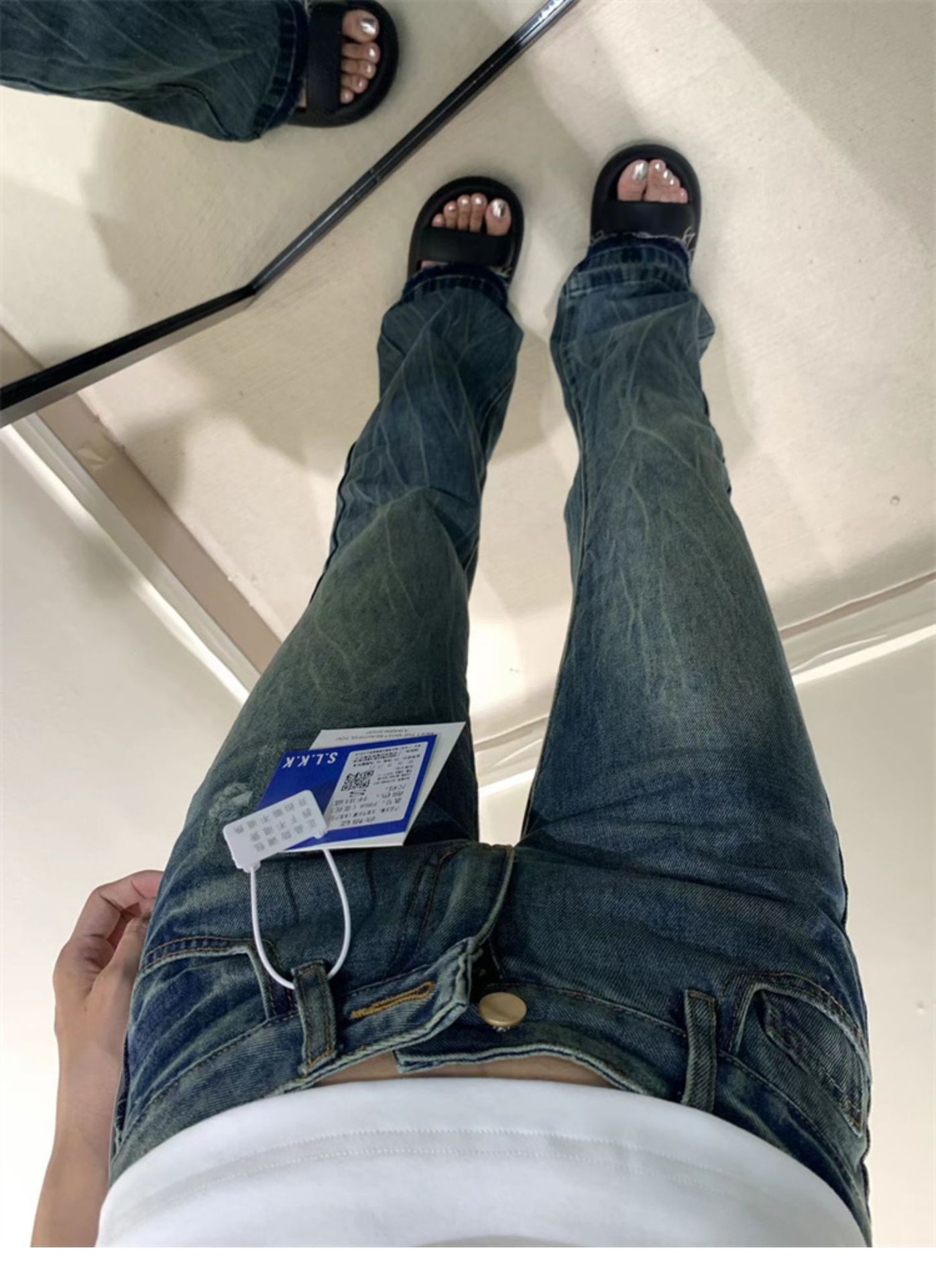 2026년 봄/가을 레트로 블루 뒷면 자수 플레어 진, 아메리칸 하이 스트리트 스타일, 신축성 있는 마이크로 플레어, 여성용 하이웨이스트 슬림핏스토어 가기