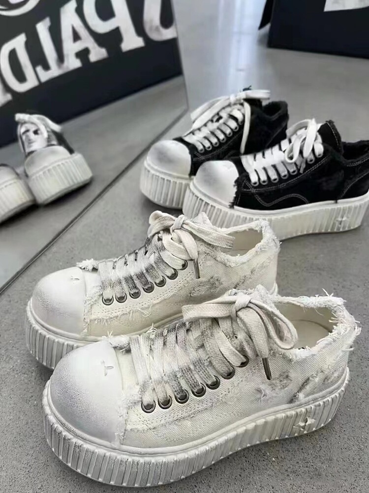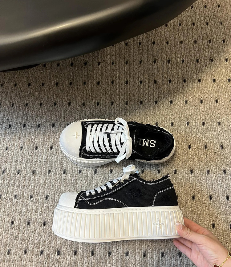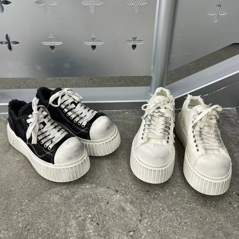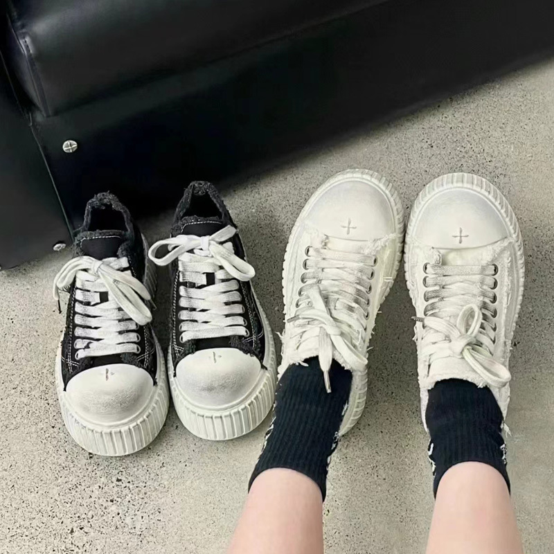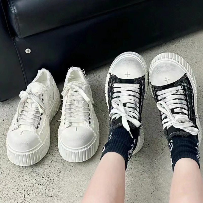 2024 신형 스트로보 스케이트보드 슈즈, 크로스 플라워 스니커즈, 여성화, 화이트 슈즈, 두꺼운 밑창 캔버스, 디스트레스드 스몰 더티 슈즈스토어 가기