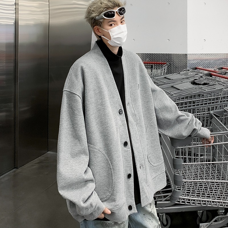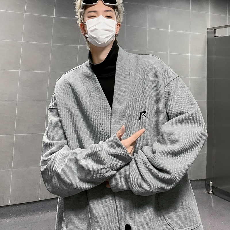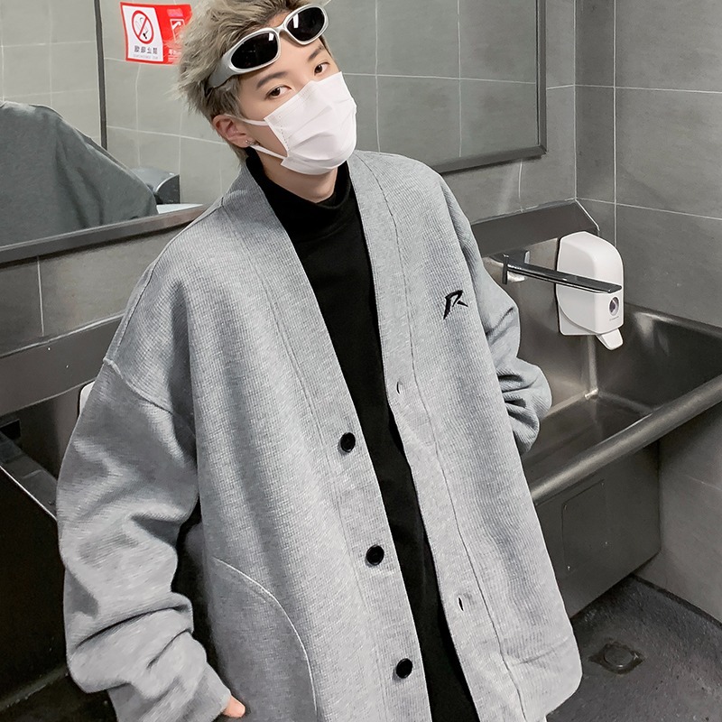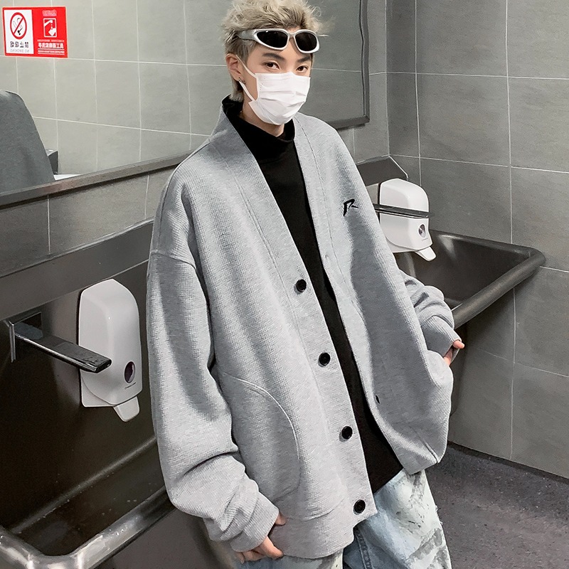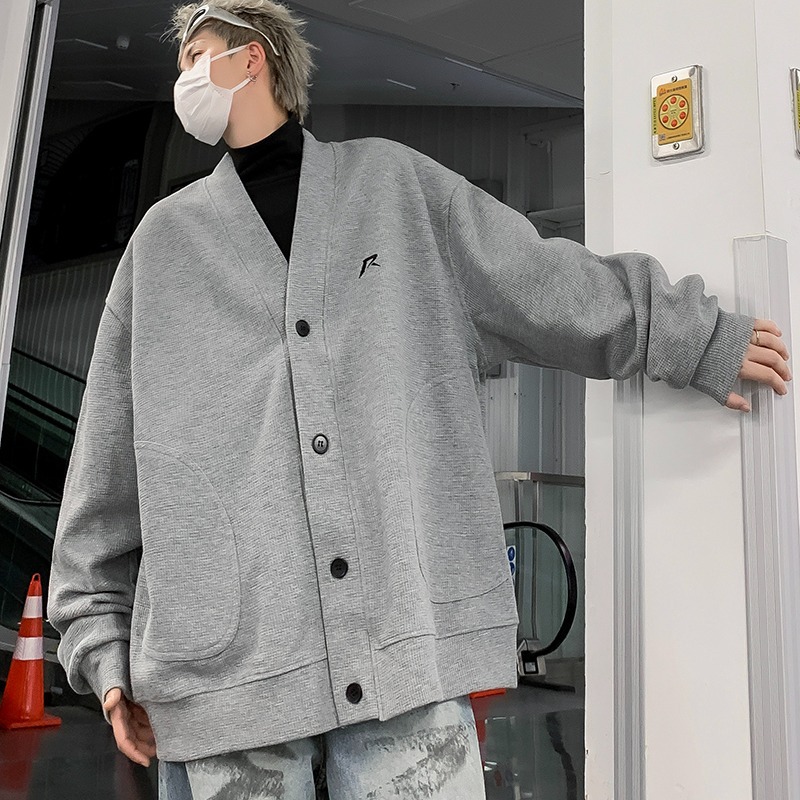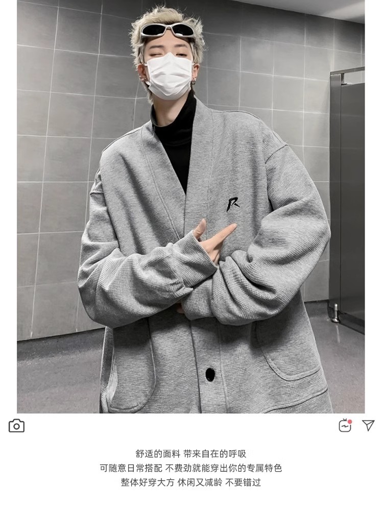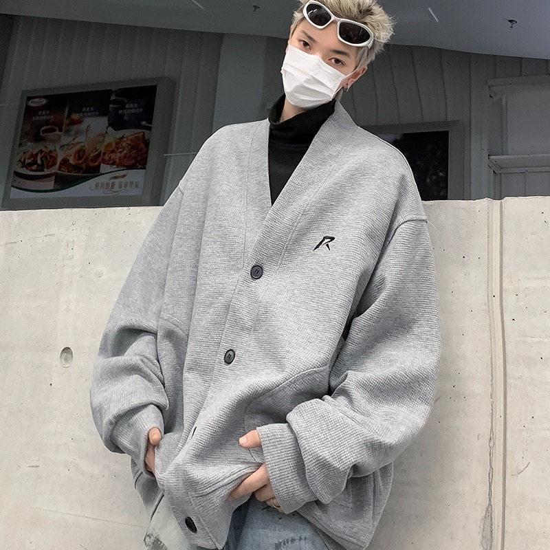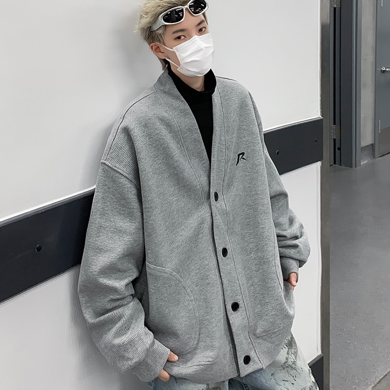미국 회색 카디건 스웨터 남성 봄과 가을 2024 새로운 러피 잘 생긴 느슨한 편지 작은 표준 디자인 v-neck 코트