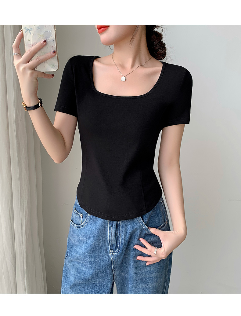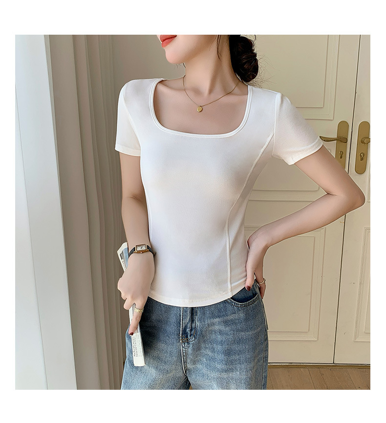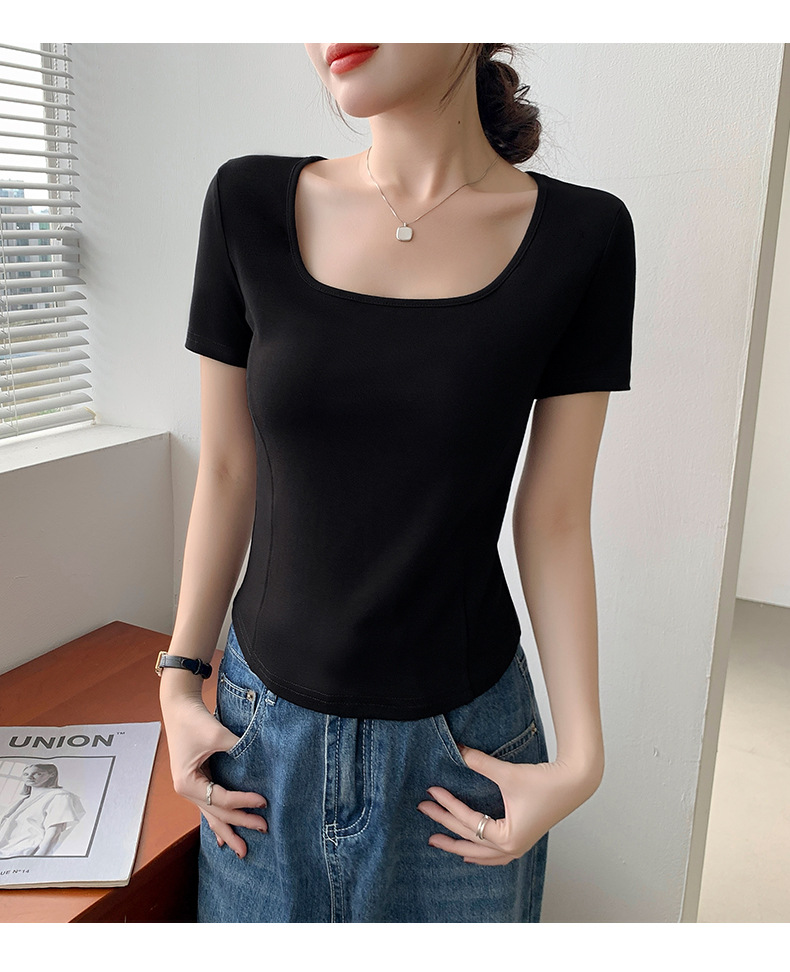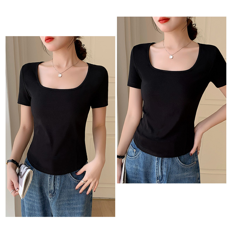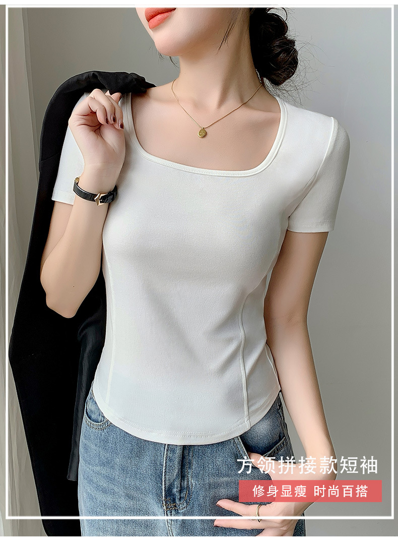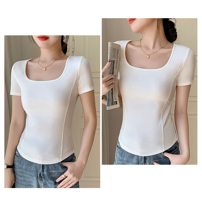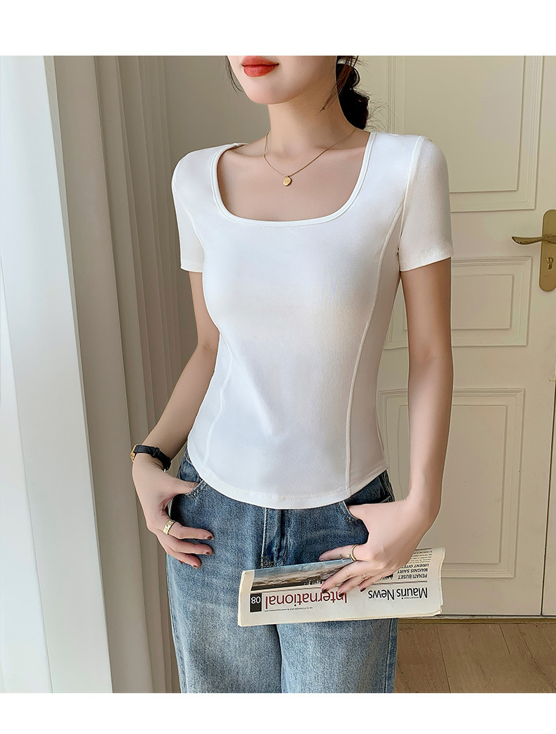 화이트 스퀘어 칼라 반팔 티셔츠 여성용 2024 년 여름 뉴 아치 커브 헴 슬림 룩 서양식 유행베이스 셔츠스토어 가기