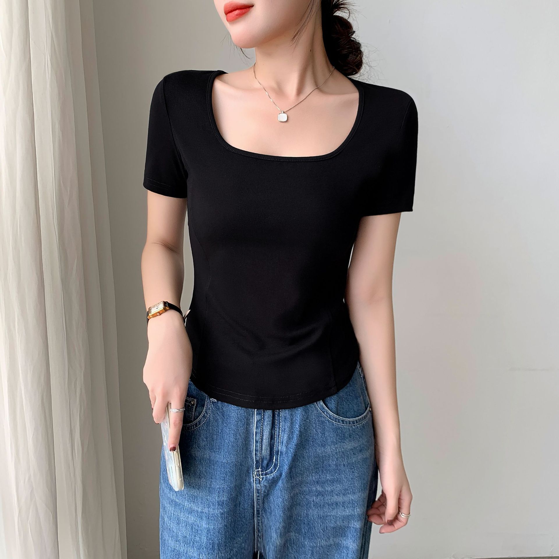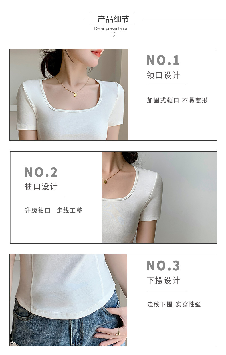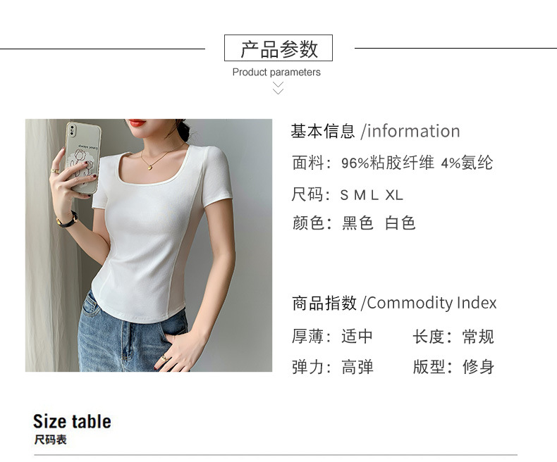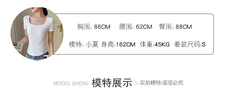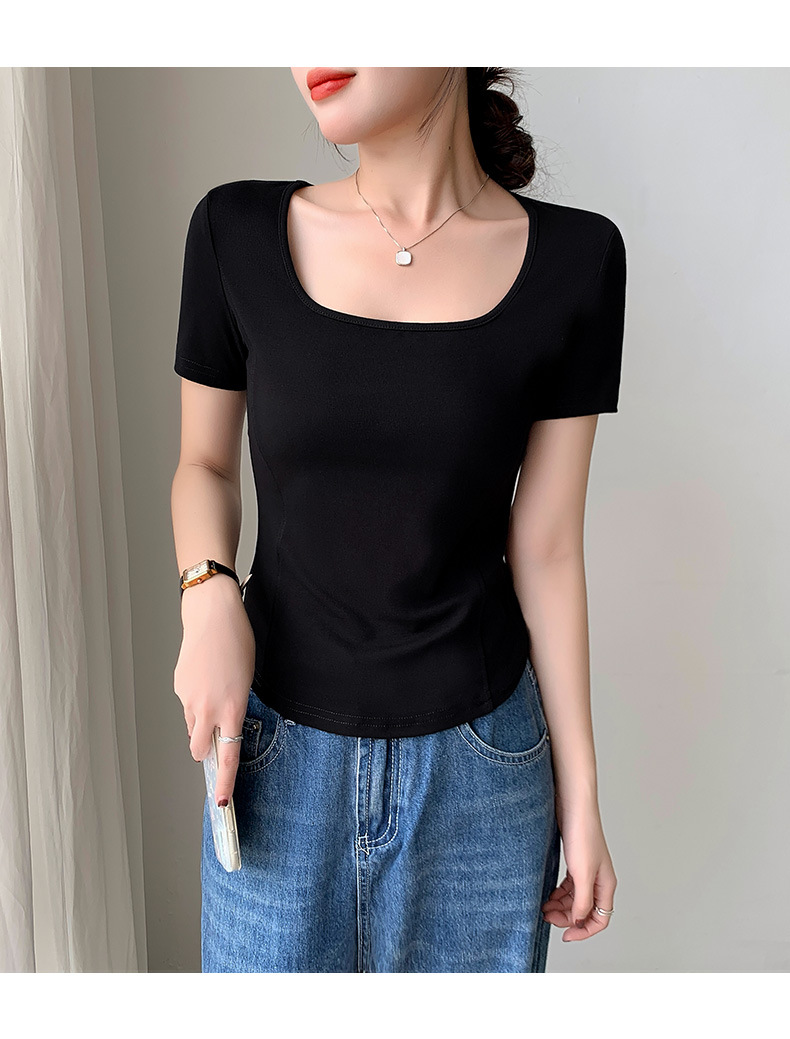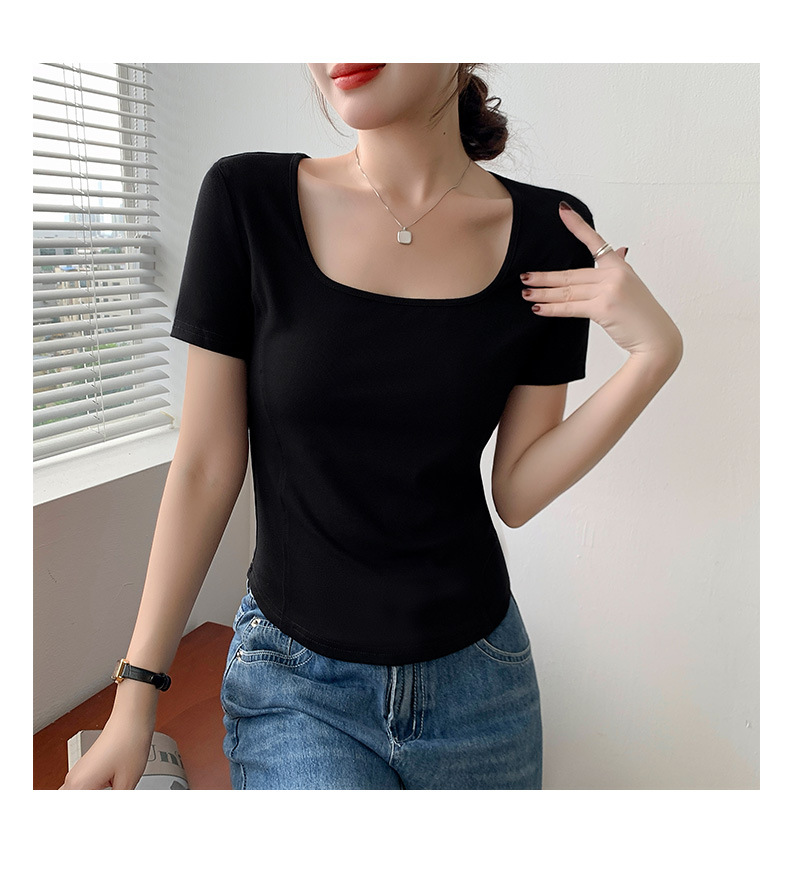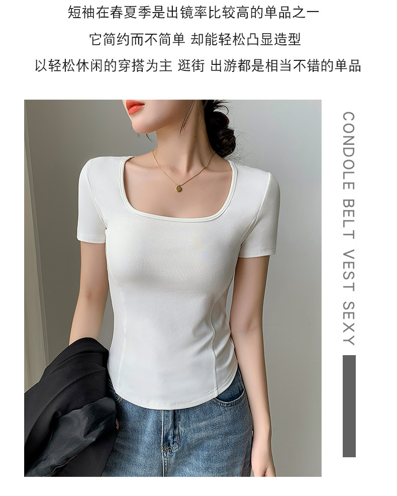 화이트 스퀘어 칼라 반팔 티셔츠 여성용 2024 년 여름 뉴 아치 커브 헴 슬림 룩 서양식 유행베이스 셔츠스토어 가기