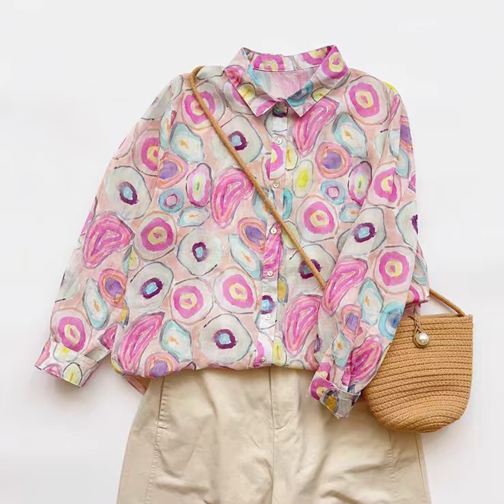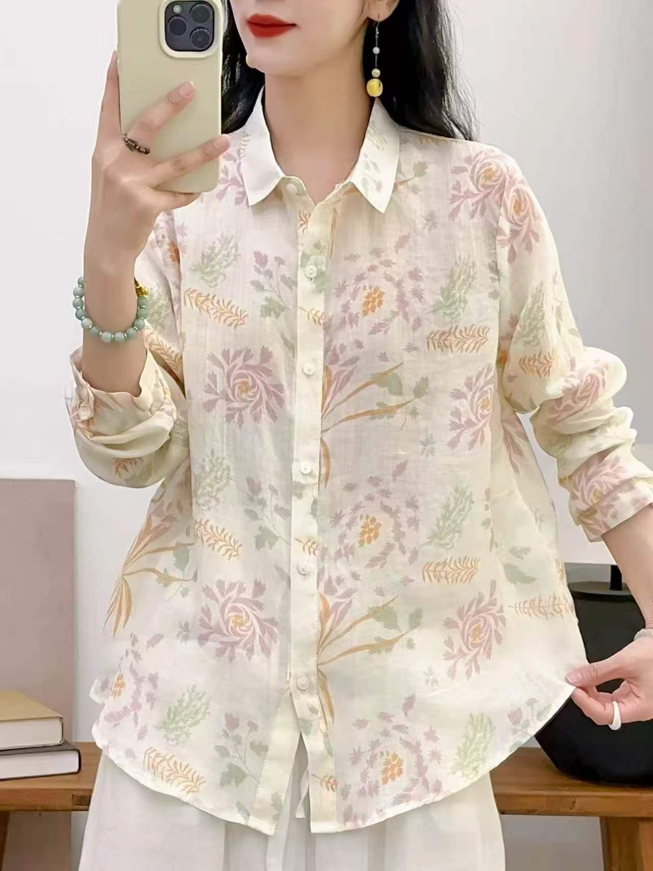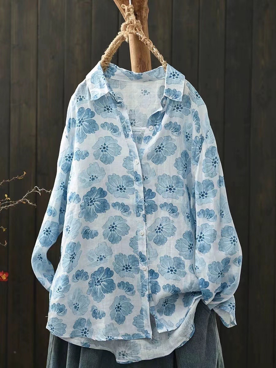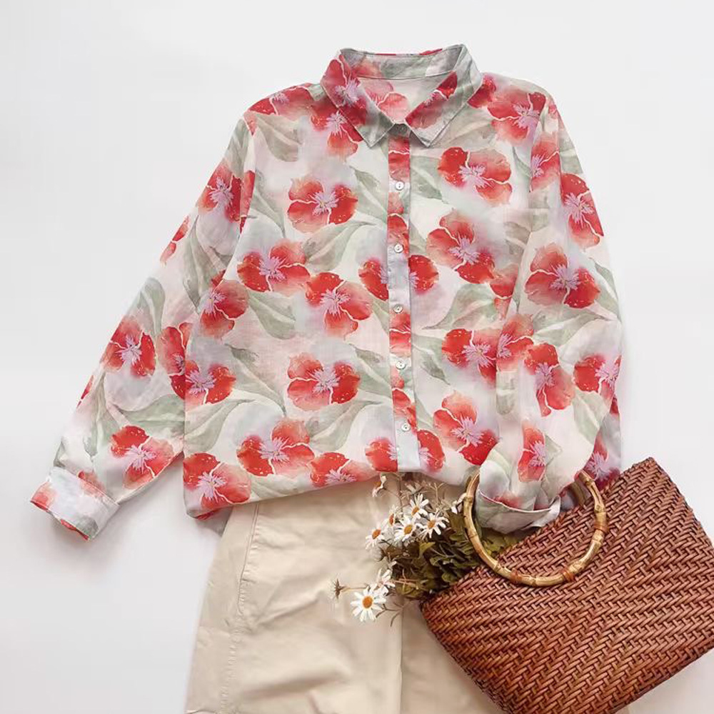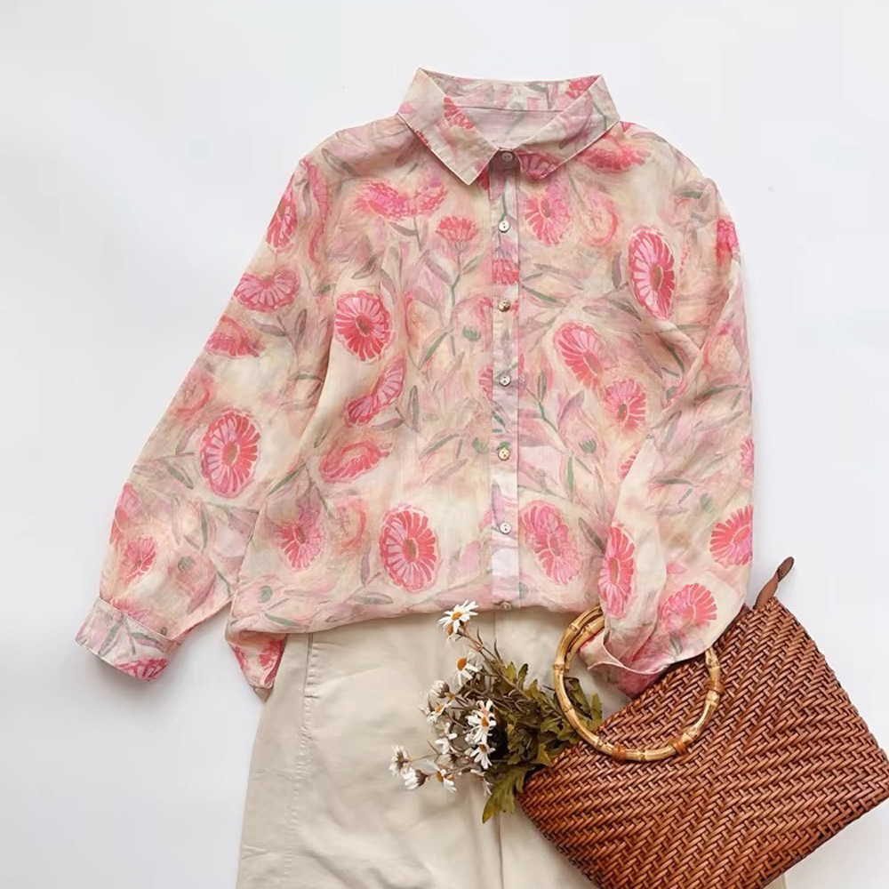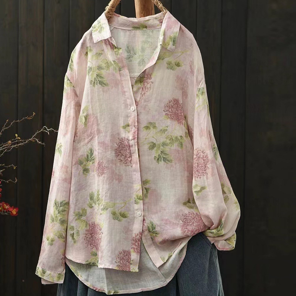 2026 신상 도매 모리걸 스타일 린넨 프린트 셔츠 긴팔 여성용 라펠 플로럴 탑 베이스 레이어 상의스토어 가기