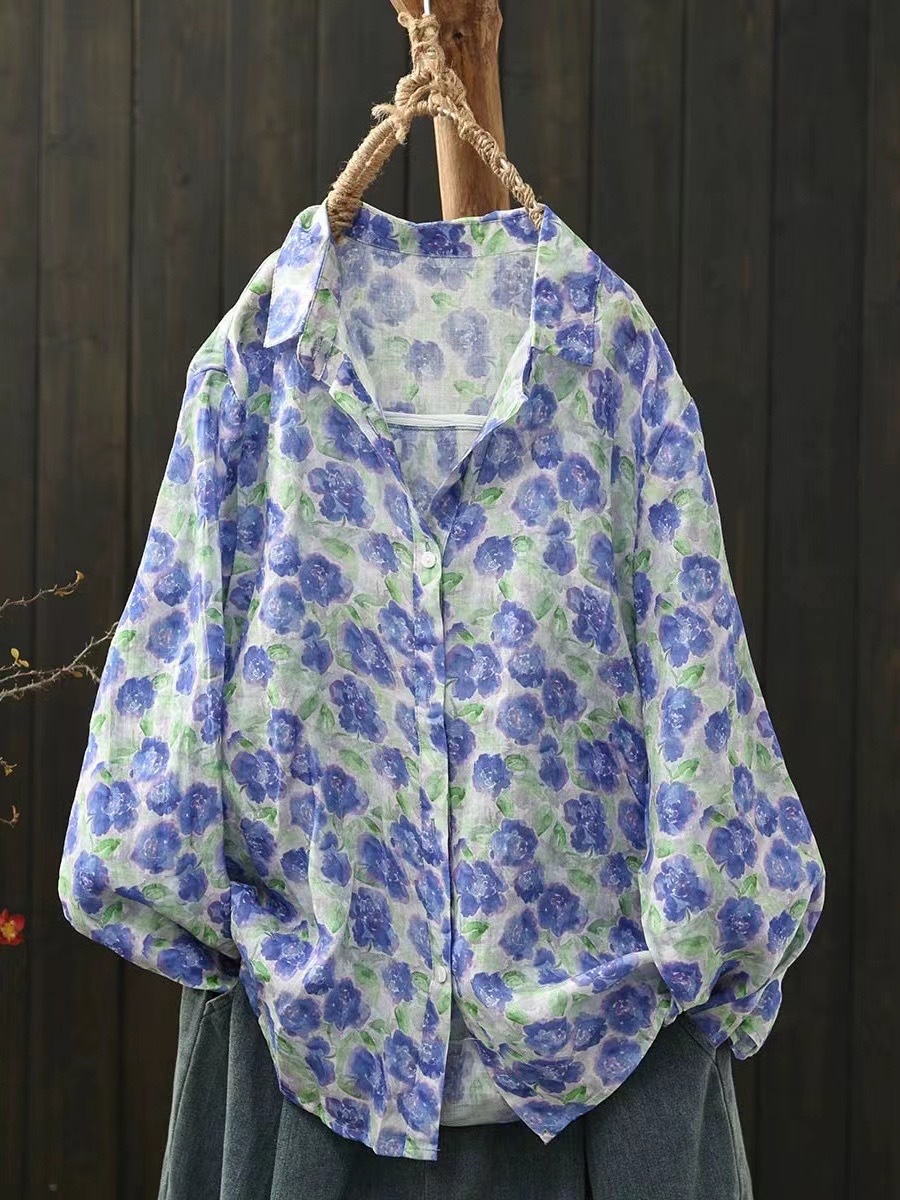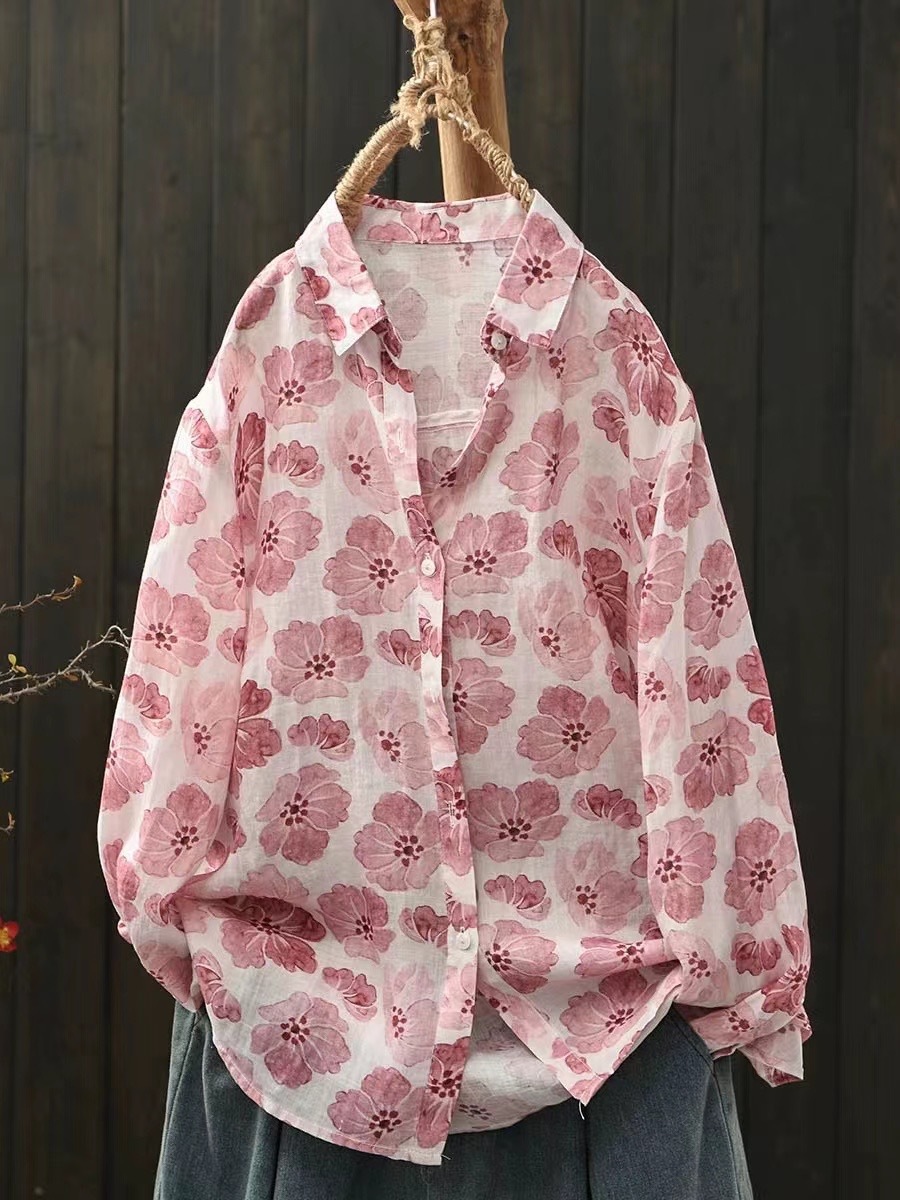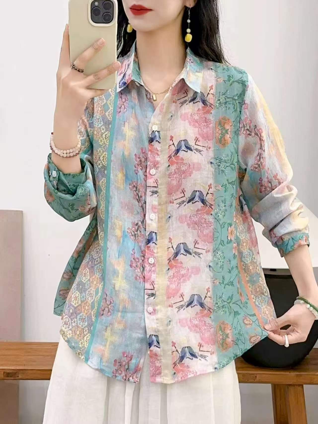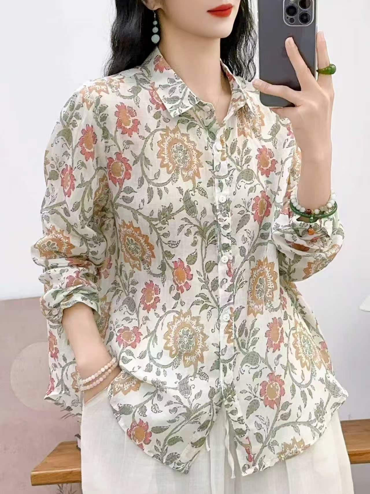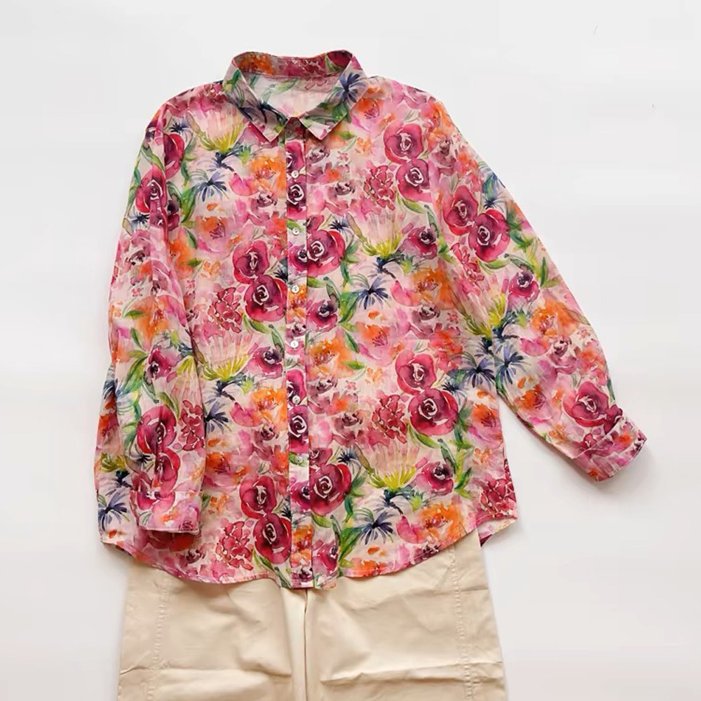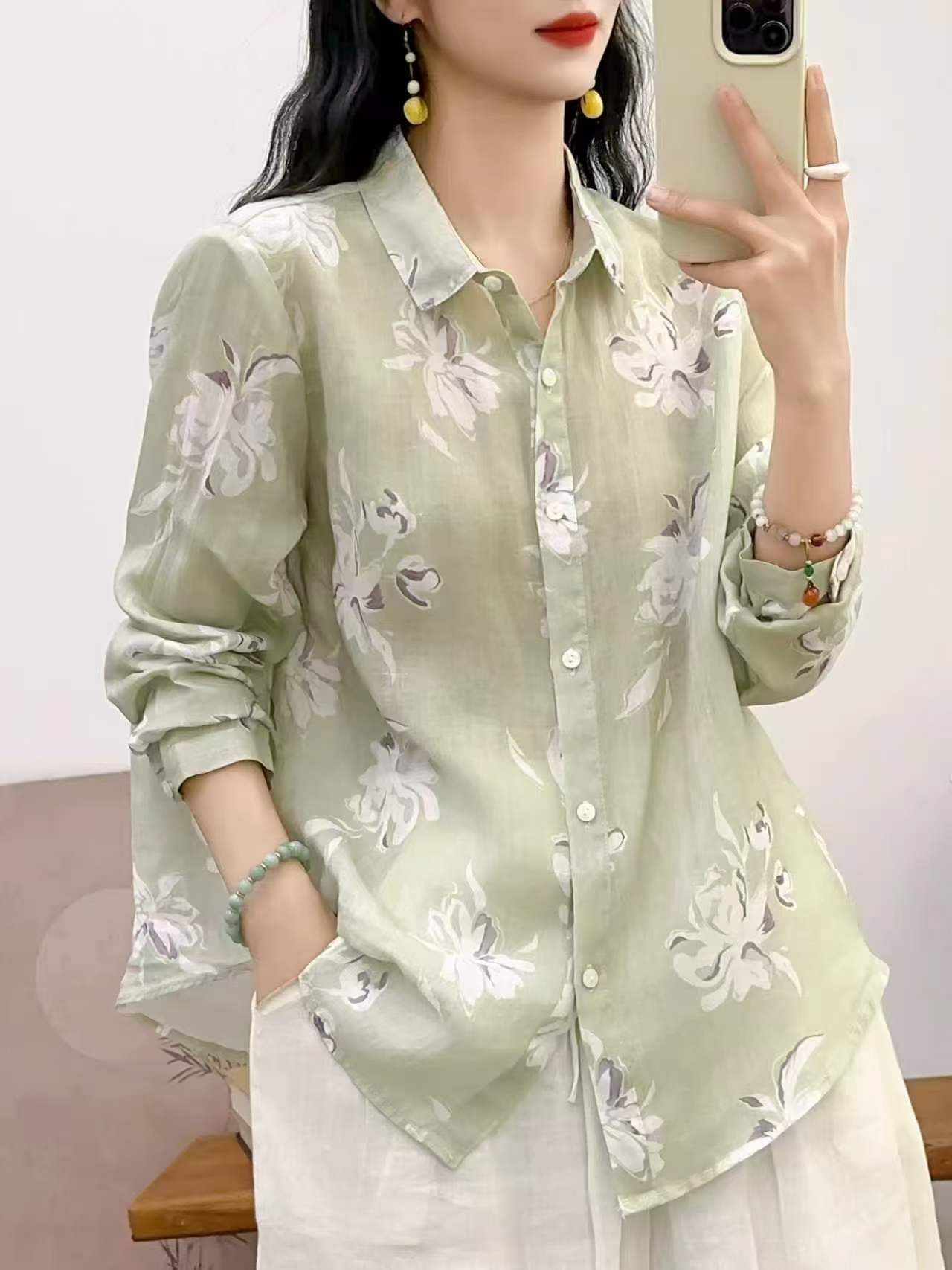 2026 신상 도매 모리걸 스타일 린넨 프린트 셔츠 긴팔 여성용 라펠 플로럴 탑 베이스 레이어 상의스토어 가기