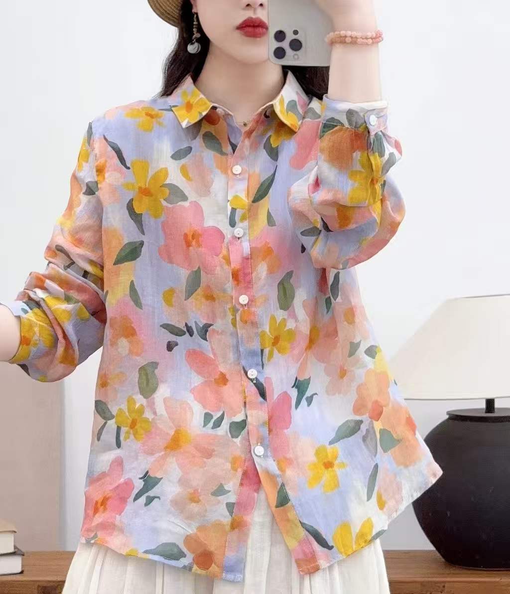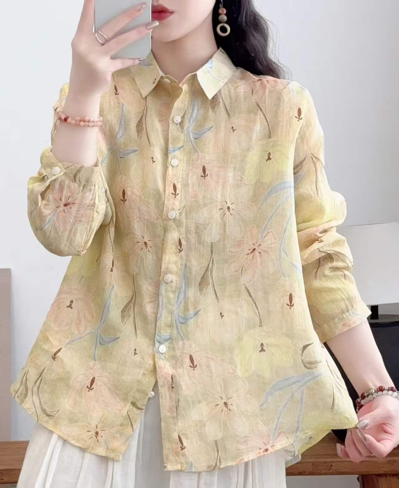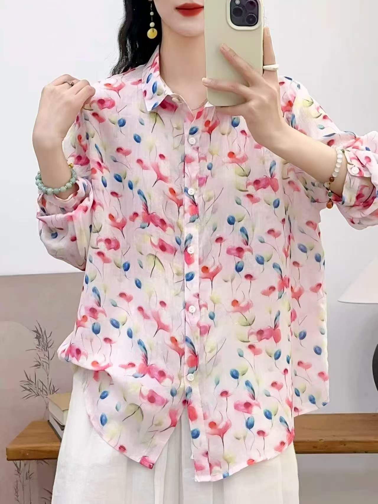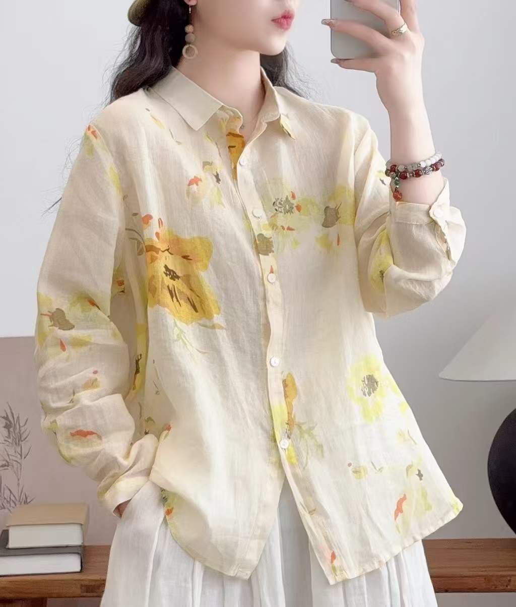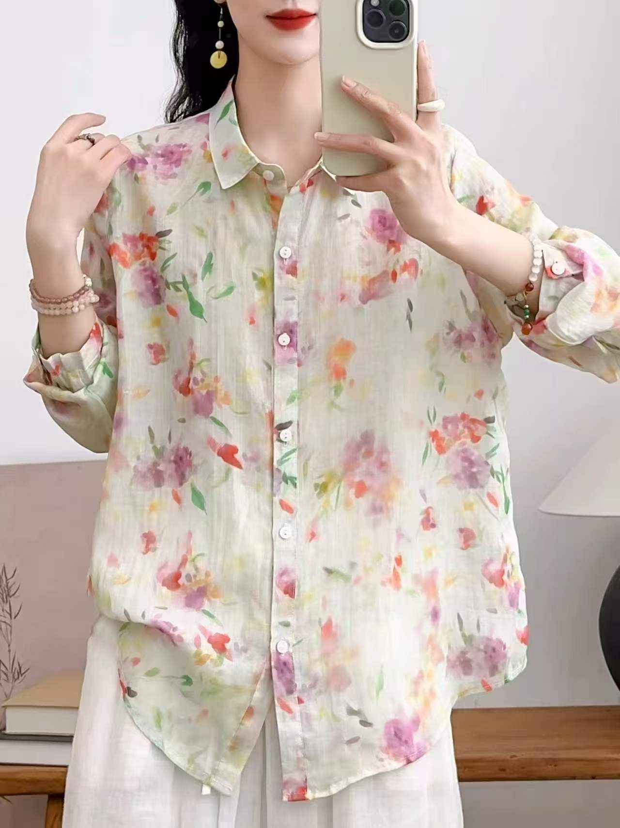 2026 신상 도매 모리걸 스타일 린넨 프린트 셔츠 긴팔 여성용 라펠 플로럴 탑 베이스 레이어 상의스토어 가기