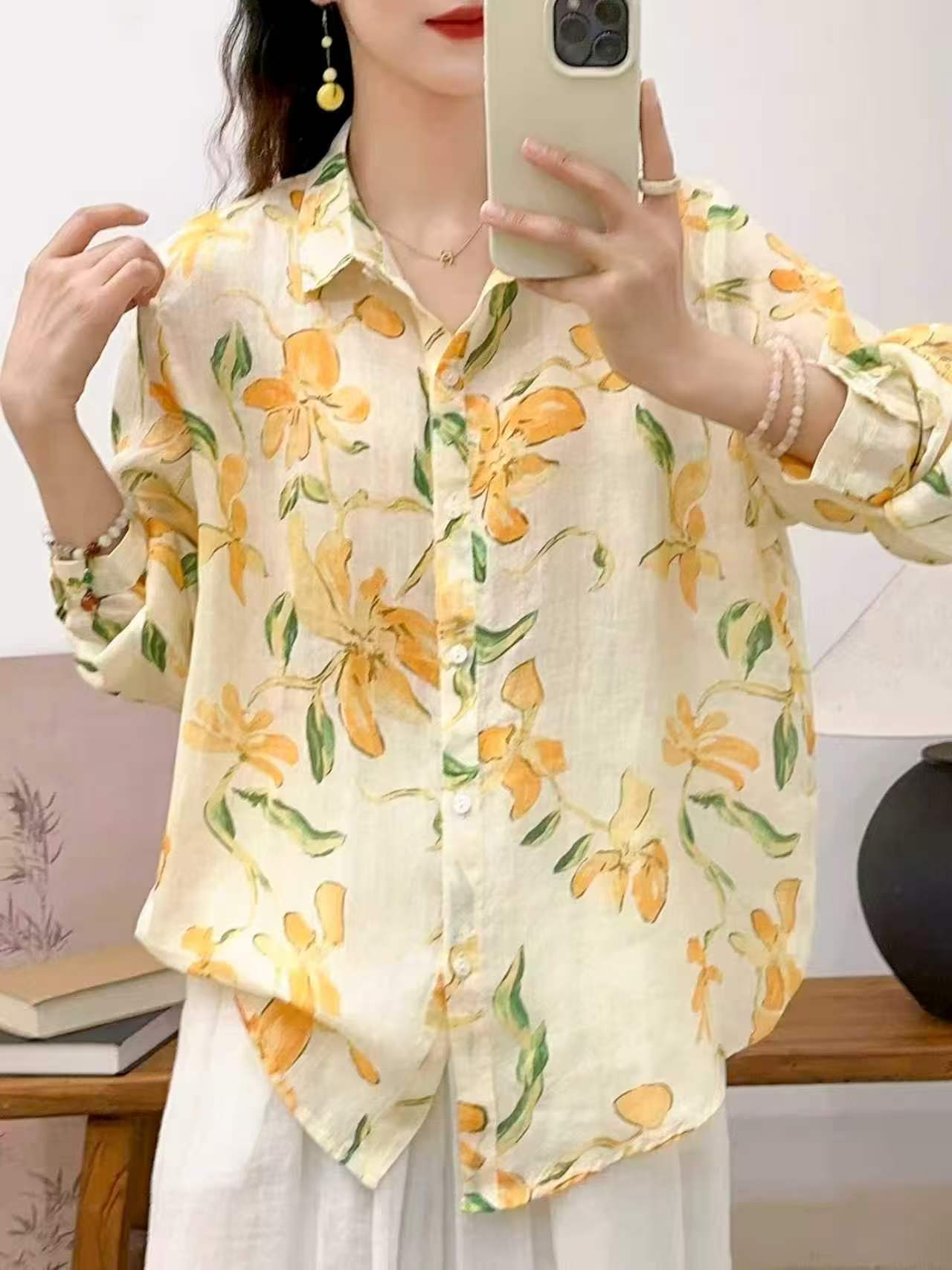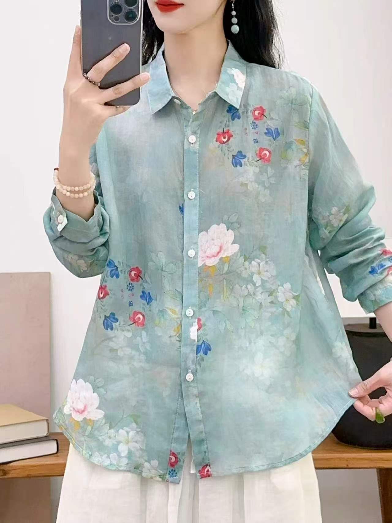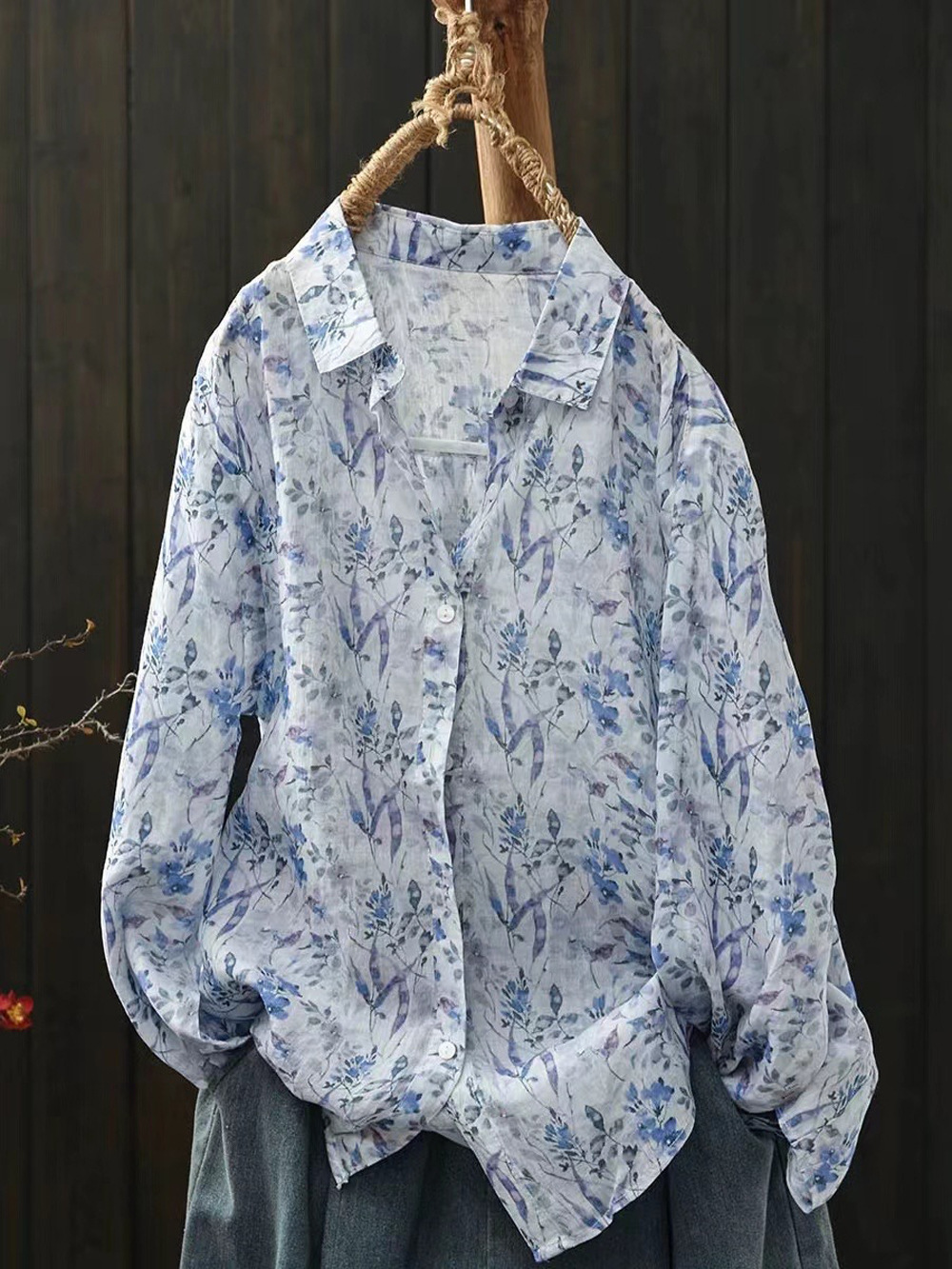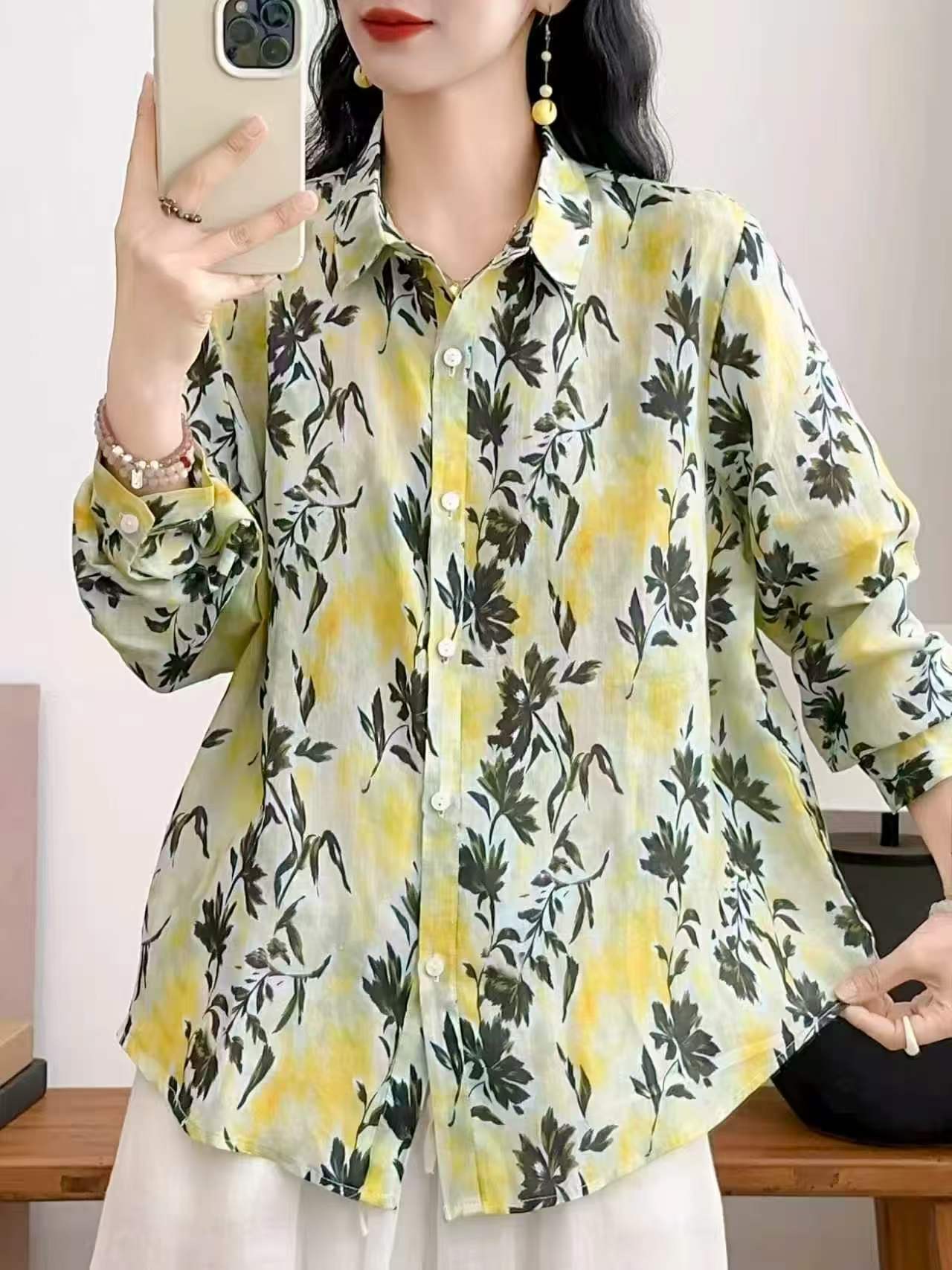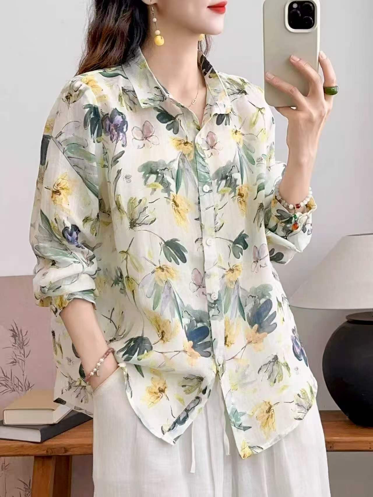 2026 신상 도매 모리걸 스타일 린넨 프린트 셔츠 긴팔 여성용 라펠 플로럴 탑 베이스 레이어 상의스토어 가기