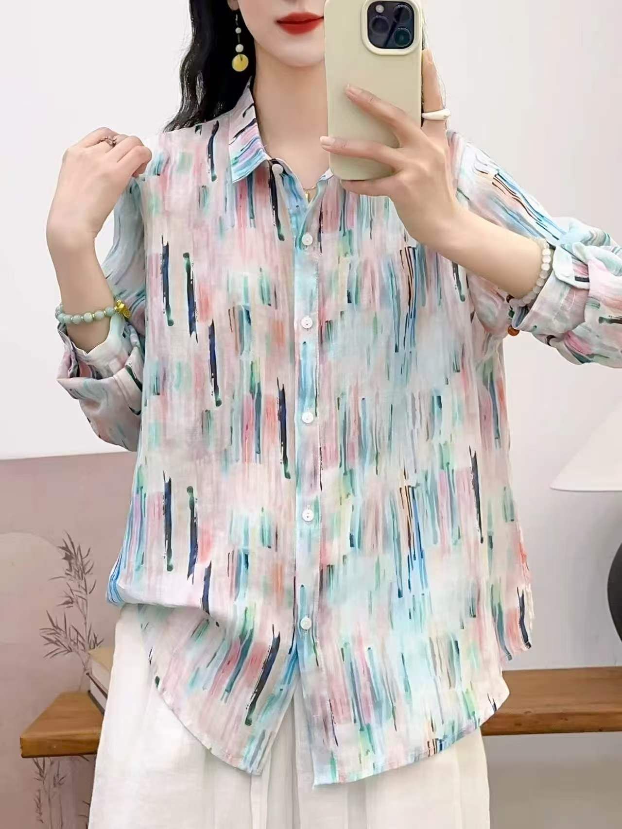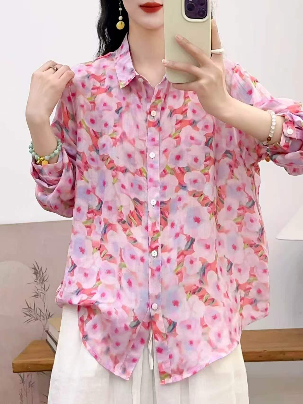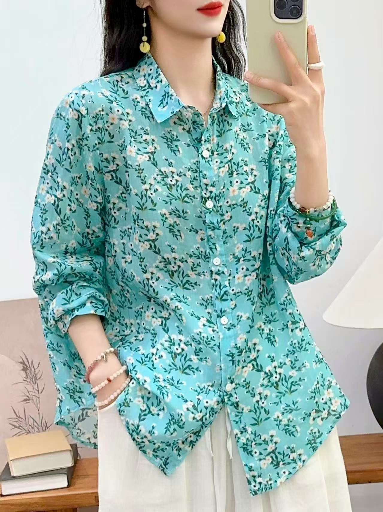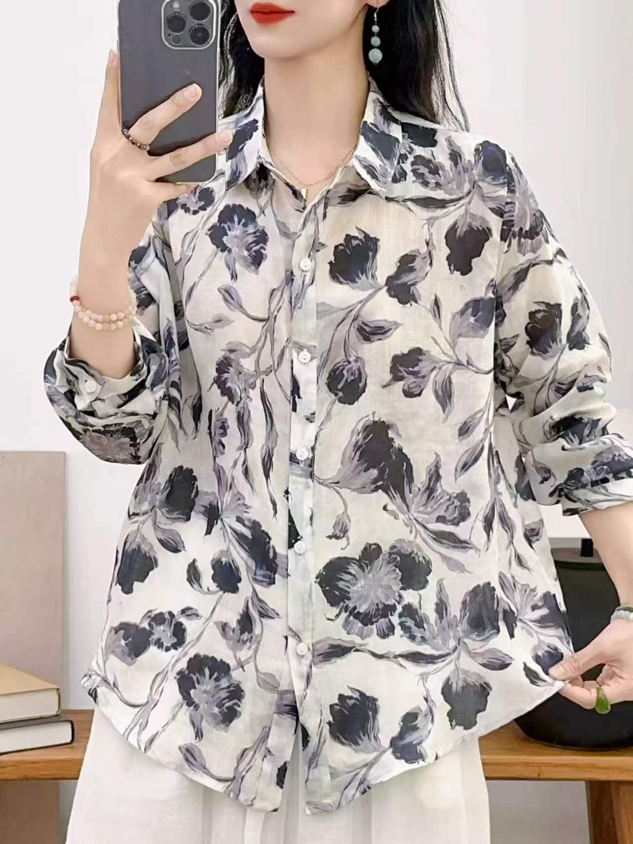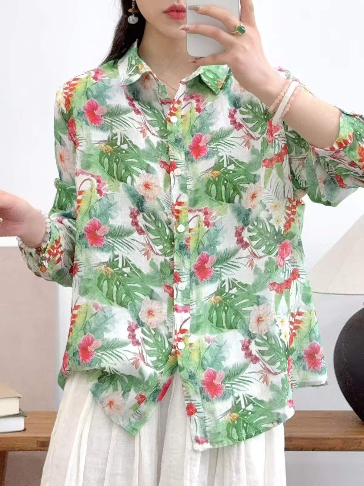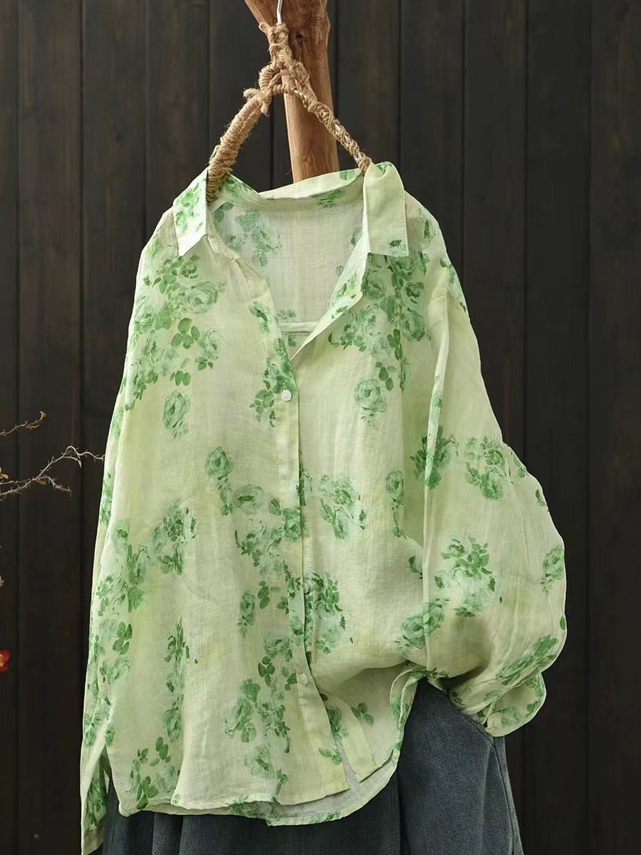 2026 신상 도매 모리걸 스타일 린넨 프린트 셔츠 긴팔 여성용 라펠 플로럴 탑 베이스 레이어 상의스토어 가기