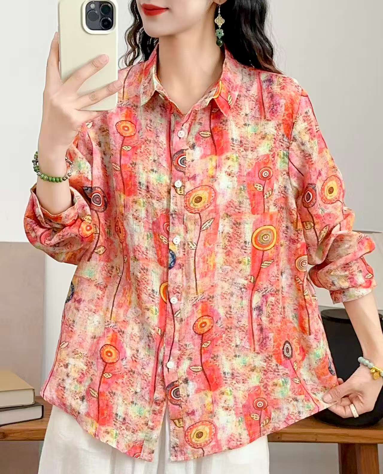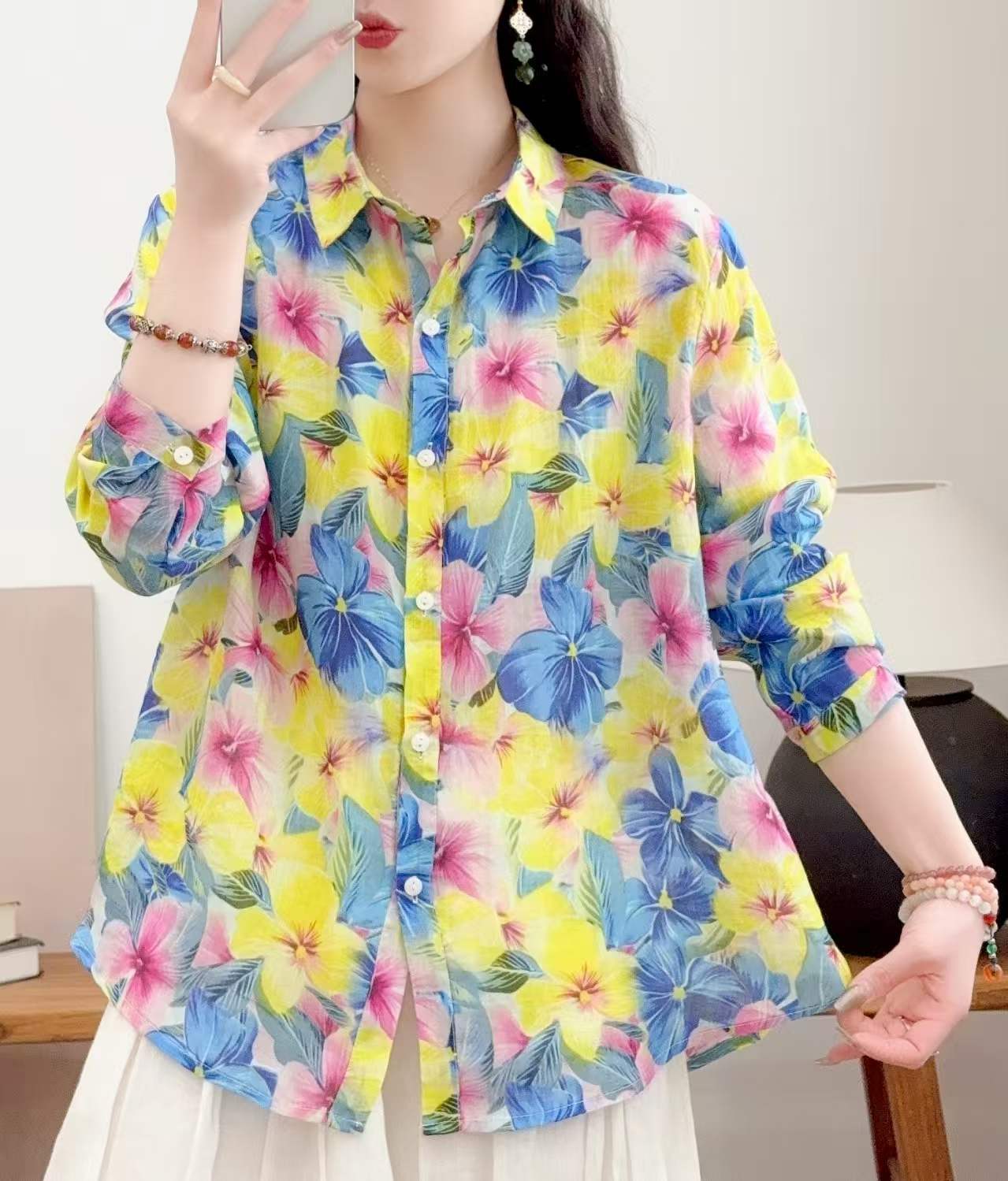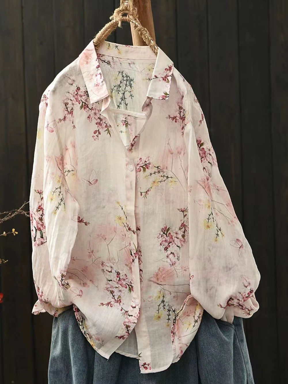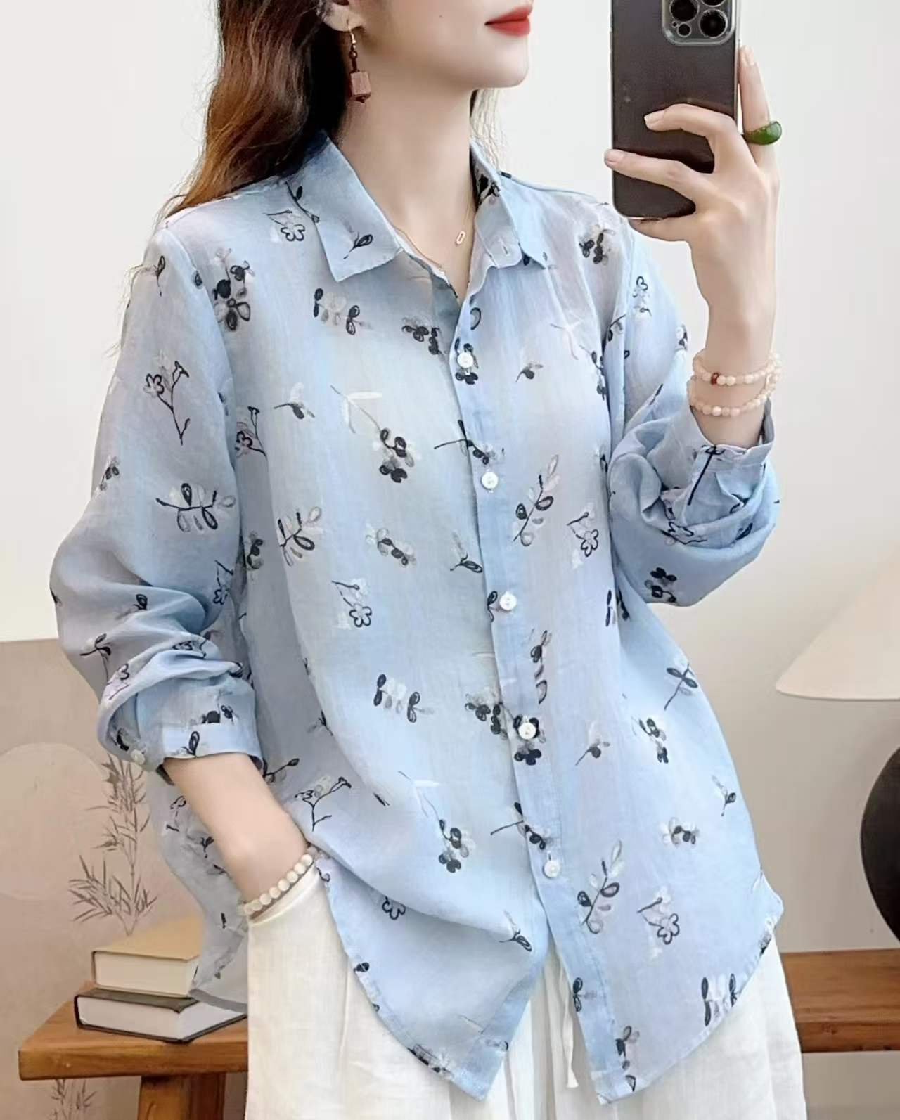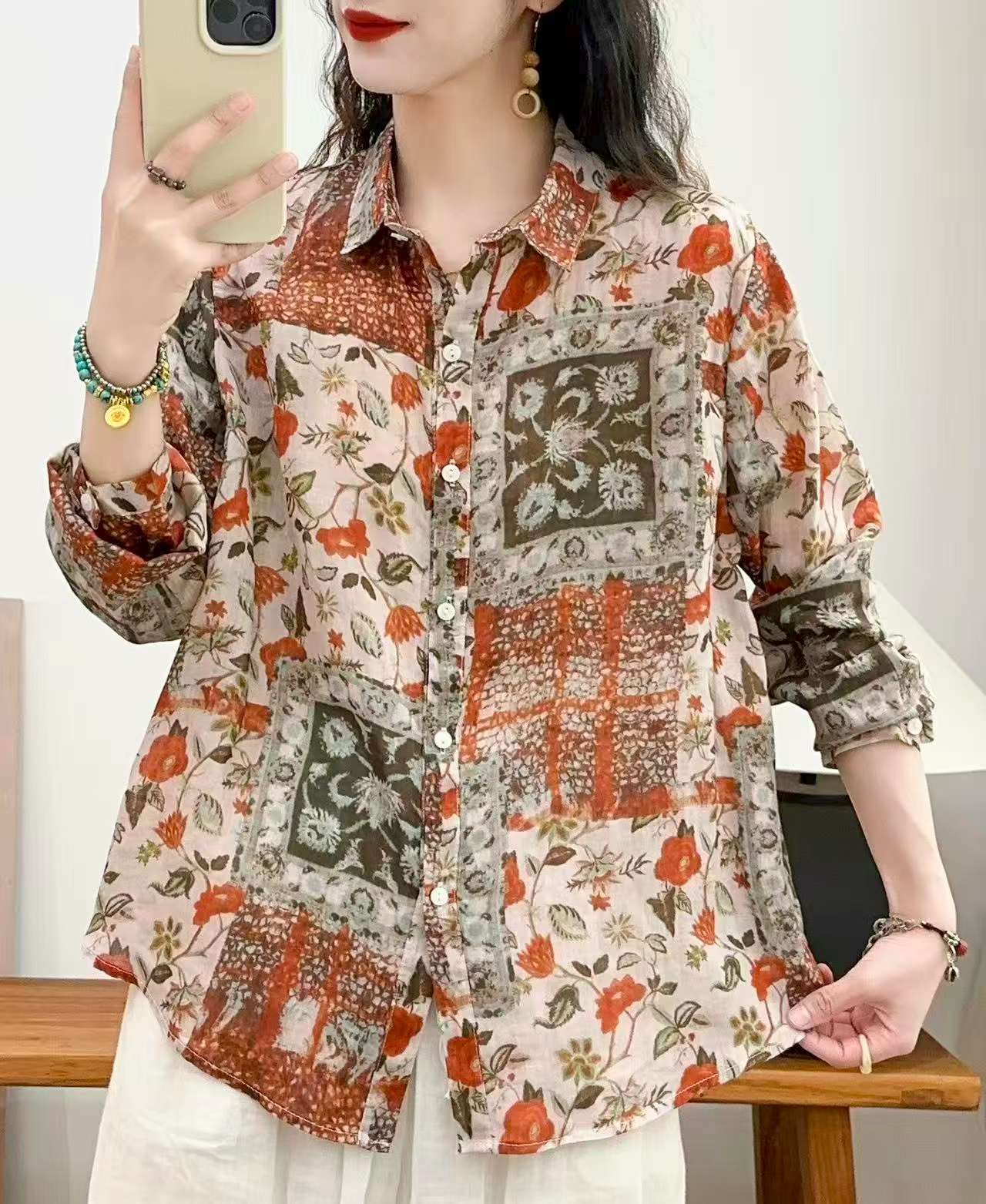 2026 신상 도매 모리걸 스타일 린넨 프린트 셔츠 긴팔 여성용 라펠 플로럴 탑 베이스 레이어 상의스토어 가기