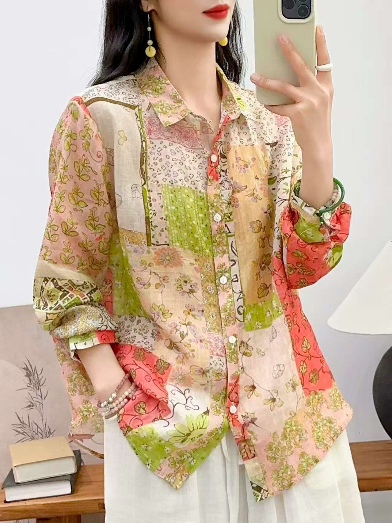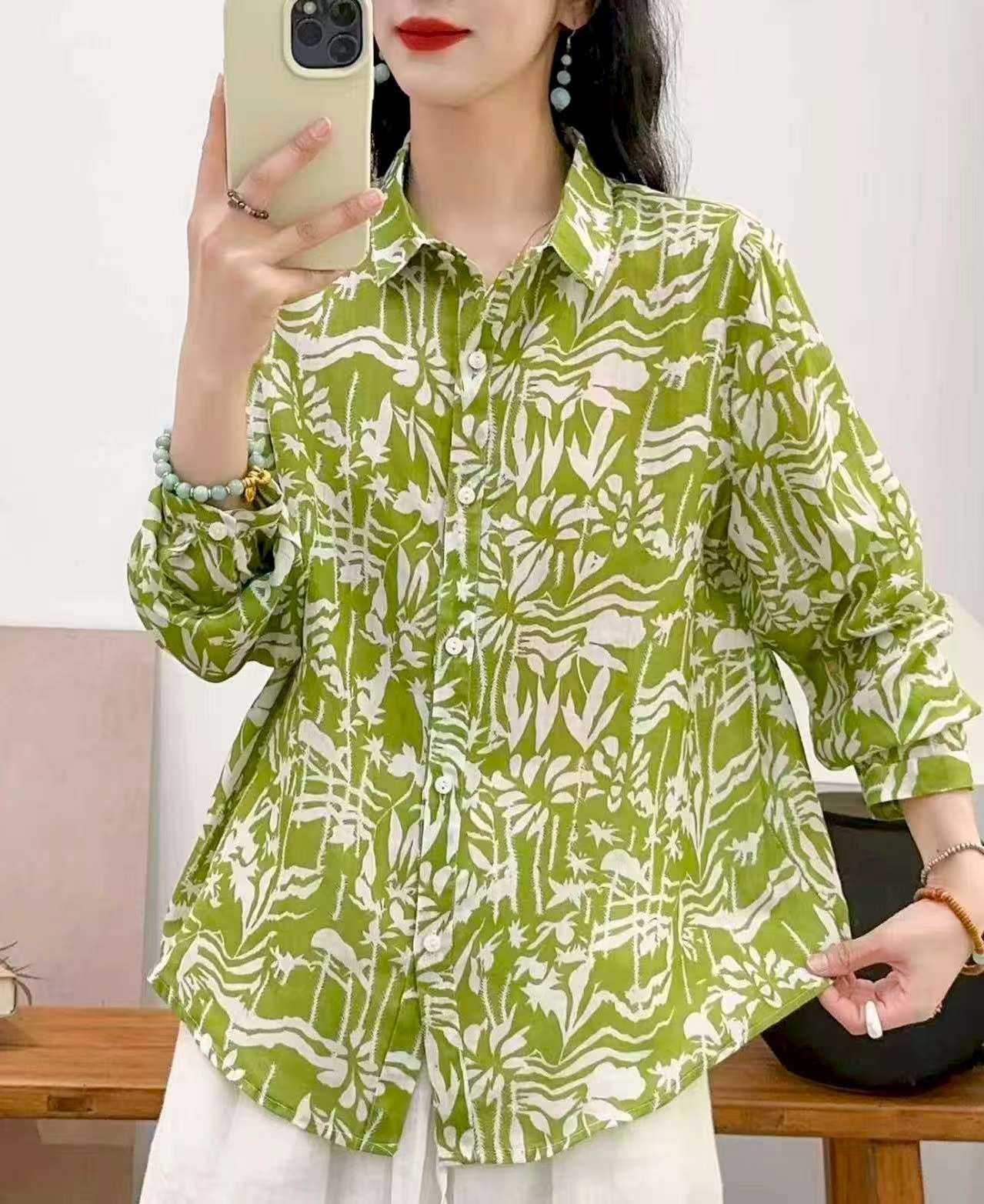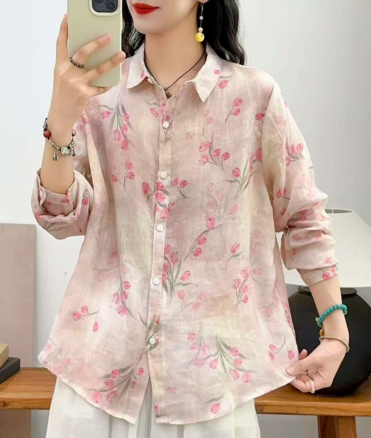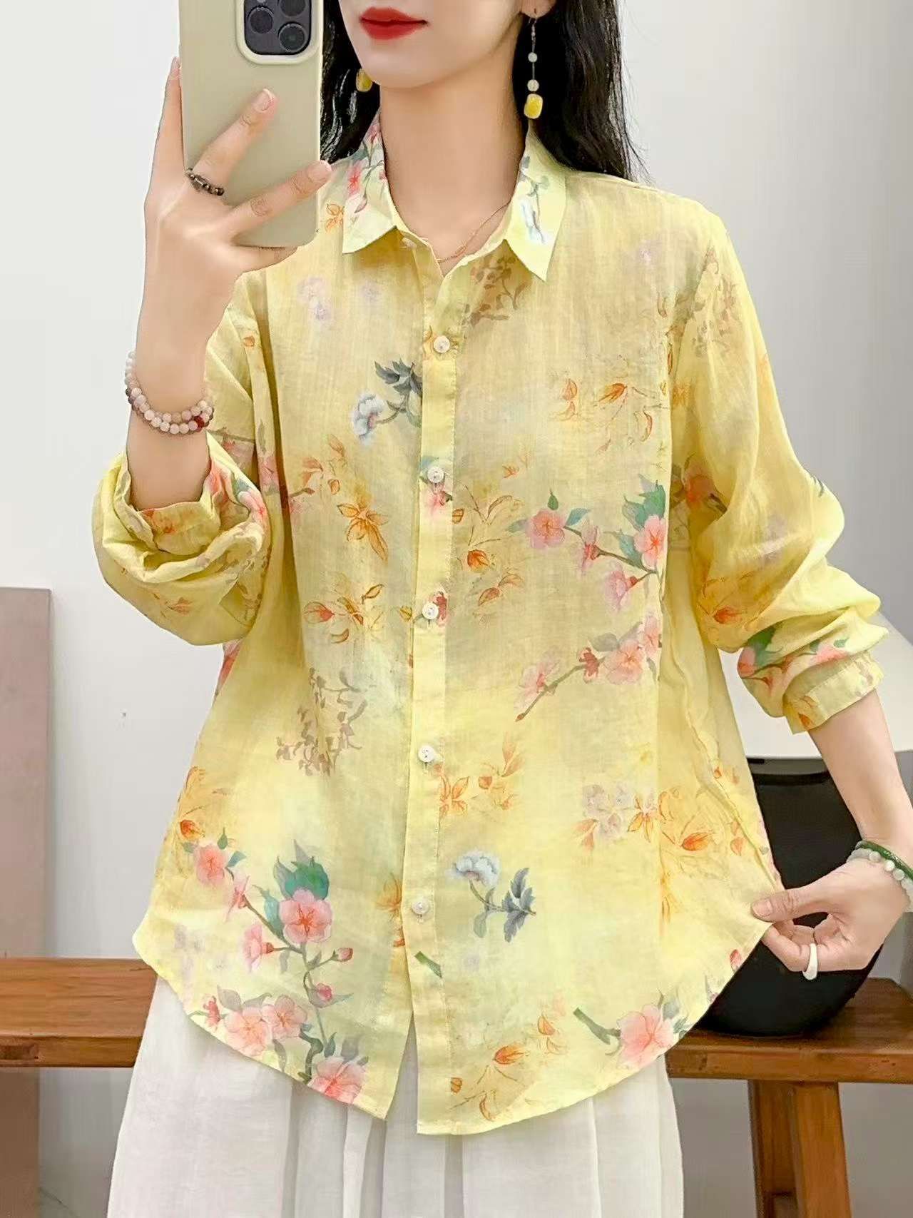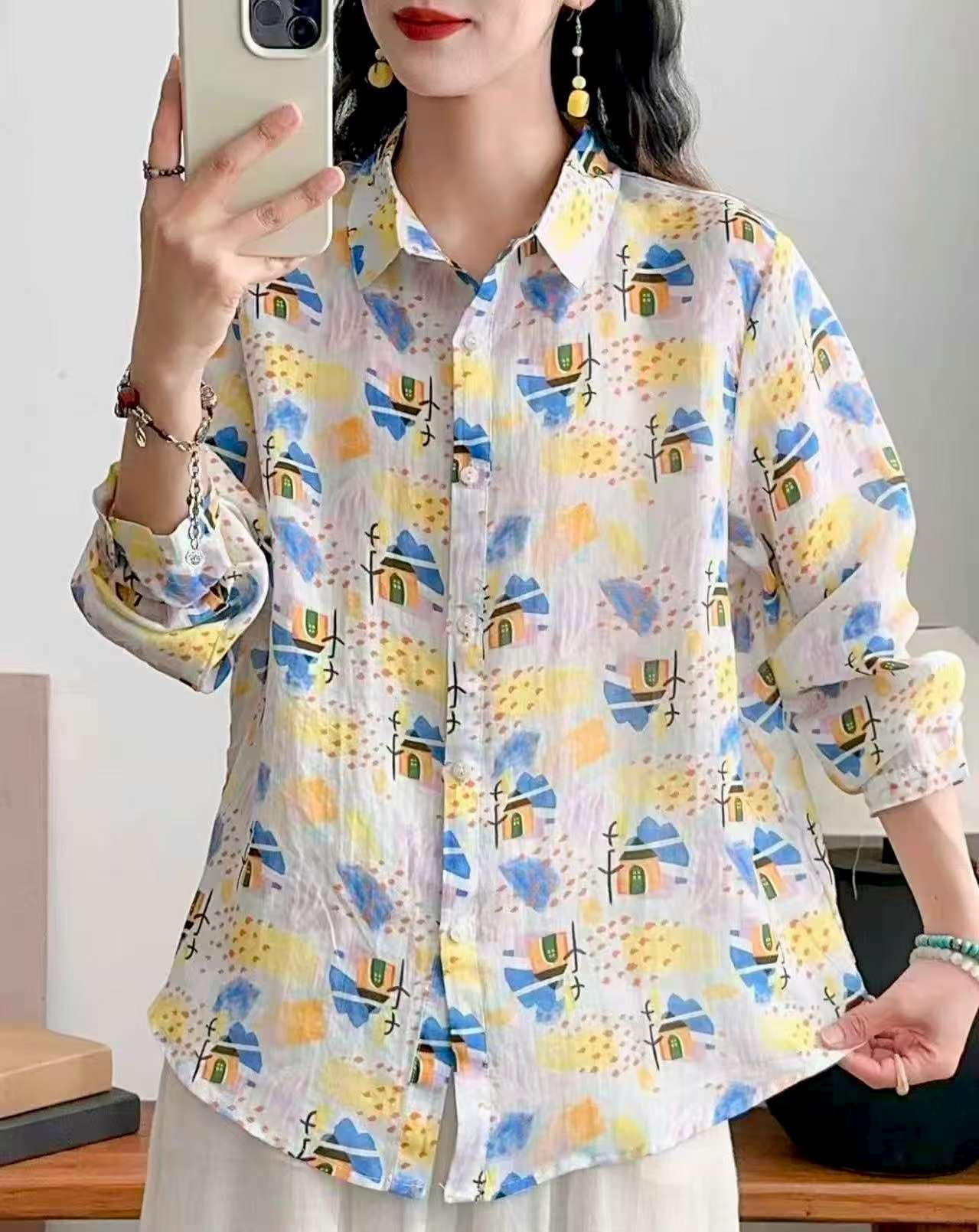 2026 신상 도매 모리걸 스타일 린넨 프린트 셔츠 긴팔 여성용 라펠 플로럴 탑 베이스 레이어 상의스토어 가기