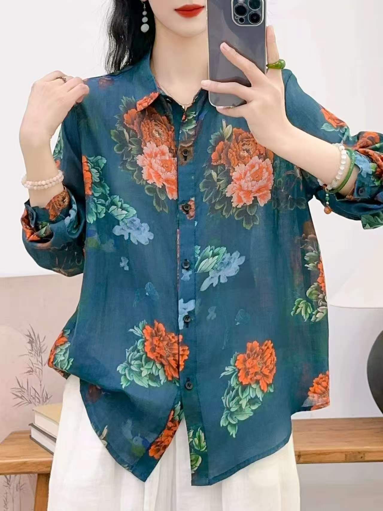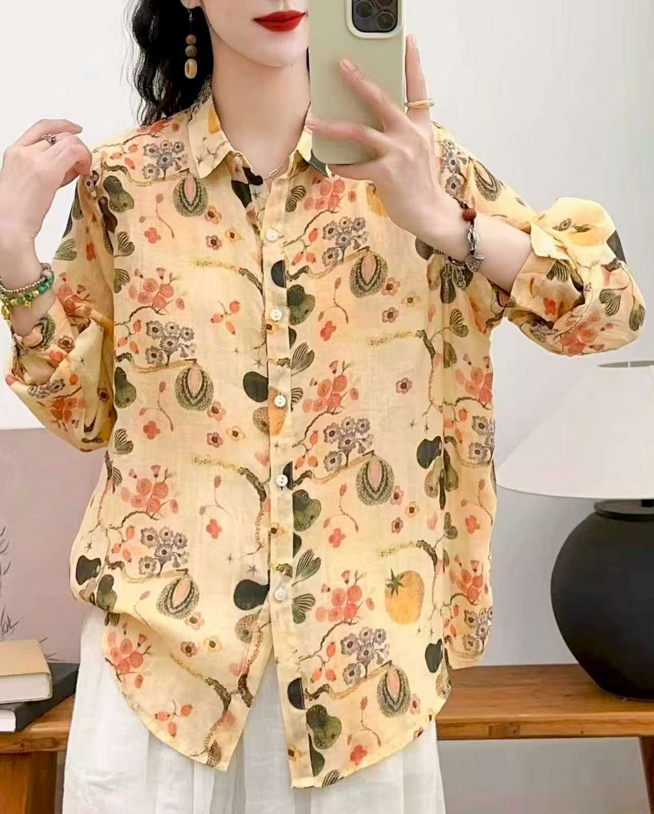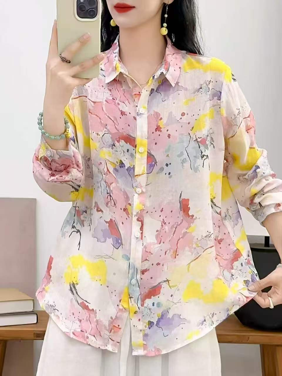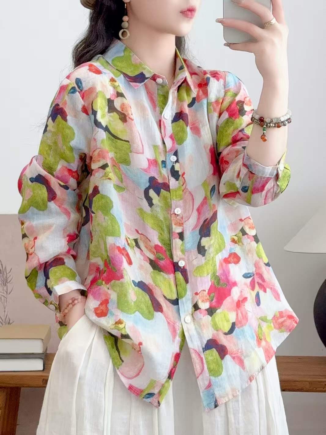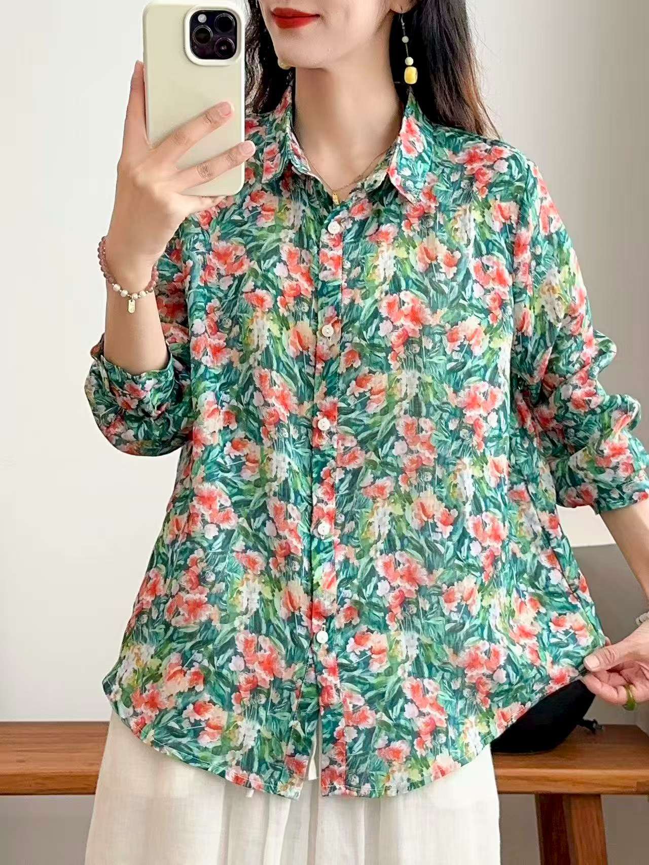 2026 신상 도매 모리걸 스타일 린넨 프린트 셔츠 긴팔 여성용 라펠 플로럴 탑 베이스 레이어 상의스토어 가기