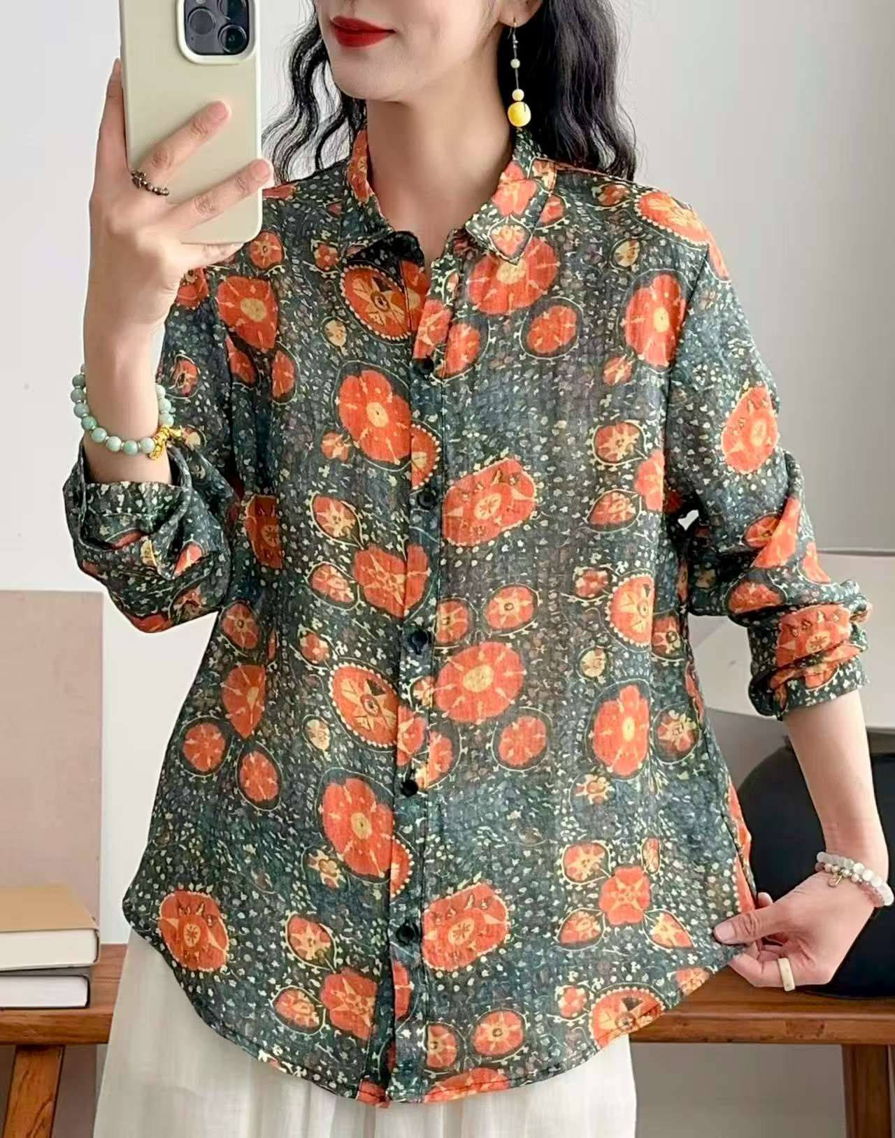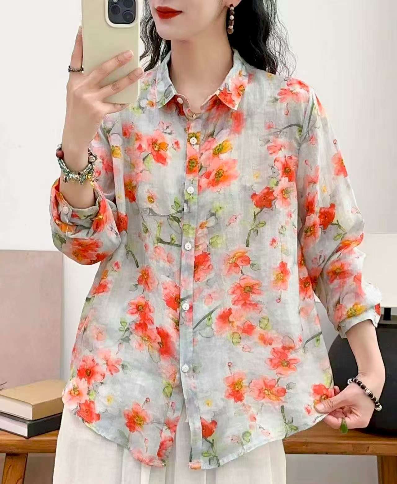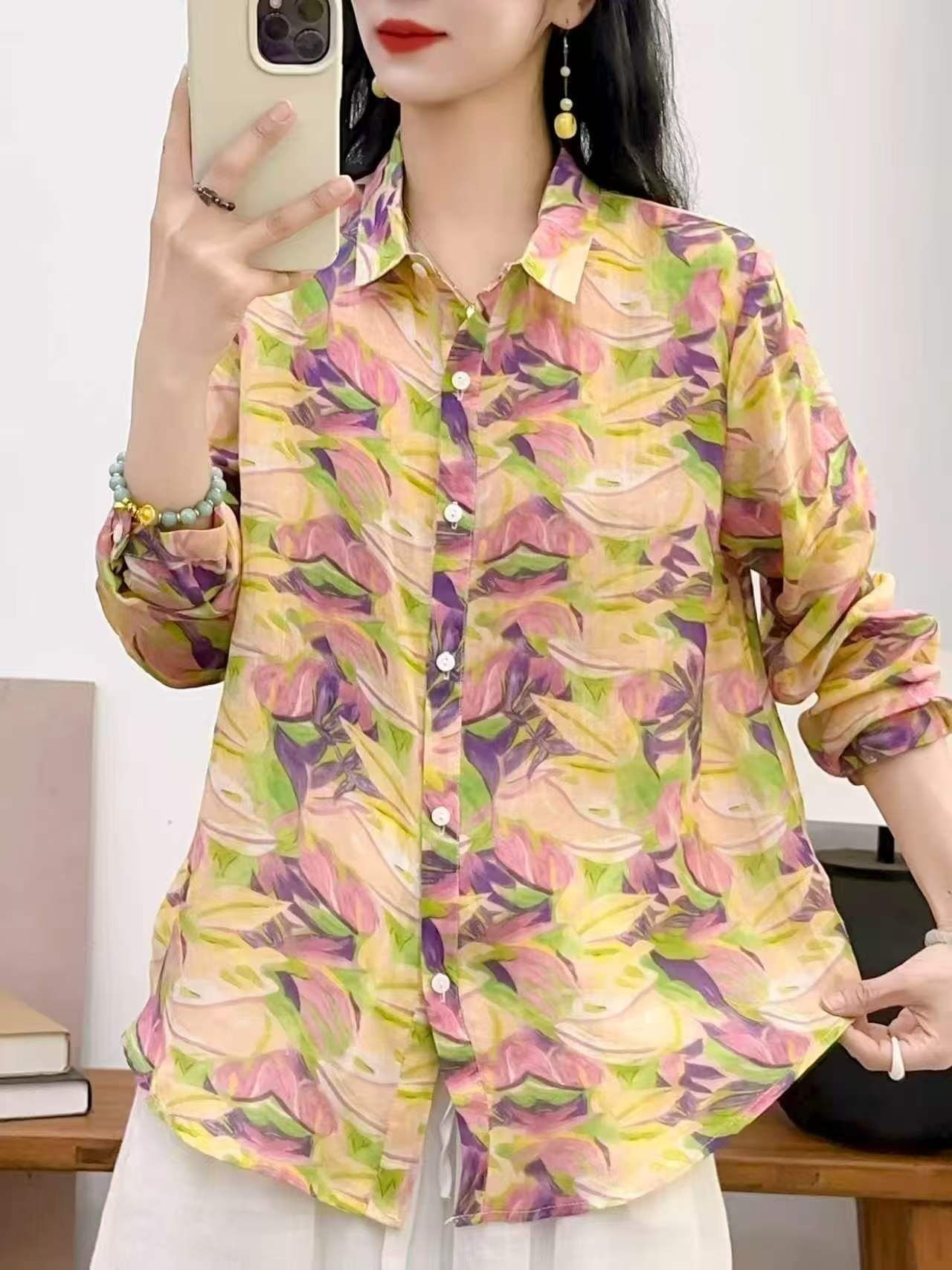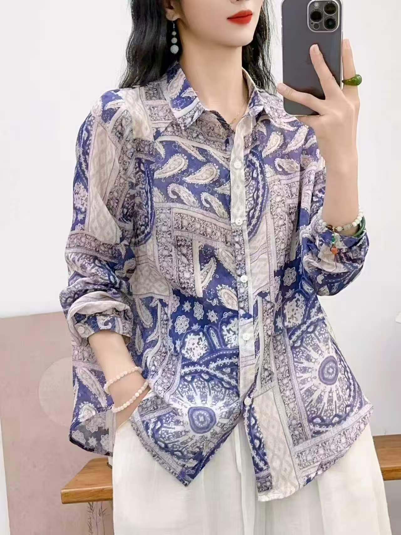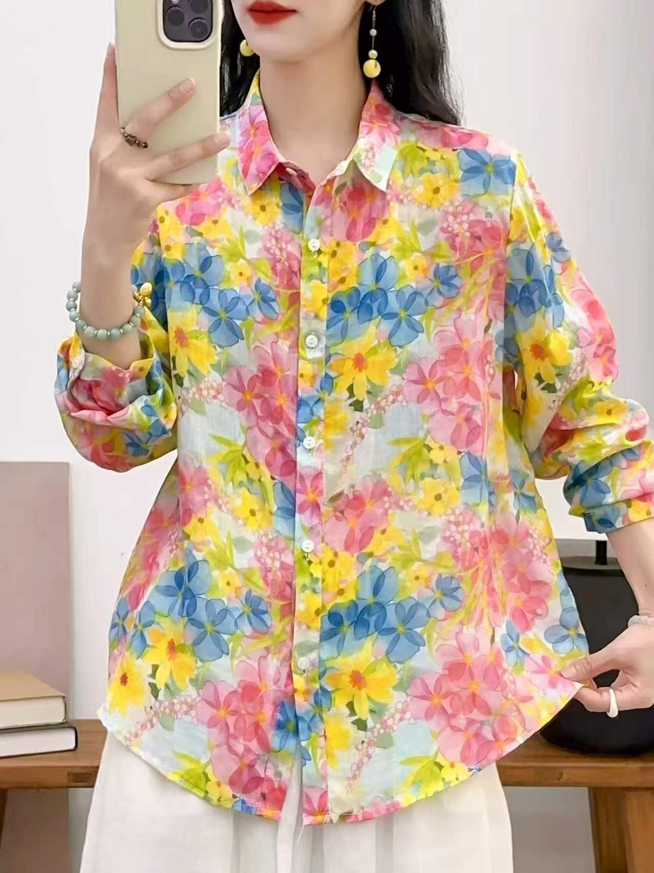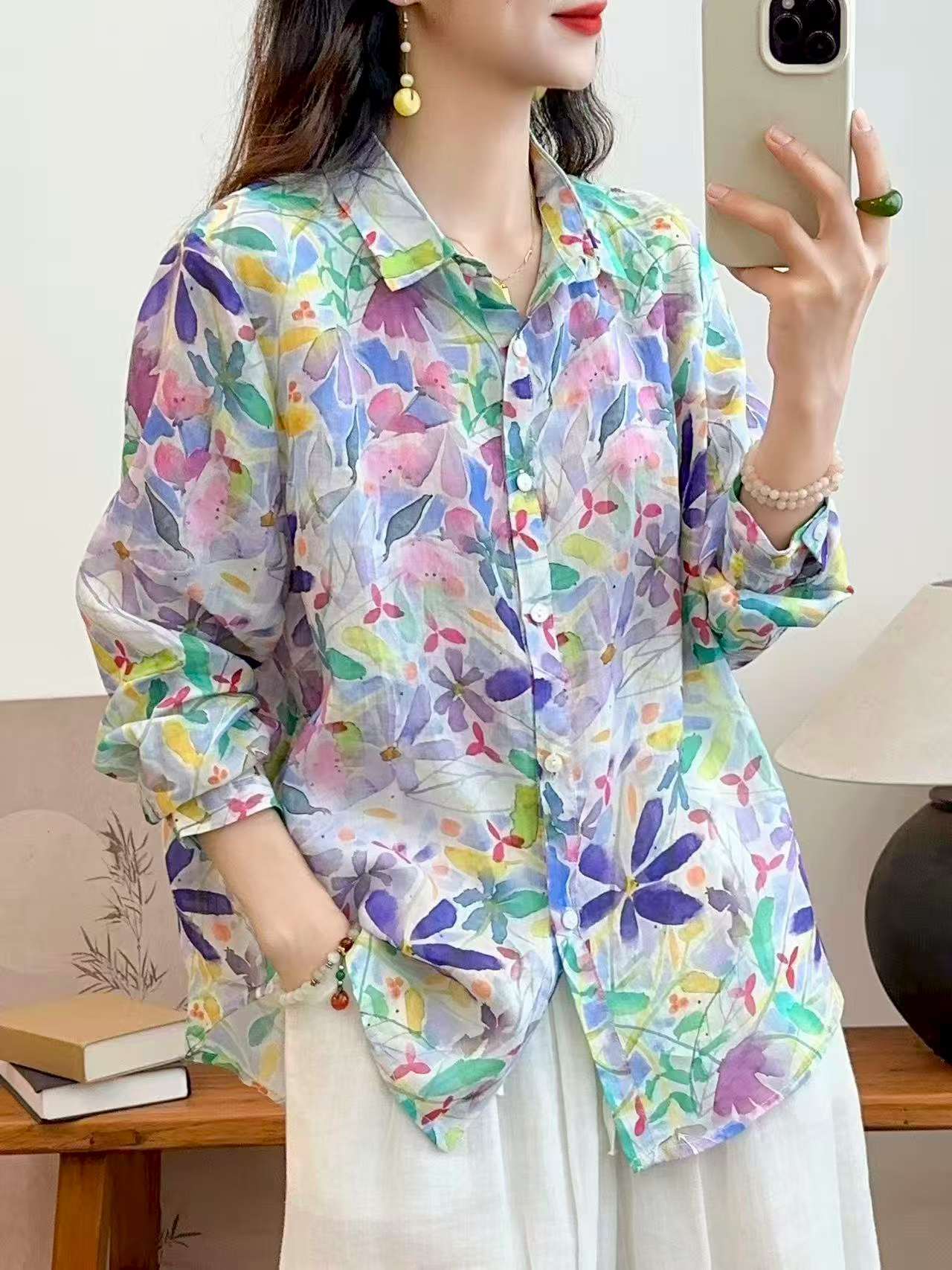 2026 신상 도매 모리걸 스타일 린넨 프린트 셔츠 긴팔 여성용 라펠 플로럴 탑 베이스 레이어 상의스토어 가기
