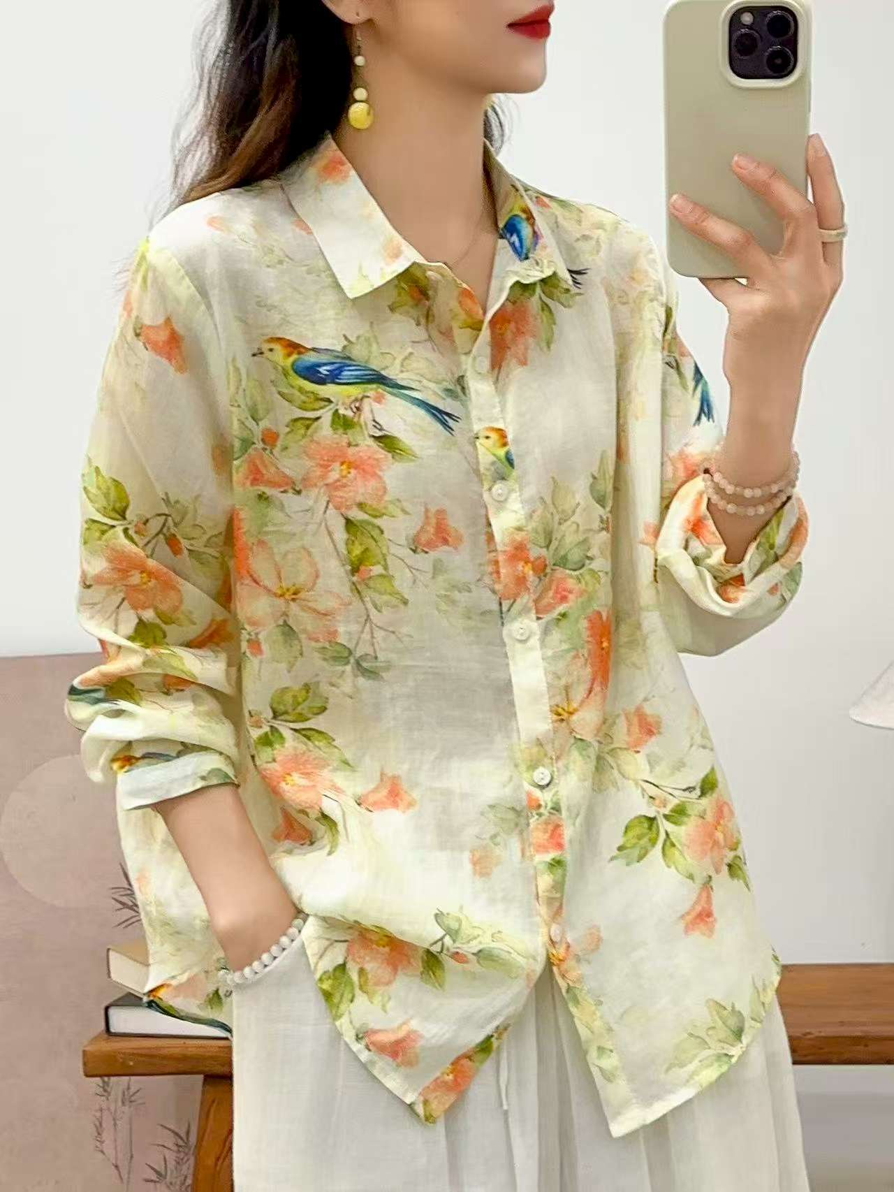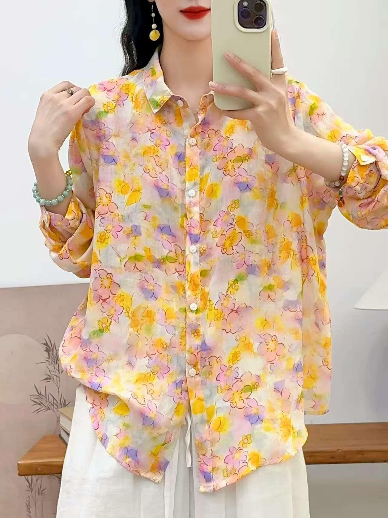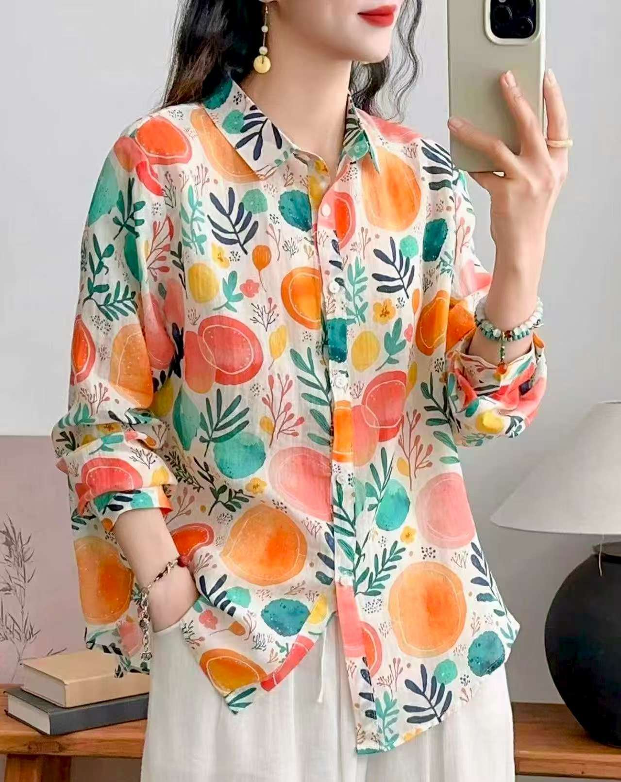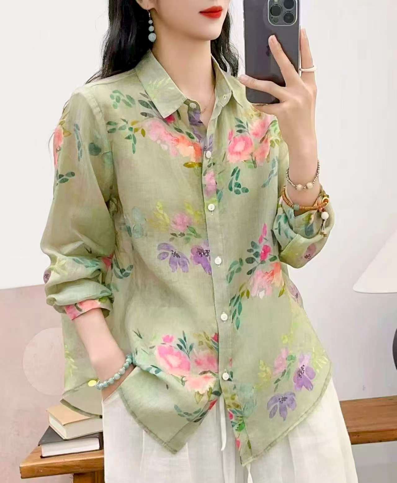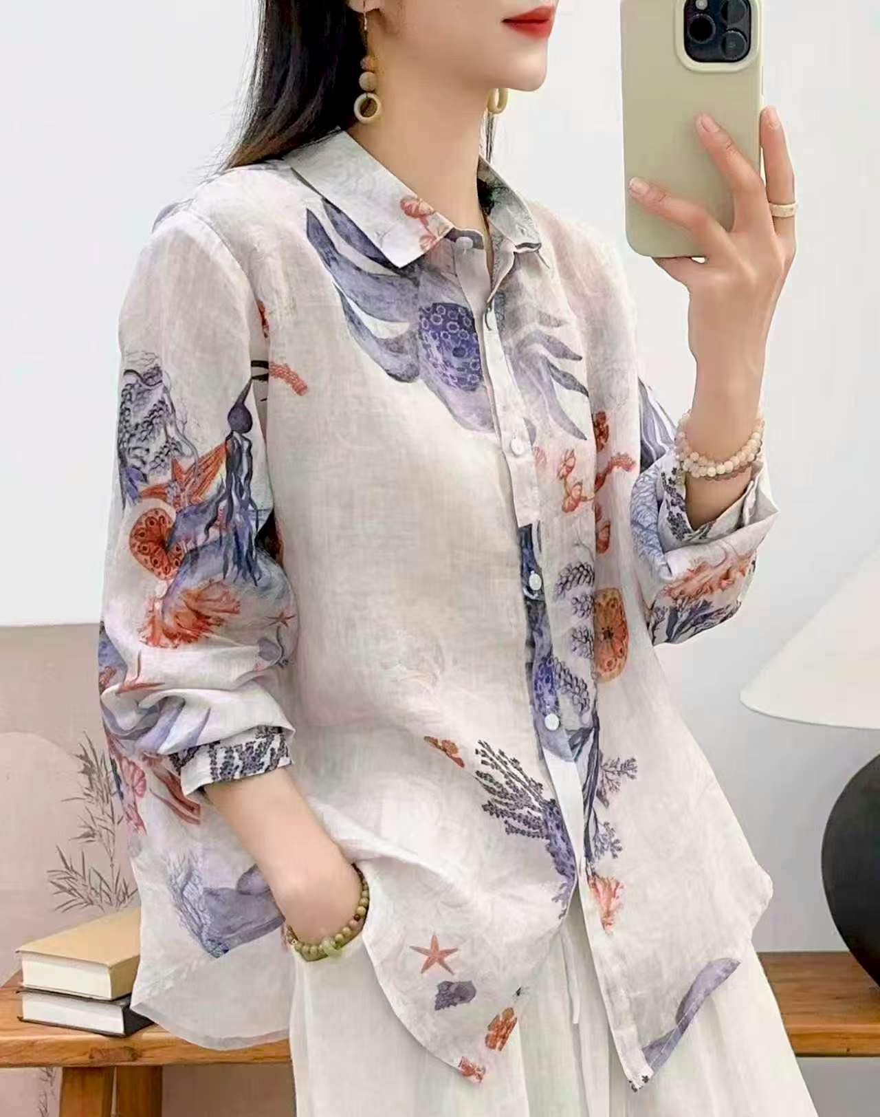 2026 신상 도매 모리걸 스타일 린넨 프린트 셔츠 긴팔 여성용 라펠 플로럴 탑 베이스 레이어 상의스토어 가기