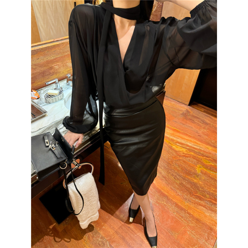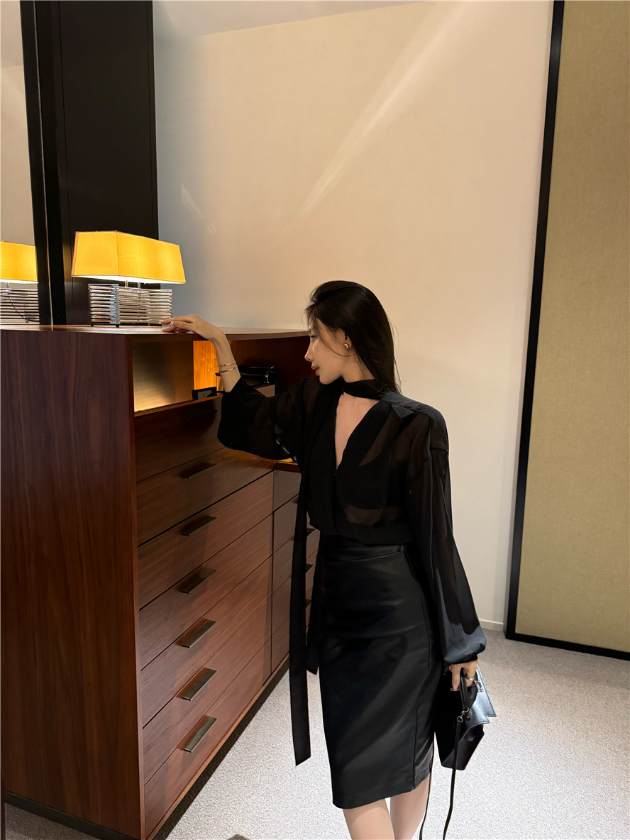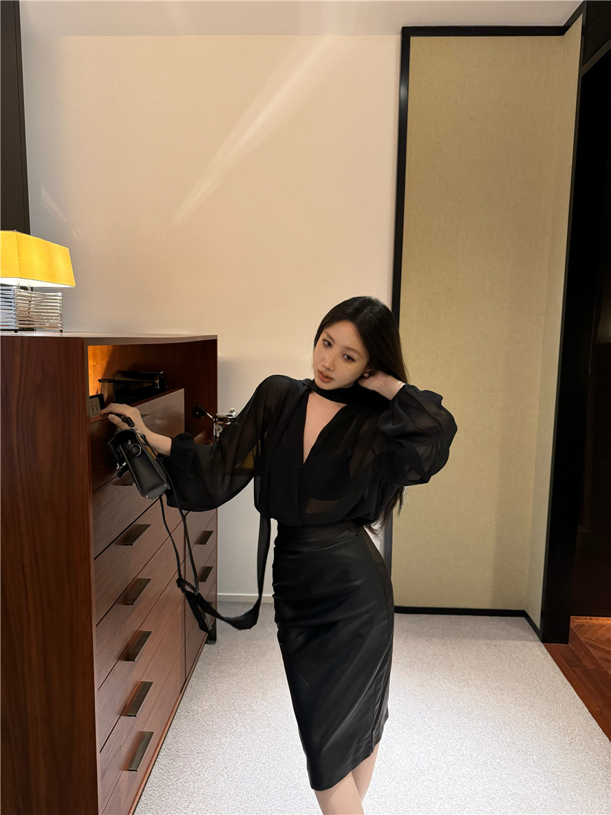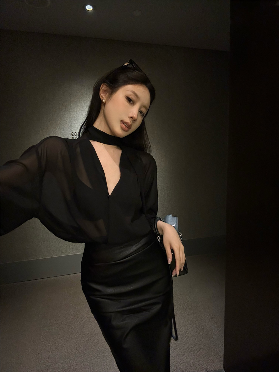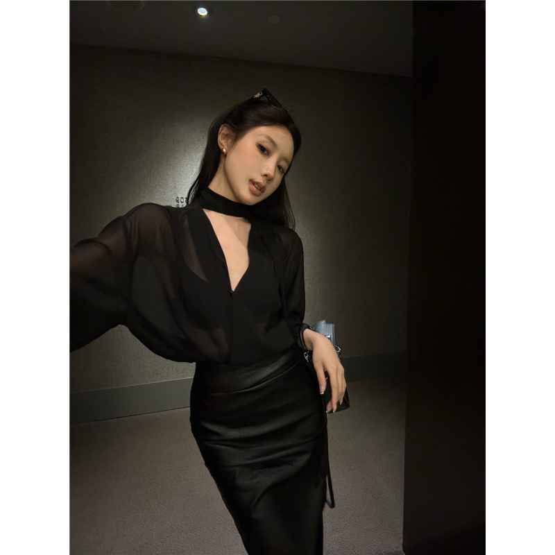 스파이스 소녀 사이 파인애플 가을 섹시한 페니 그레이드 얇은 교수형 목 스트랩 긴 소매 셔츠 높은 허리 스트레이트 튜브 분할 엉덩이 여성
