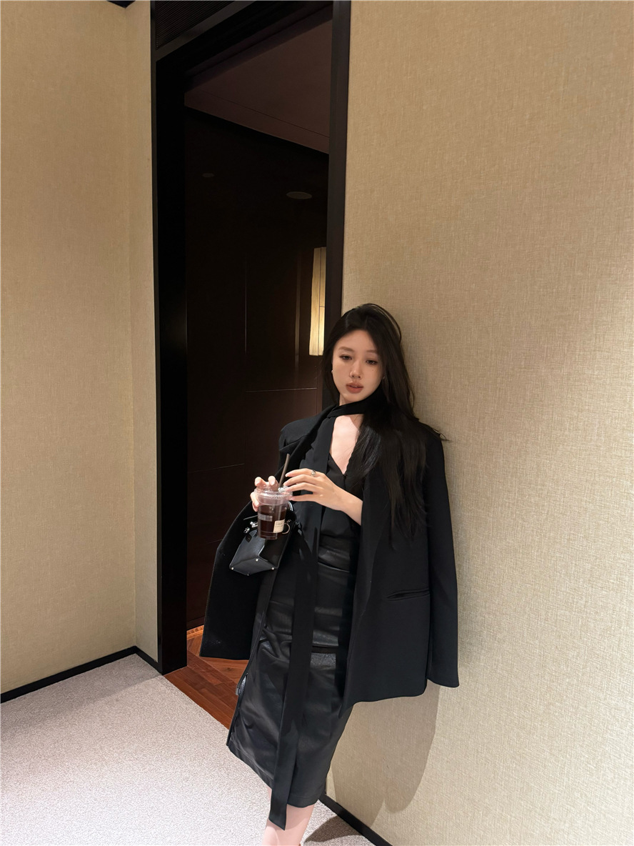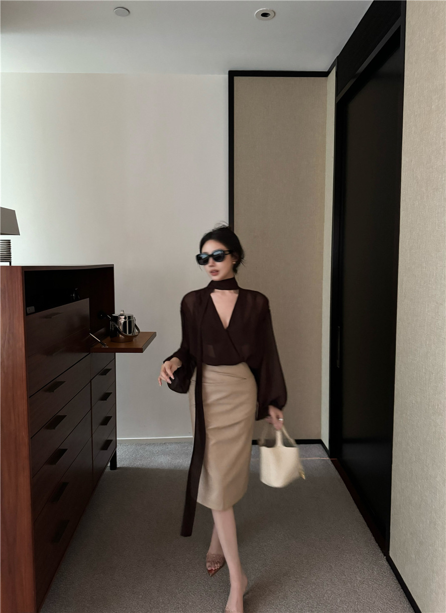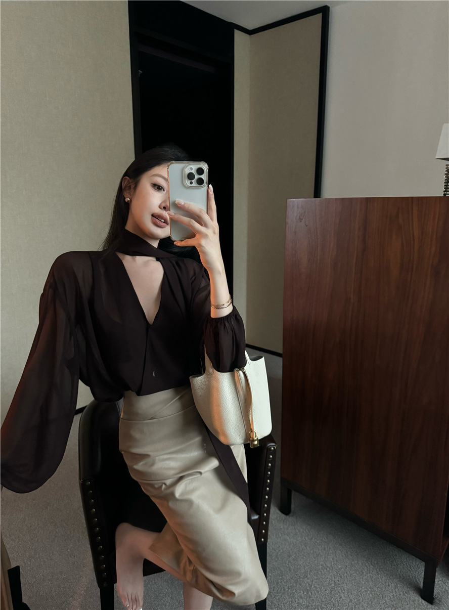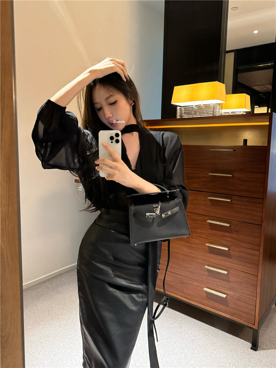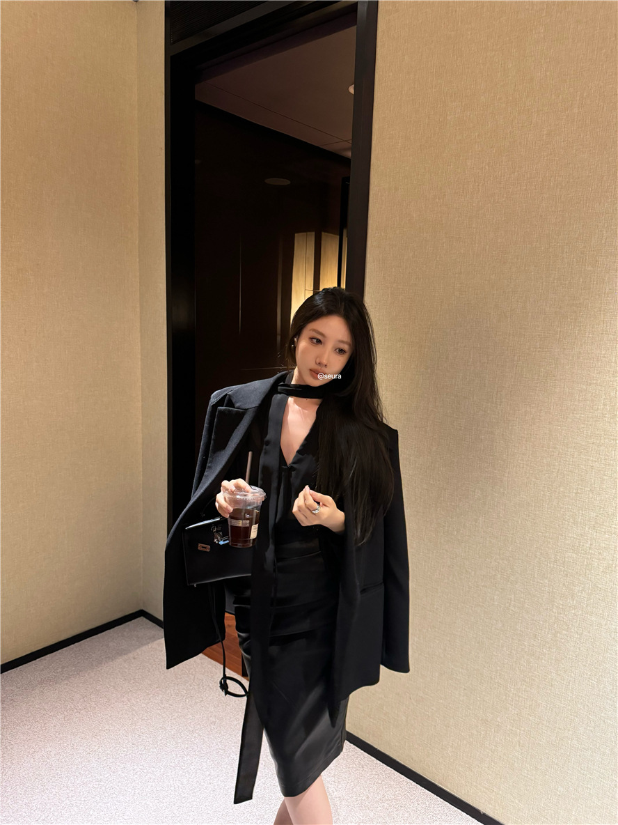 스파이스 소녀 사이 파인애플 가을 섹시한 페니 그레이드 얇은 교수형 목 스트랩 긴 소매 셔츠 높은 허리 스트레이트 튜브 분할 엉덩이 여성