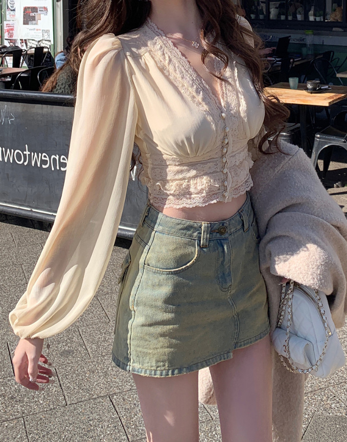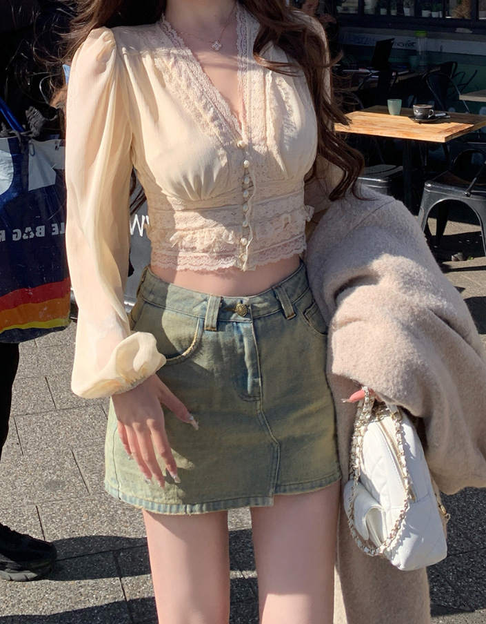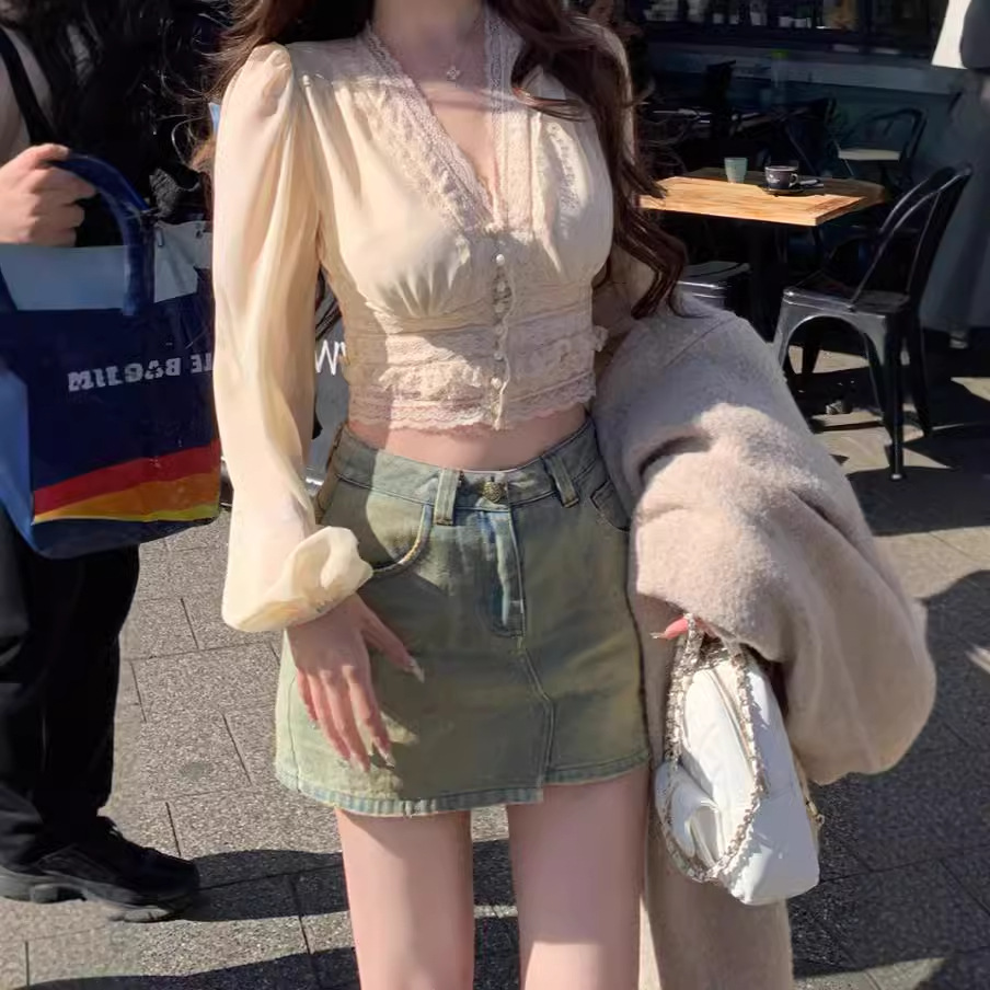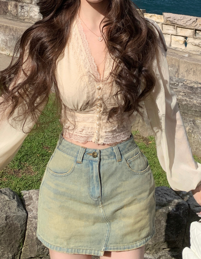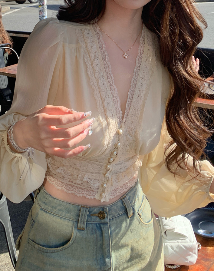 레이스 프렌치 니치 젠틀 편안한 올 매치 우아한 패션 로맨틱 레이스 바느질 긴 소매 셔츠 탑스토어 가기