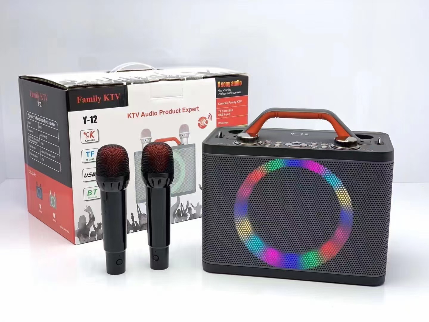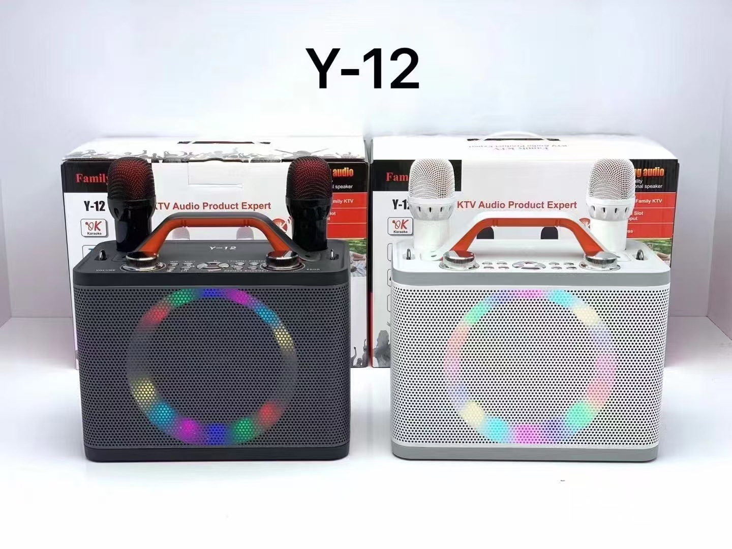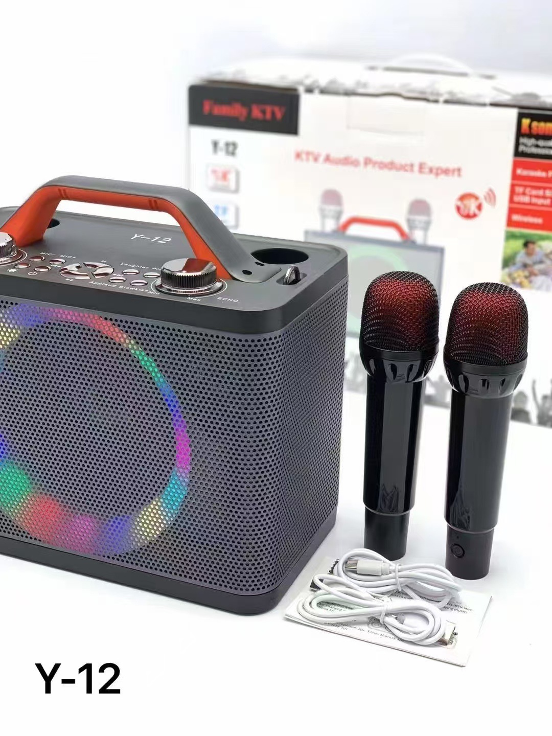 핫세일 Y-12 컬러라이트 무선 듀얼 마이크 블루투스 가정용 노래방 일체형 스피커 휴대용 무선 블루투스