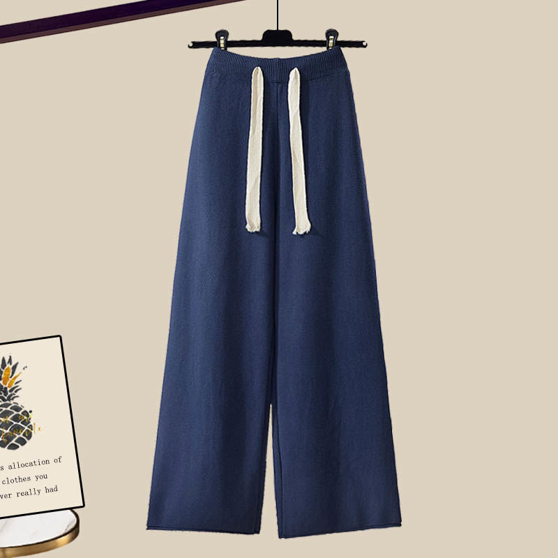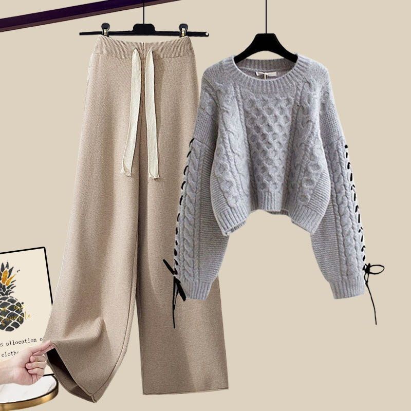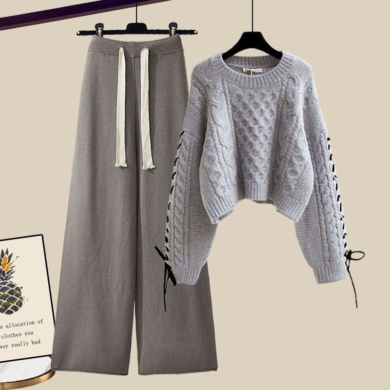 플러스 사이즈 여자 가을 겨울 세트 여자 2024 새로운 풀오버 니트 스웨터 여성의 느슨한 슬리밍 넓은 다리 바지 투피스 세트스토어 가기