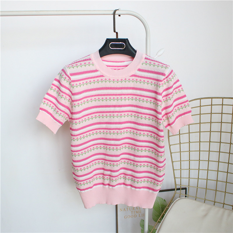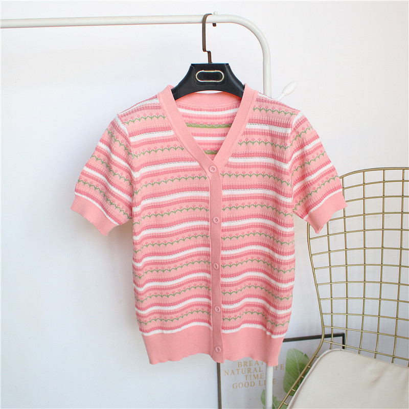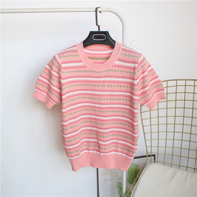 유럽 V 넥 아이스 실크 스트라이프 반팔 티셔츠 여자 2024 년 여름 새로운 올 매치 슬림 하프 슬리브 탑