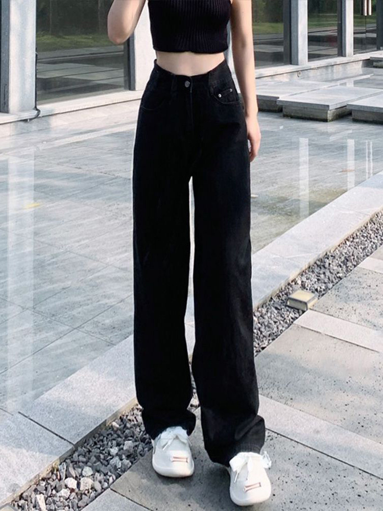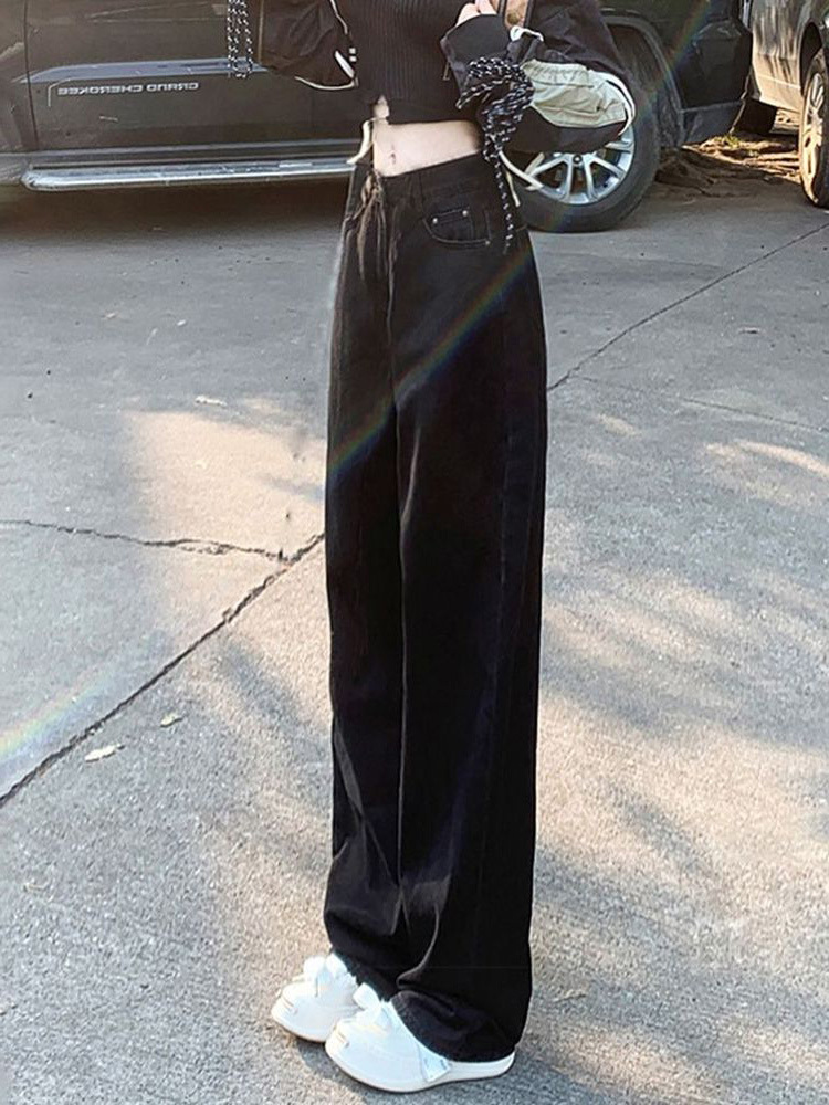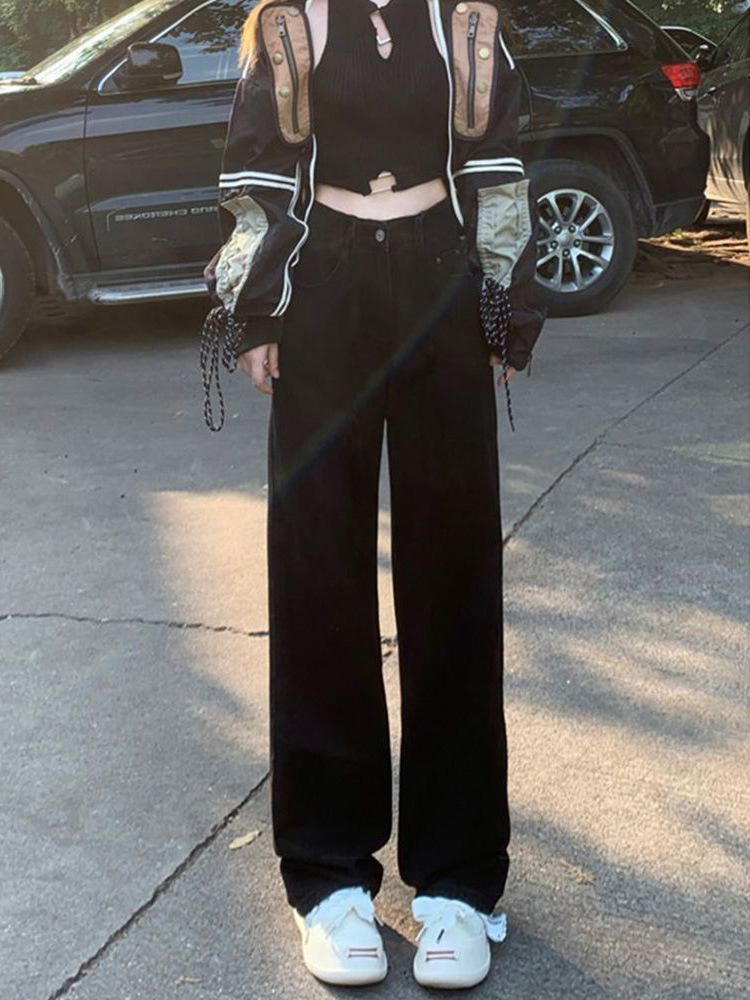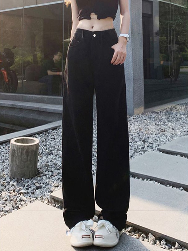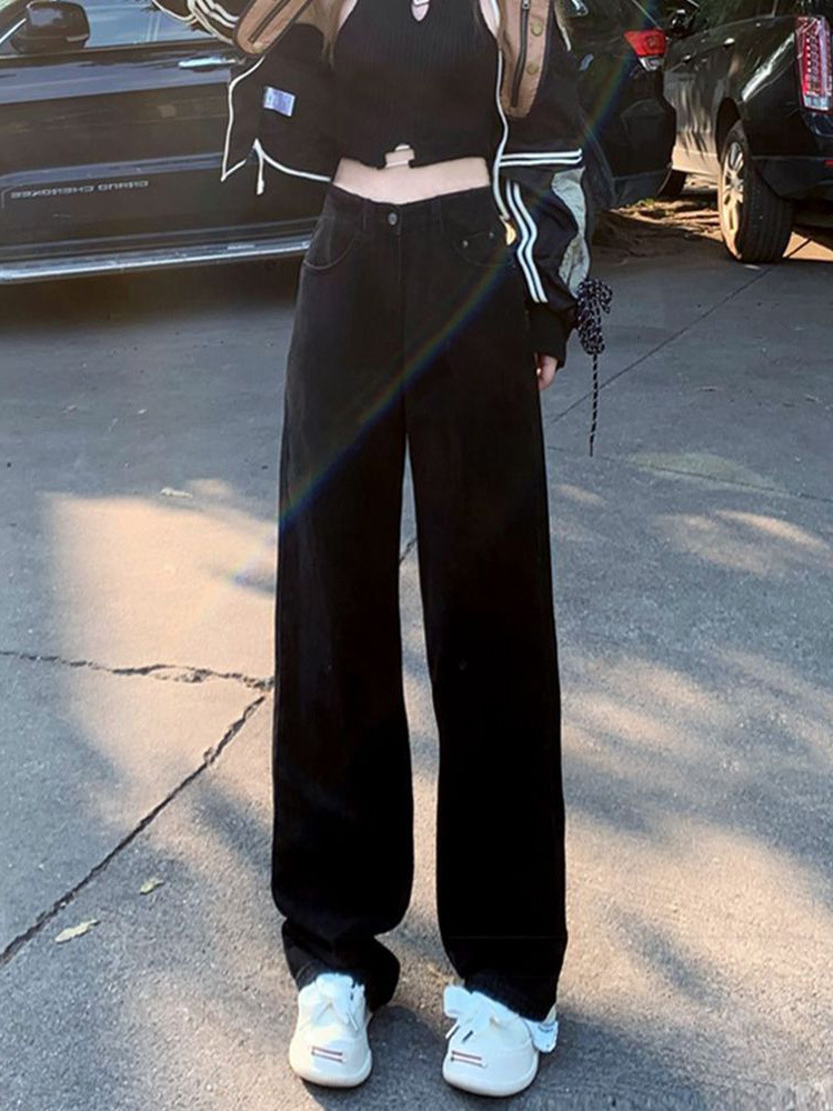 블랙 하이 허리 스트레이트 청바지 여자 봄 2024 캐주얼 레트로 느슨한 슬리밍 캐주얼 올 매치 와이드 레그 바지