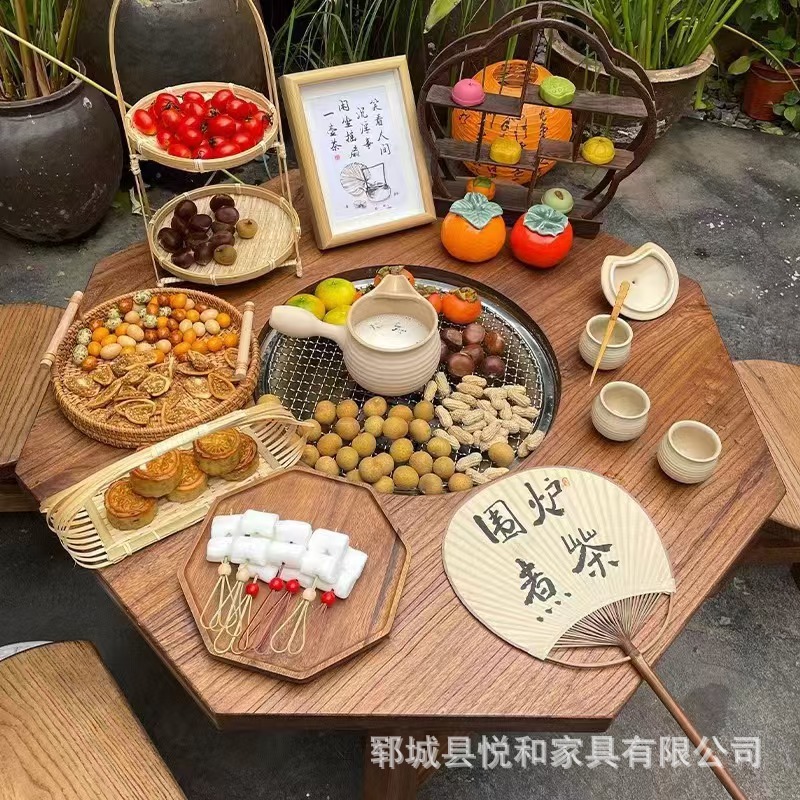 올드 느릅 나무 팔각형 스토브 테이블 발코니 야외 차 테이블 캠핑 피크닉 바베큐 테이블 홈스테이 빈티지 핫 팟 테이블스토어 가기
