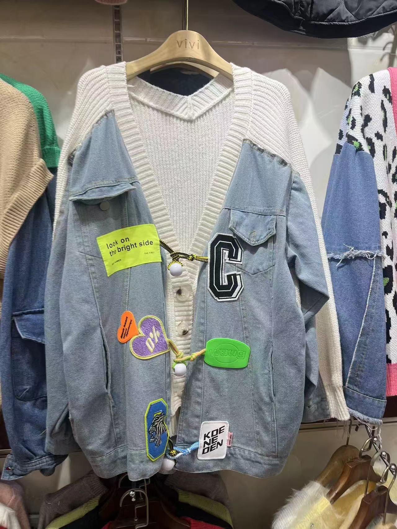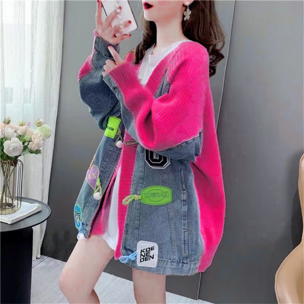 한국 스타일 데님 스플라이싱 스웨터 재킷 여성용 2025 가을 겨울 신상 디자인 감각 있는 틈새시장 루즈핏 가디건 니트 상의스토어 가기