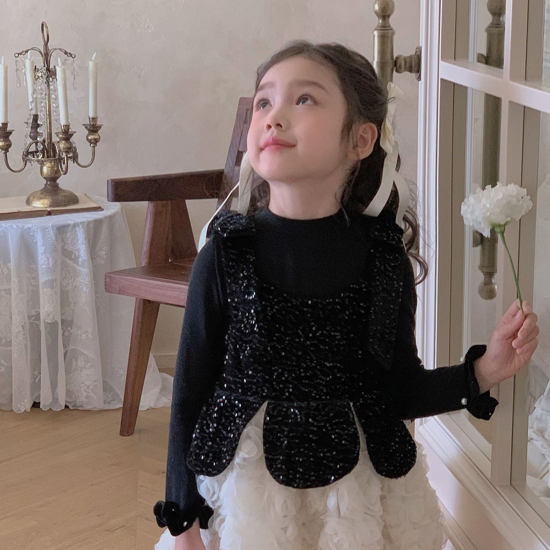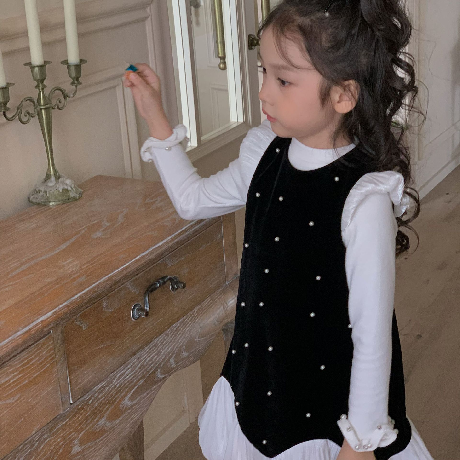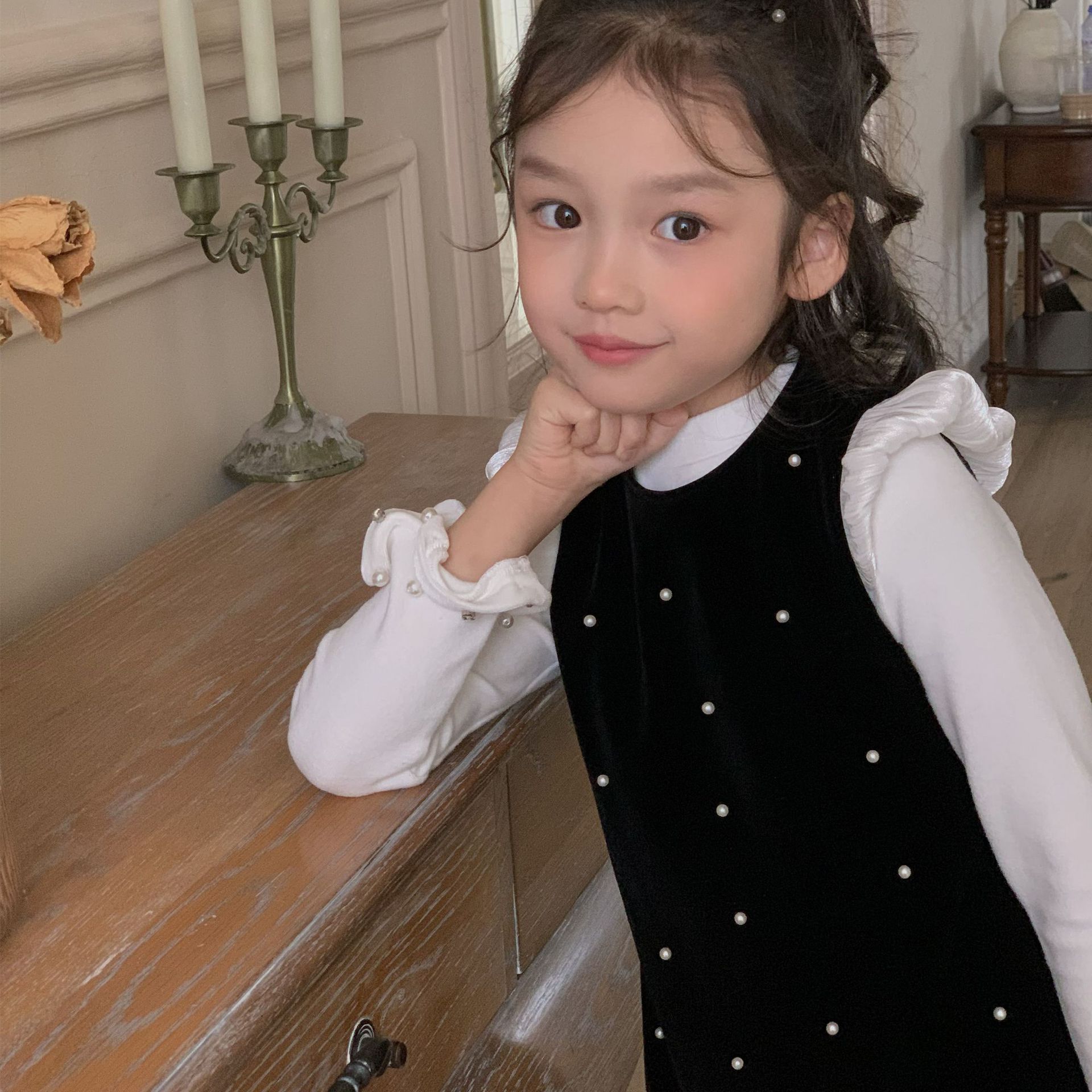 제조 업체 아동복 소녀 기본 바닥 셔츠 가을과 겨울 어린이 연꽃 잎 레이스 얇은 벨벳 긴 소매 서양식 칼라 내부스토어 가기