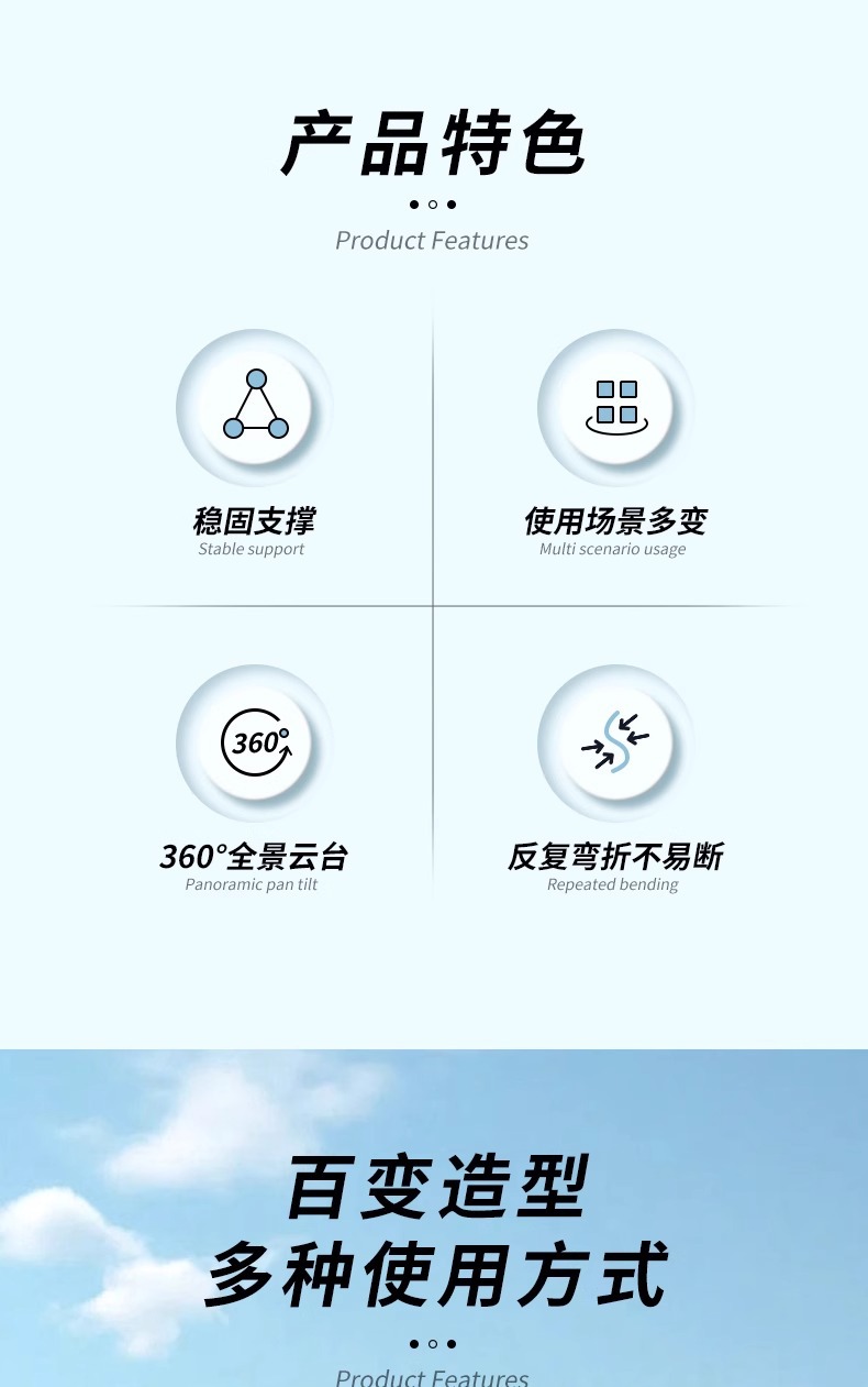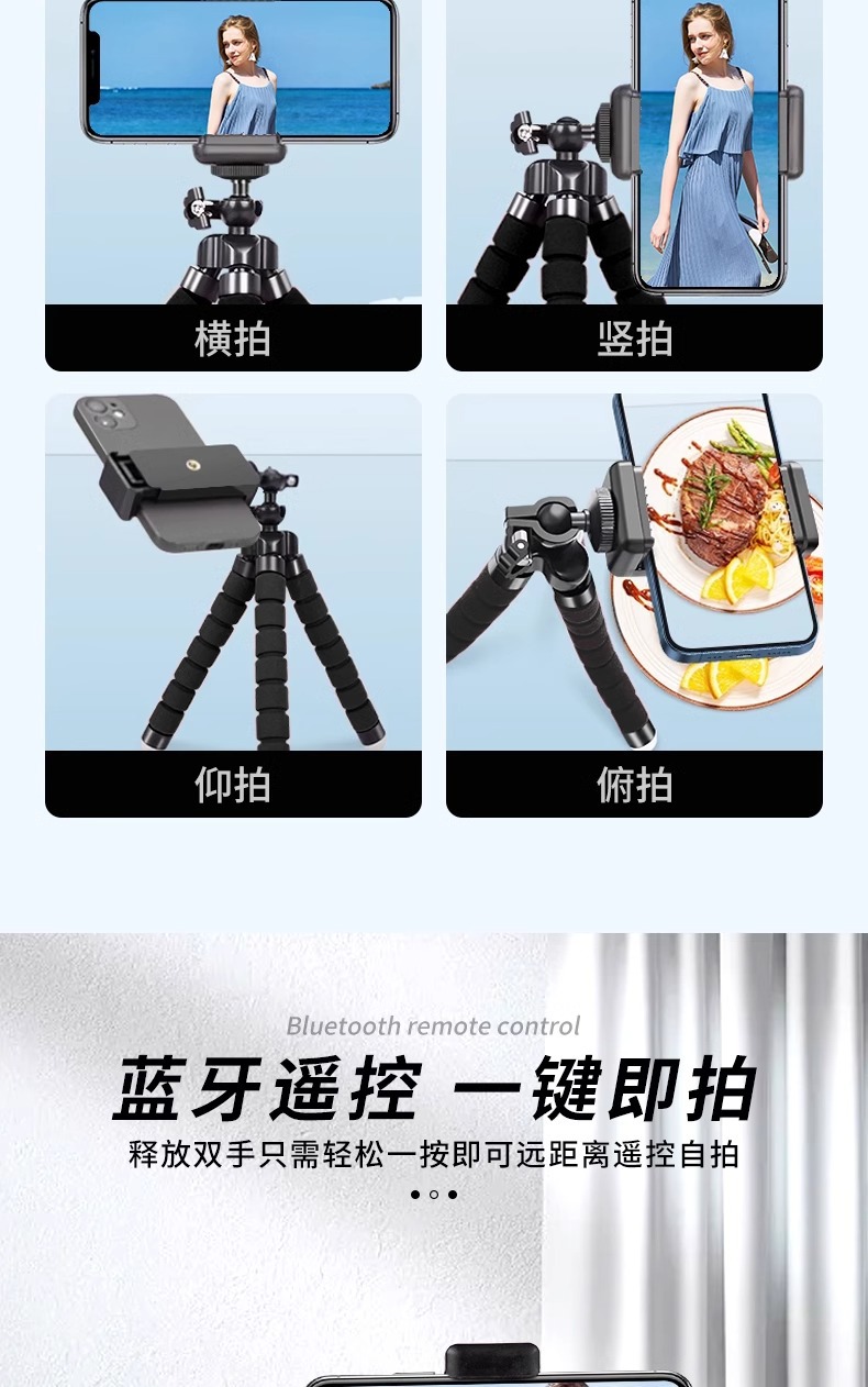 • 문어 삼각 지지대 [레이크 스카이블루] 스탠드 + 업그레이드된 미끄럼 방지 휴대폰 클립 + 블루투스 리모컨