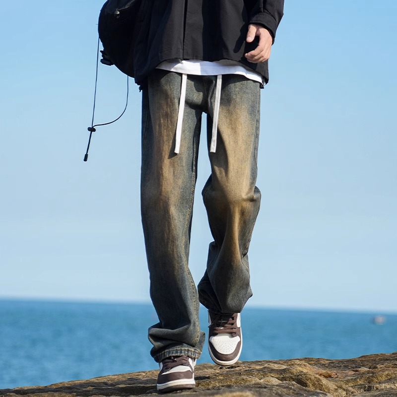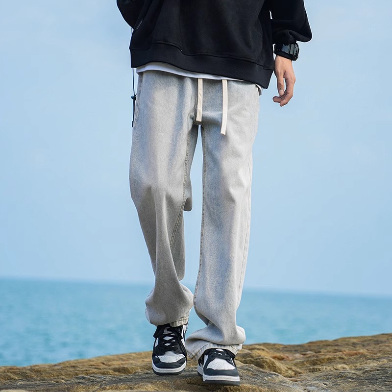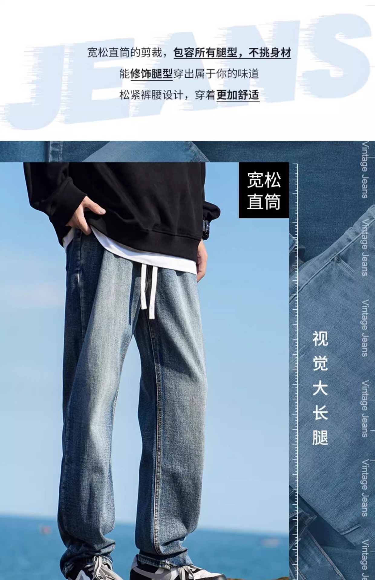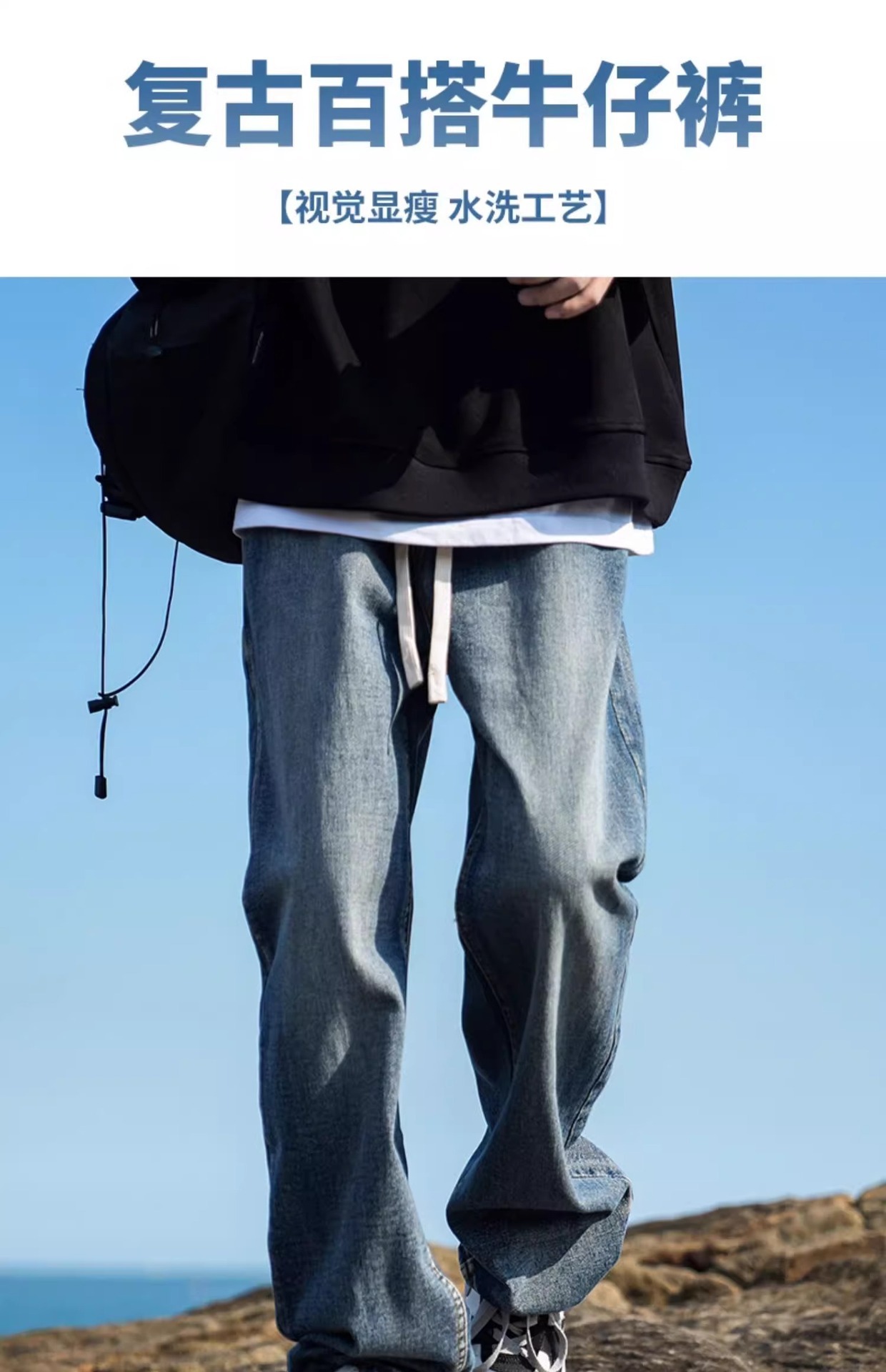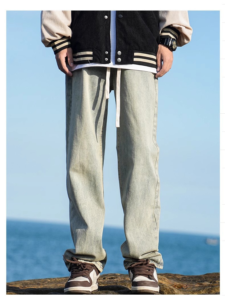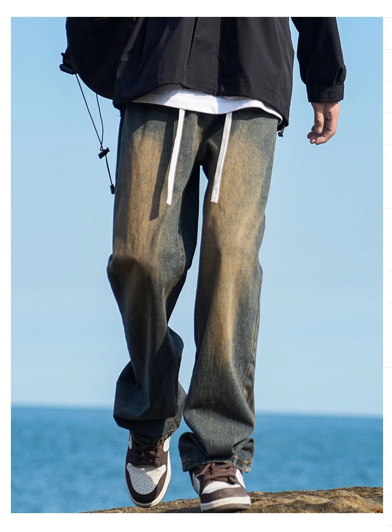 NASA Retro Jeans 남성 봄과 가을 2024 미국 스타일 와이드 레그 캐주얼 바지 Elasticated Waist Drawstring 느슨한 직선 다리 바지
