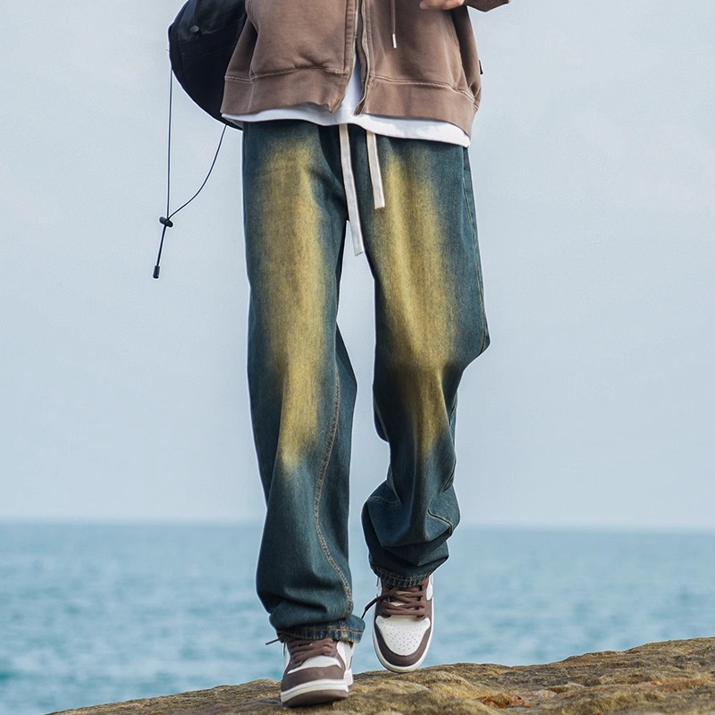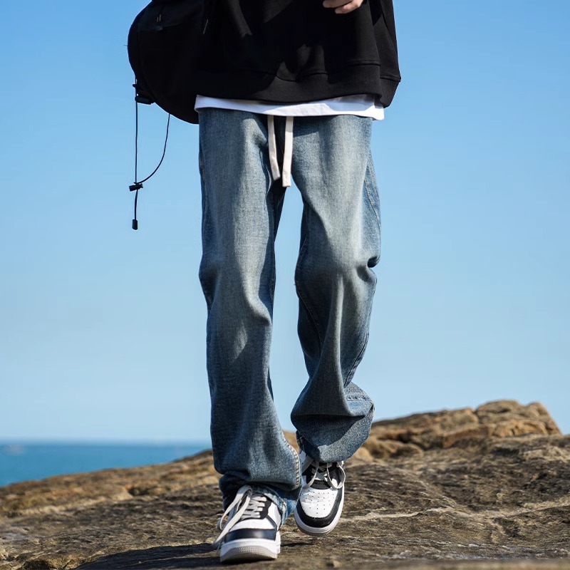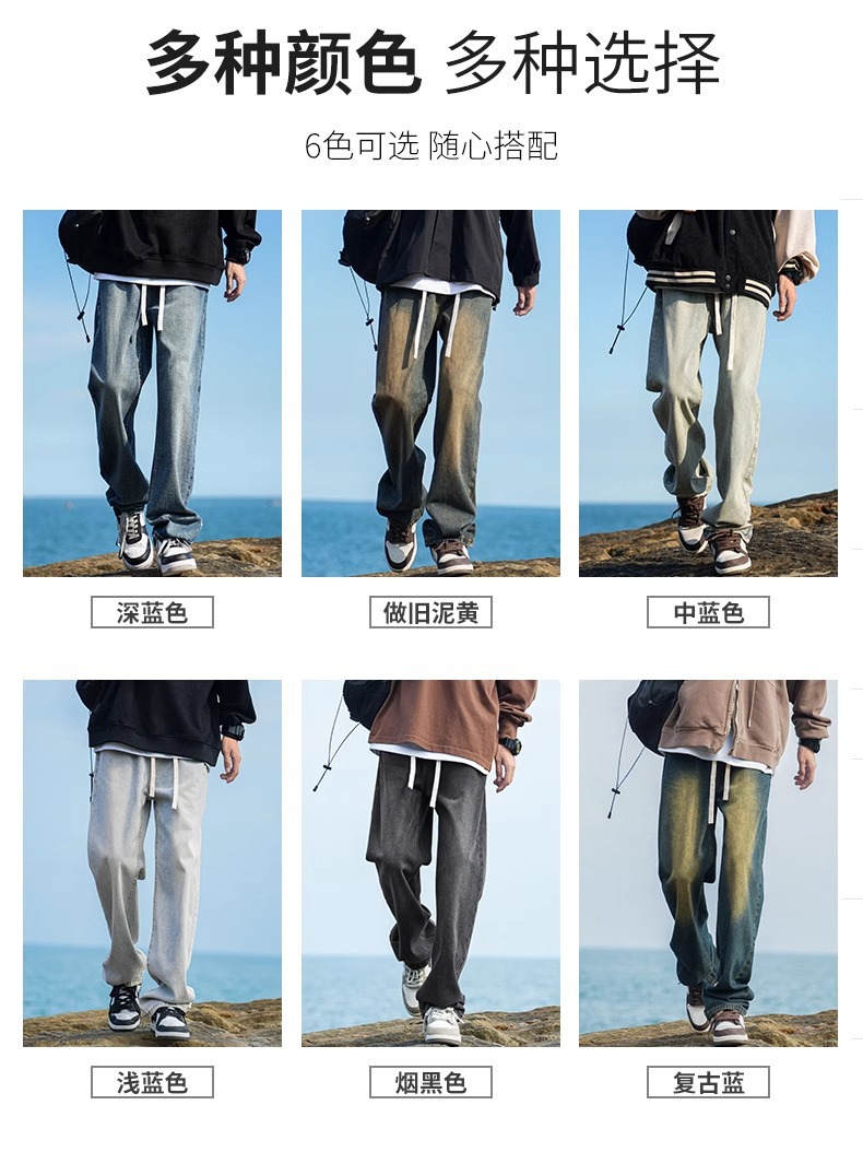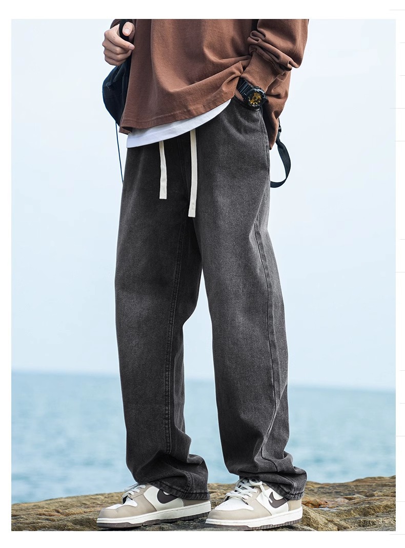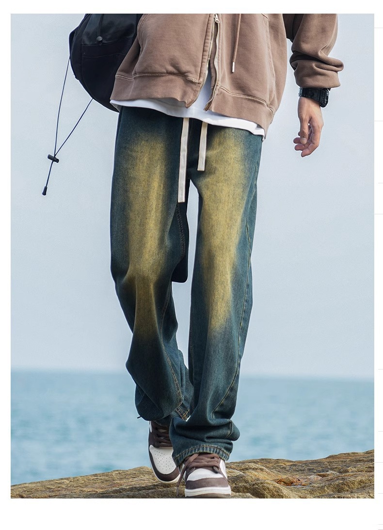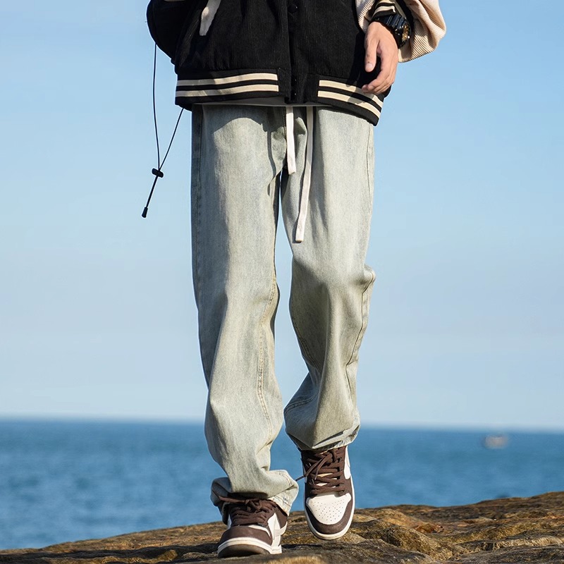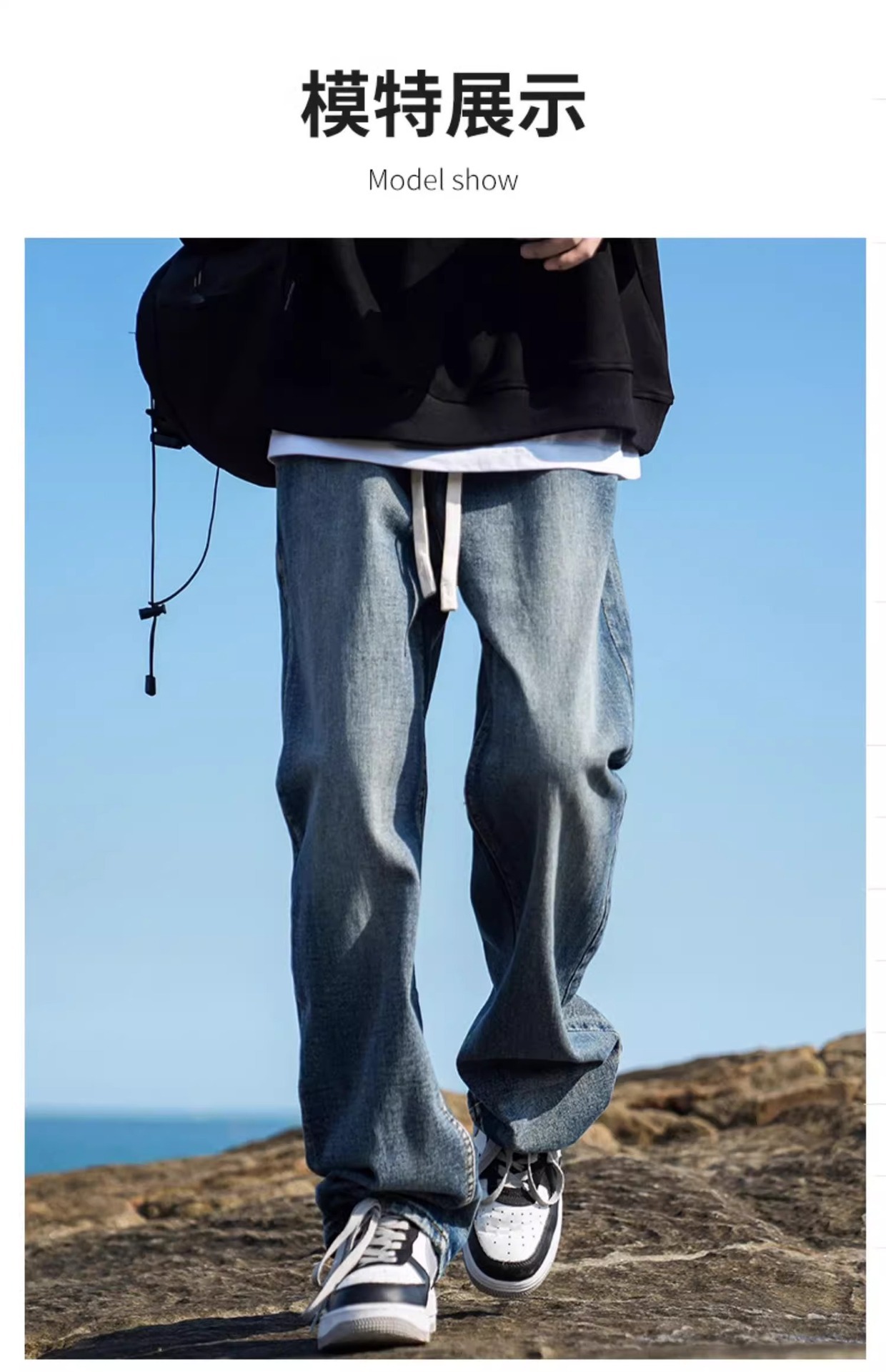 NASA Retro Jeans 남성 봄과 가을 2024 미국 스타일 와이드 레그 캐주얼 바지 Elasticated Waist Drawstring 느슨한 직선 다리 바지