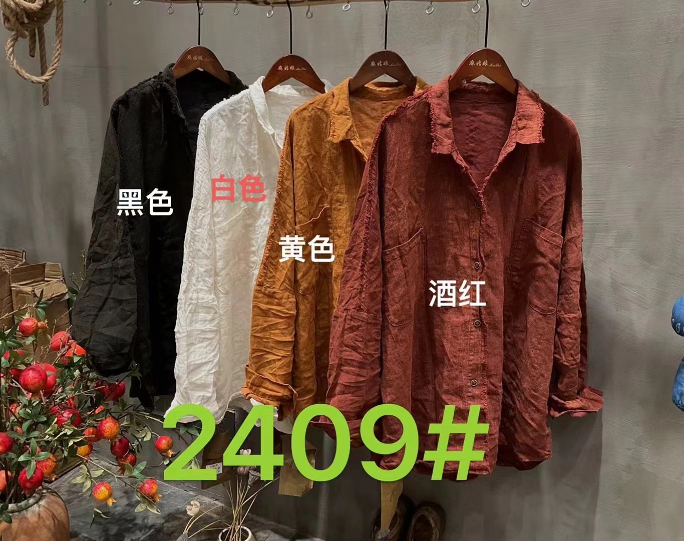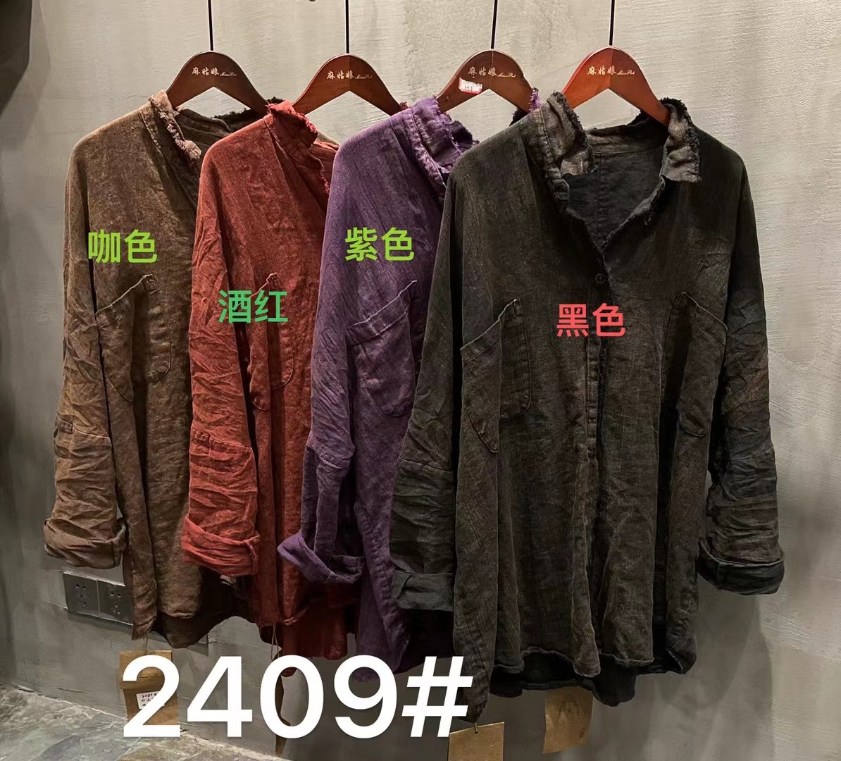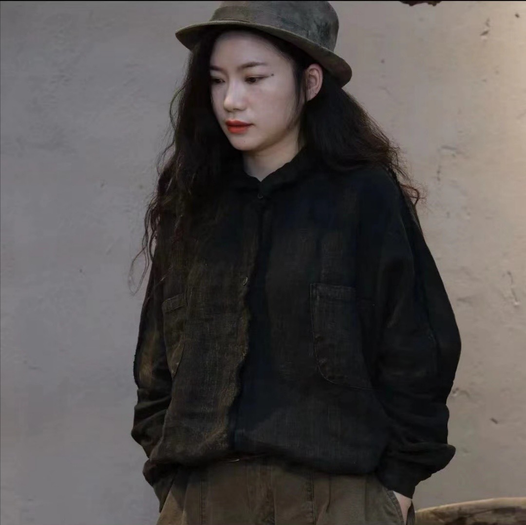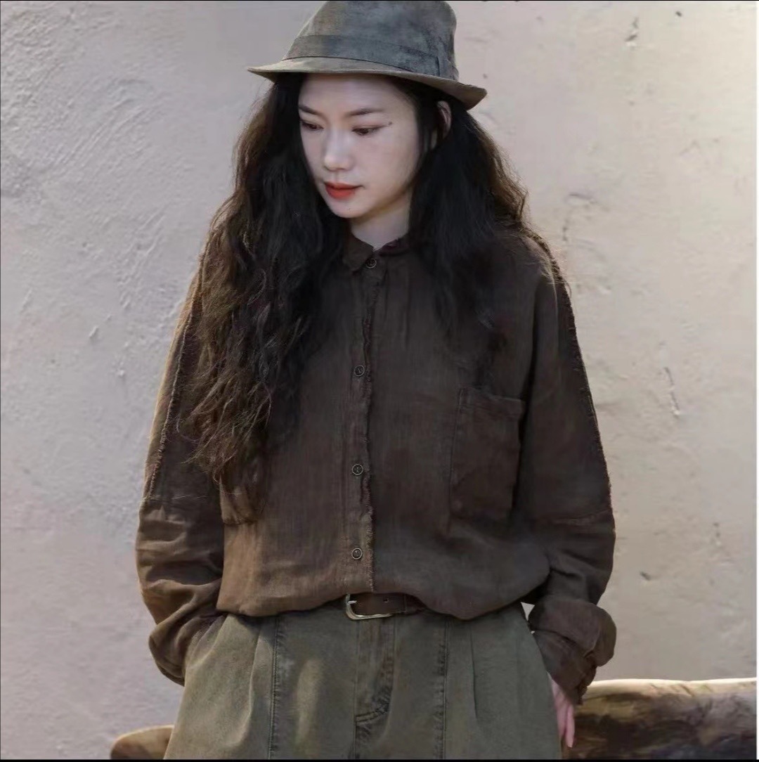 가을 2024 느슨한 빈티지 리넨 샌드 오래 된 래피 옷깃 셔츠 카디건 올 매치 캐주얼 셔츠 여성용 2409스토어 가기