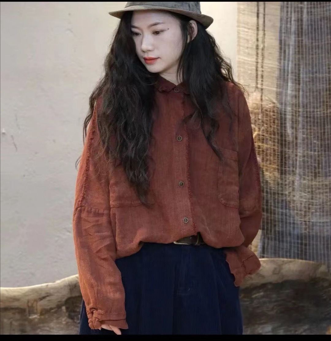 가을 2024 느슨한 빈티지 리넨 샌드 오래 된 래피 옷깃 셔츠 카디건 올 매치 캐주얼 셔츠 여성용 2409