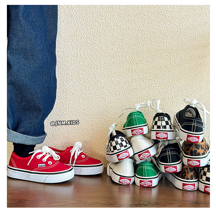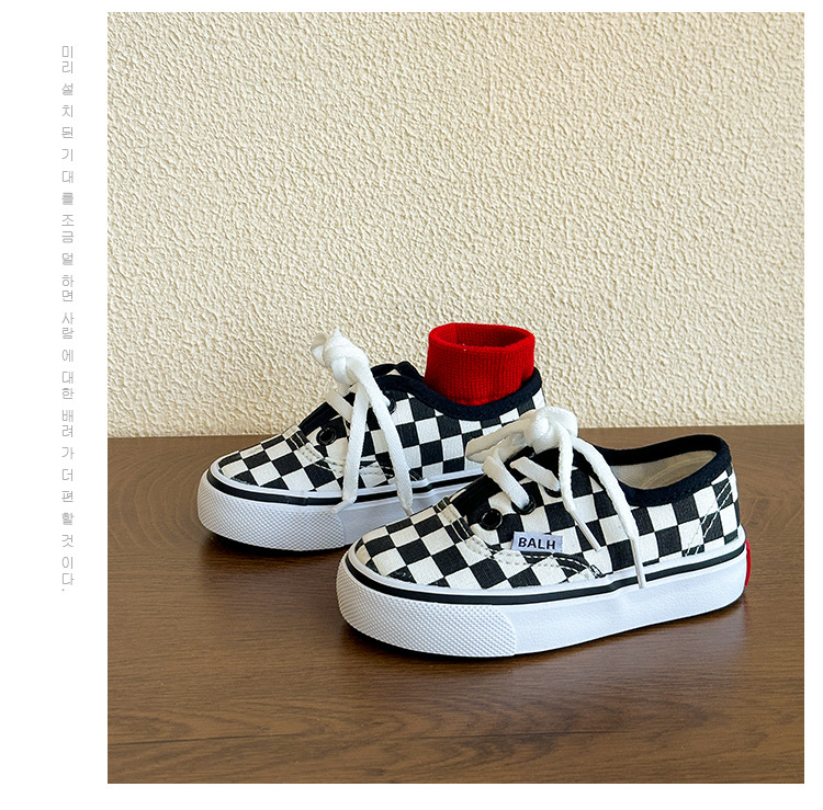 한국 스타일 어린이 캔버스 신발 소년 소녀 흑백 격자 무늬 보드 신발 아기 빨간 천 신발 봄과 가을 학생 레이스 업 작은 흰색 신발스토어 가기