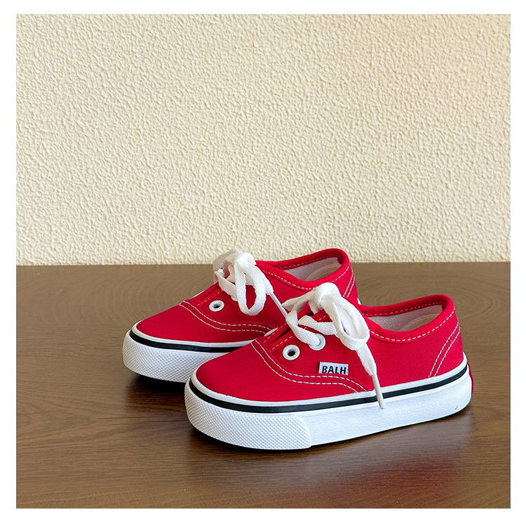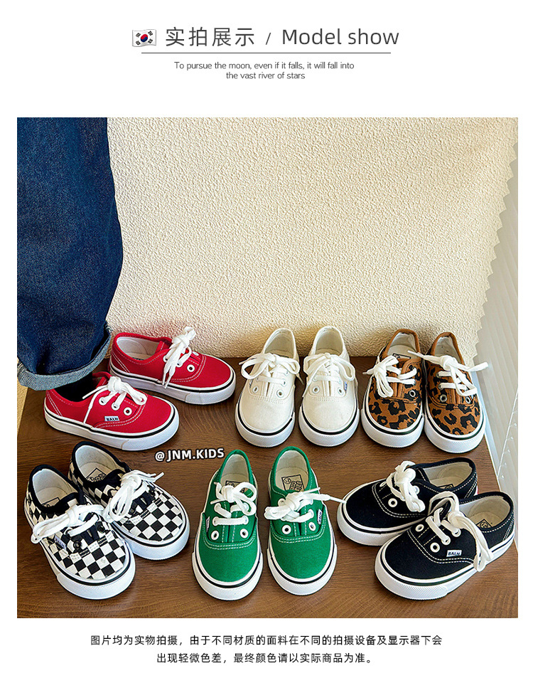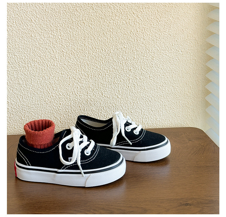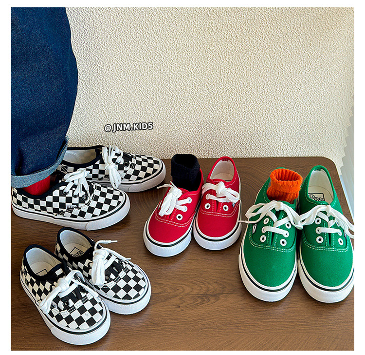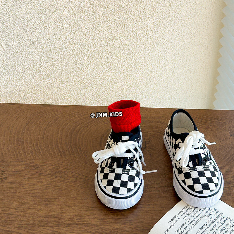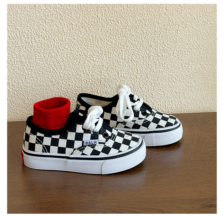 한국 스타일 어린이 캔버스 신발 소년 소녀 흑백 격자 무늬 보드 신발 아기 빨간 천 신발 봄과 가을 학생 레이스 업 작은 흰색 신발