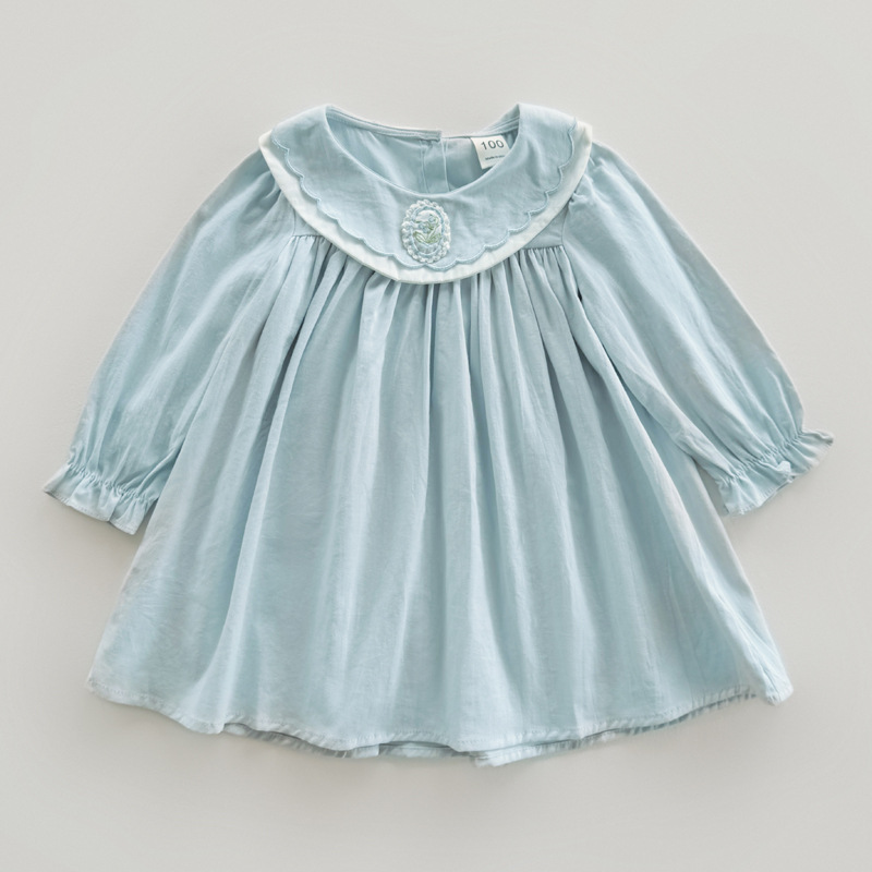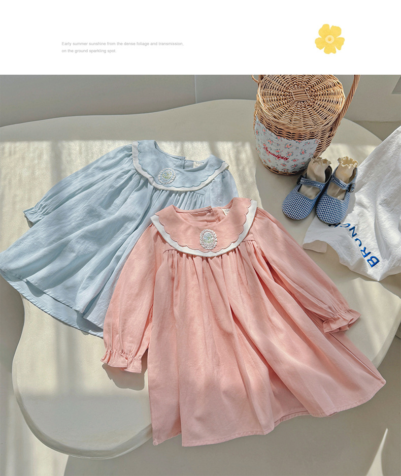 한국 아동복 더블 칼라 자수 소녀 원피스 2024 가을 달콤한 어린이 공주 원피스