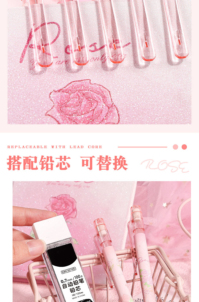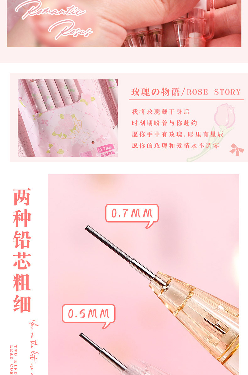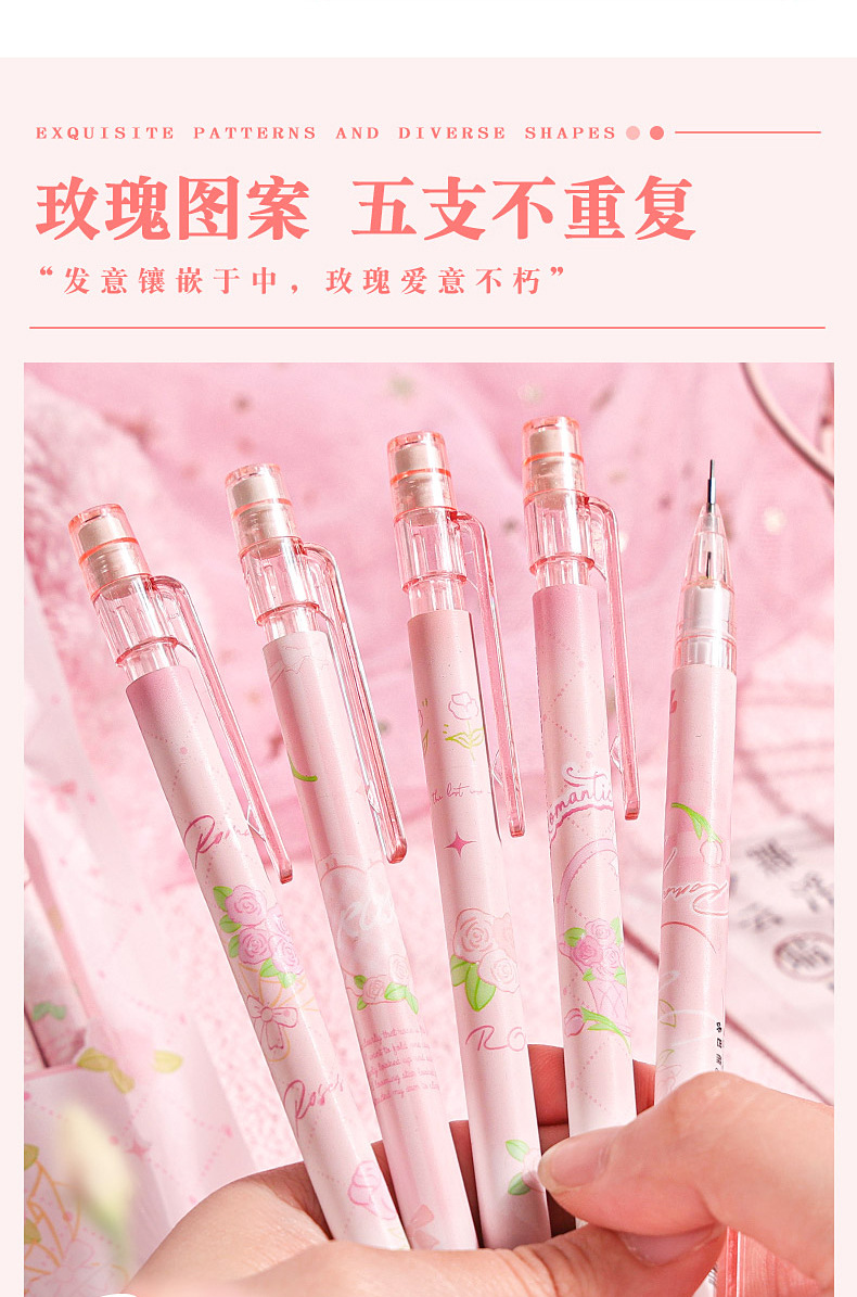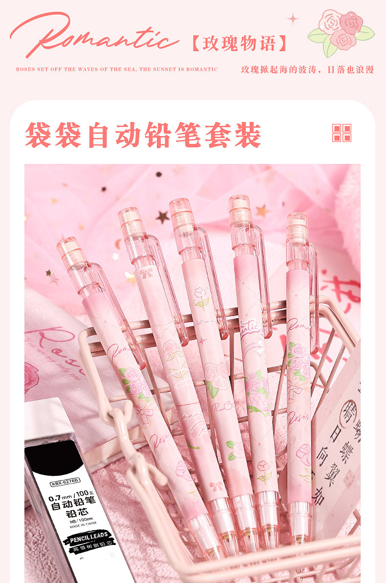 로즈 스토리 가방 초등 학생을위한 0.5 자동 연필 연속 핵심 활동 연필 귀여운 소녀 자동 펜