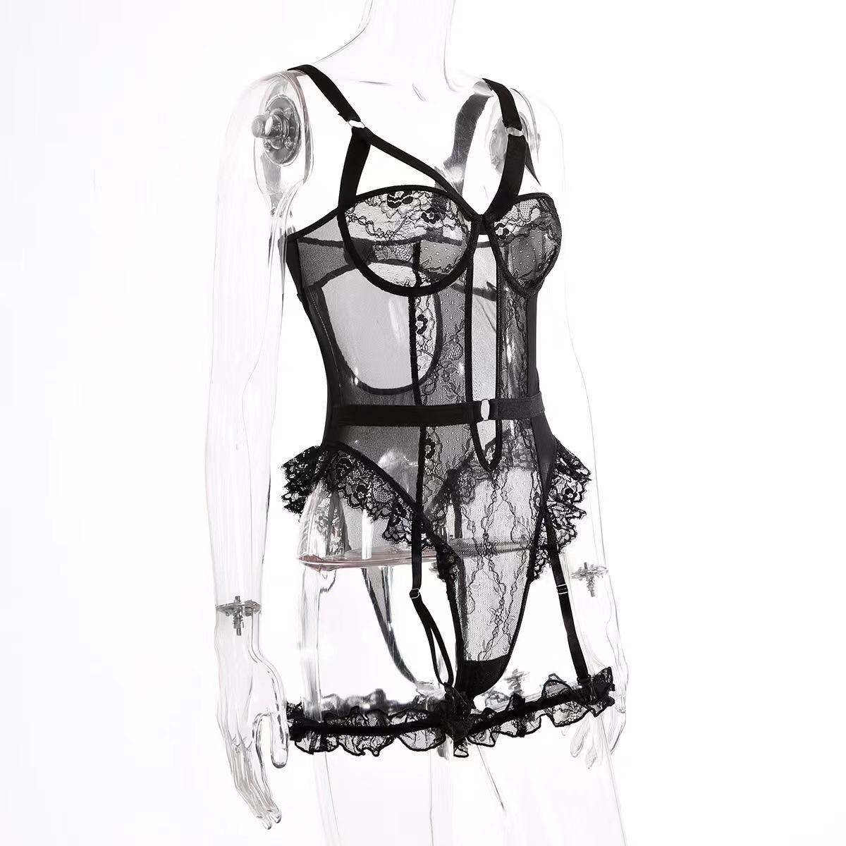 유럽과 미국의 해외 무역 섹시 속옷, 여성용 레이스 메쉬 섹시 슬립 원피스, 다리끈이 있는 섹시한 속이 비치는 디자인스토어 가기