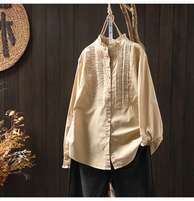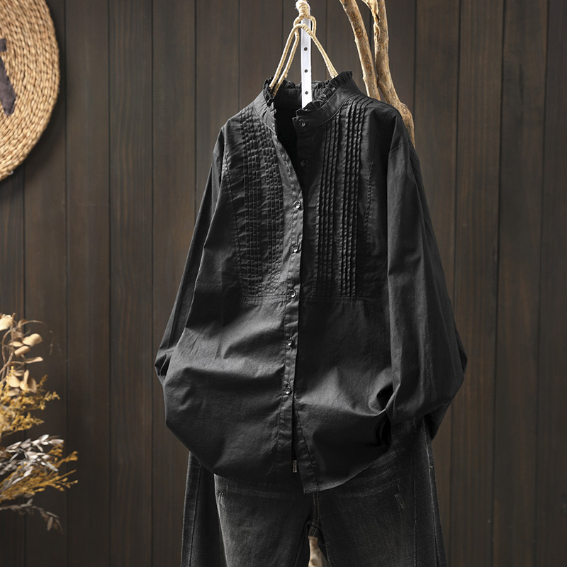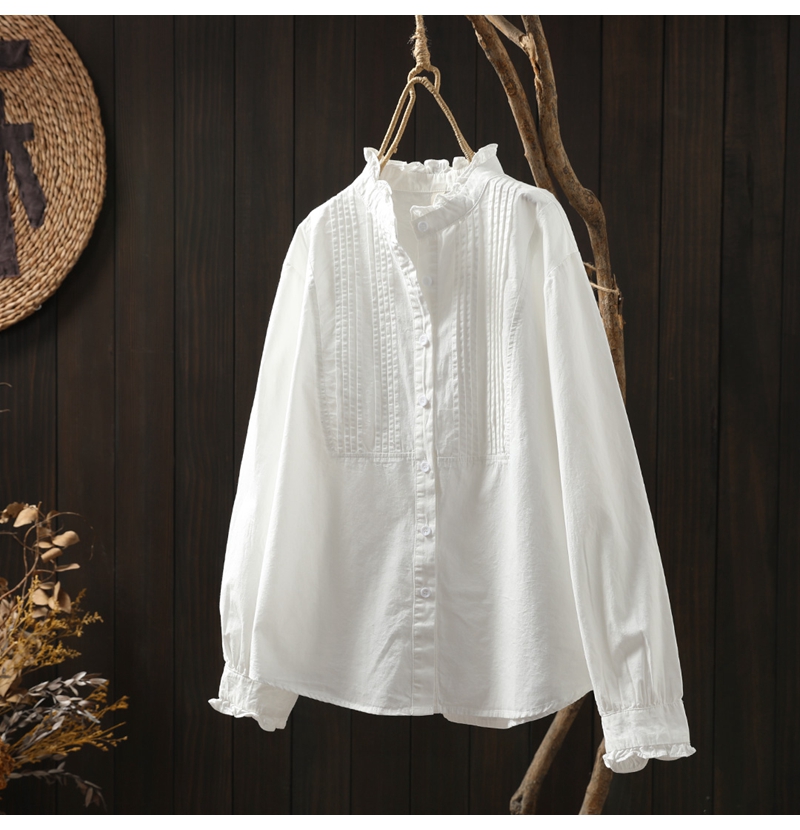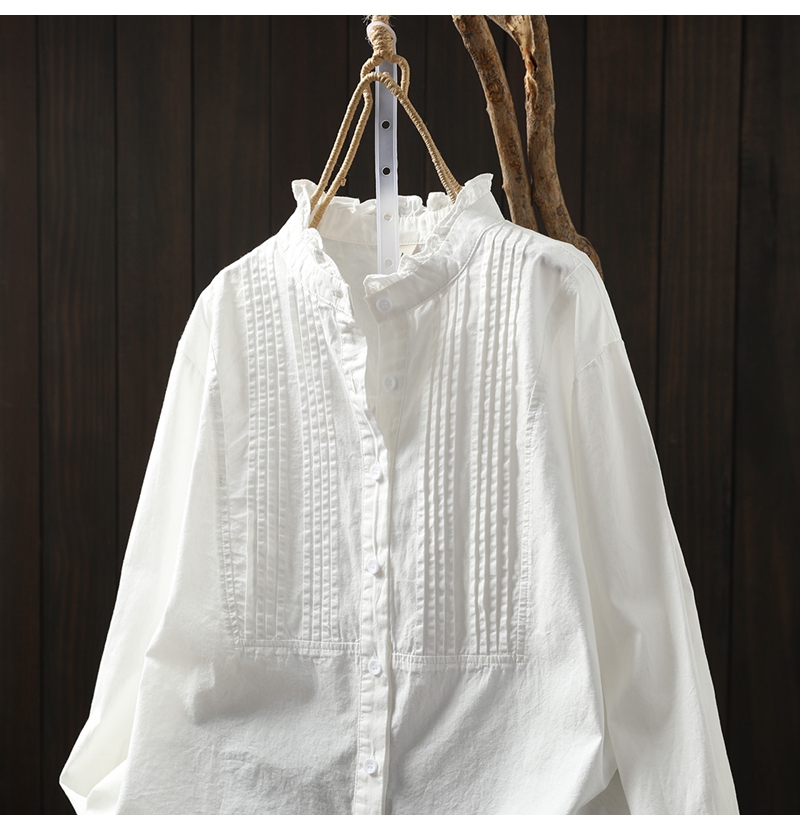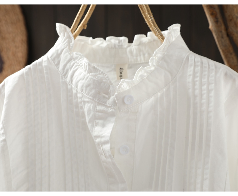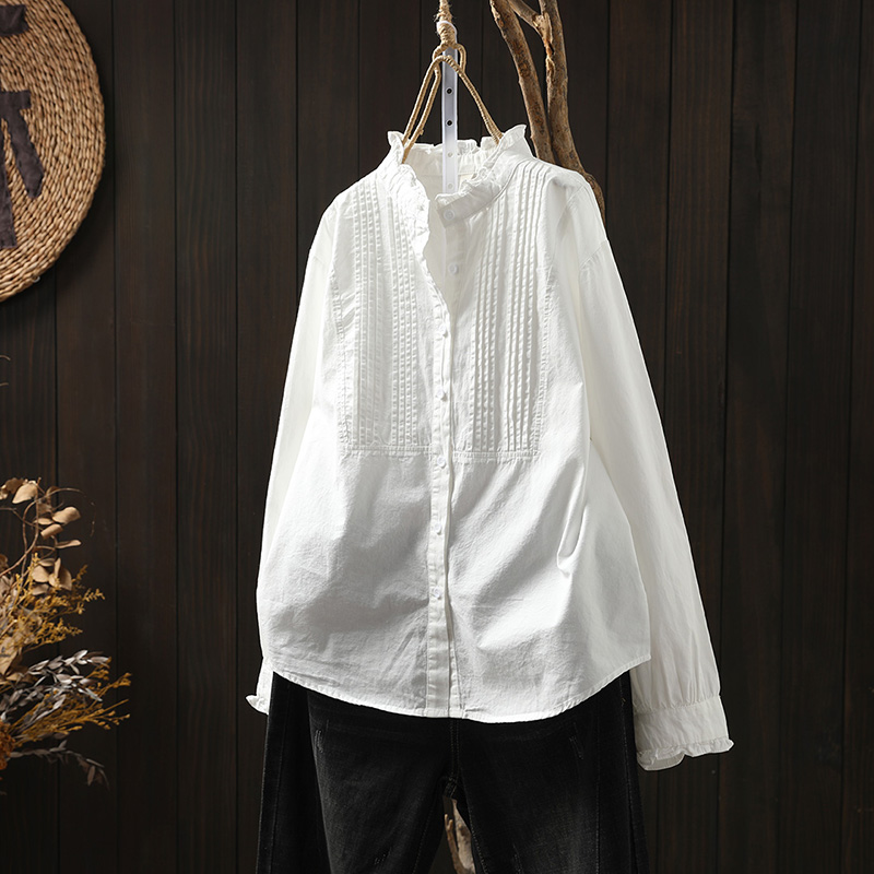 이어링 칼라 오르간 플리츠 순면 긴팔 셔츠 여성용 루즈핏 2024 봄 가을 스탠드 칼라 화이트 셔츠 예술적 스타일스토어 가기