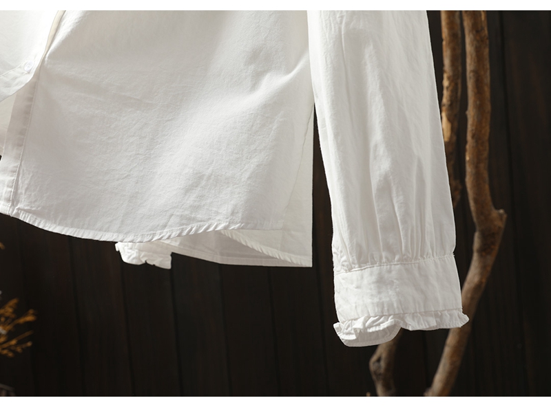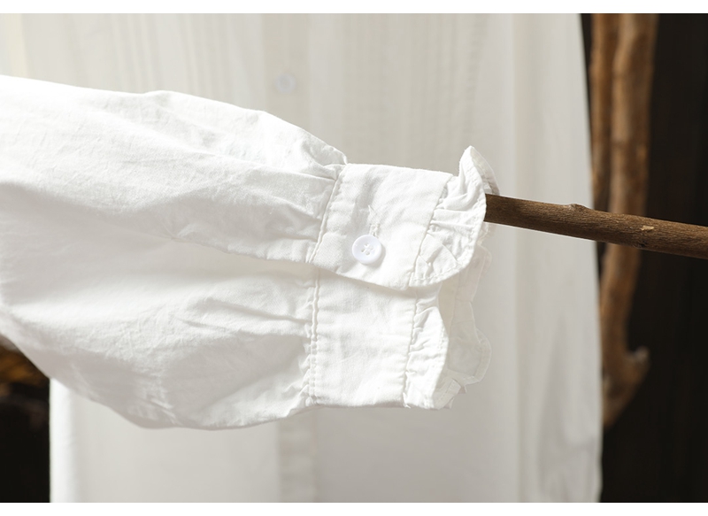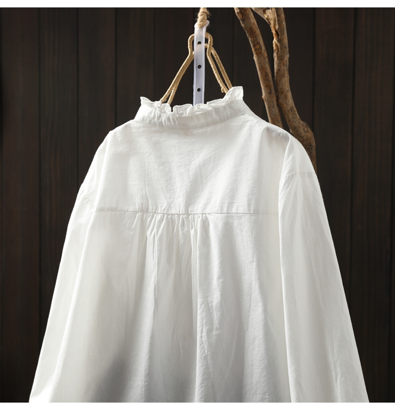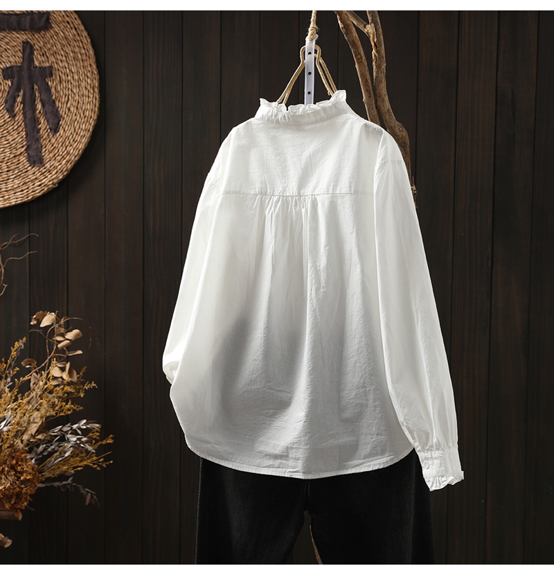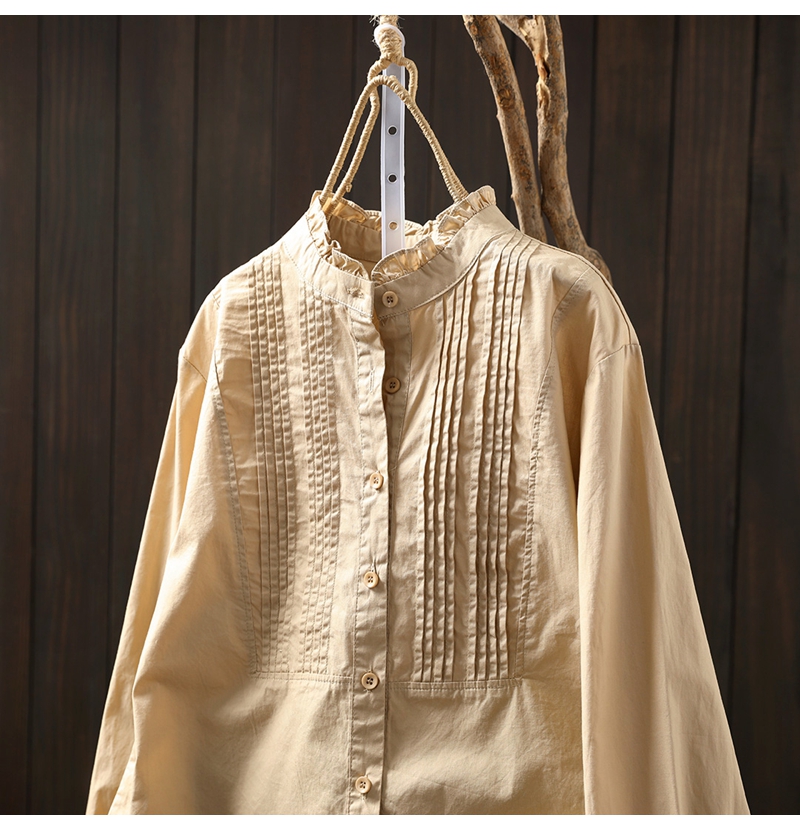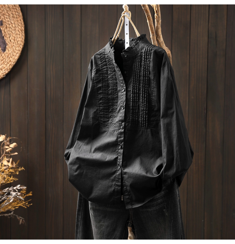 이어링 칼라 오르간 플리츠 순면 긴팔 셔츠 여성용 루즈핏 2024 봄 가을 스탠드 칼라 화이트 셔츠 예술적 스타일스토어 가기