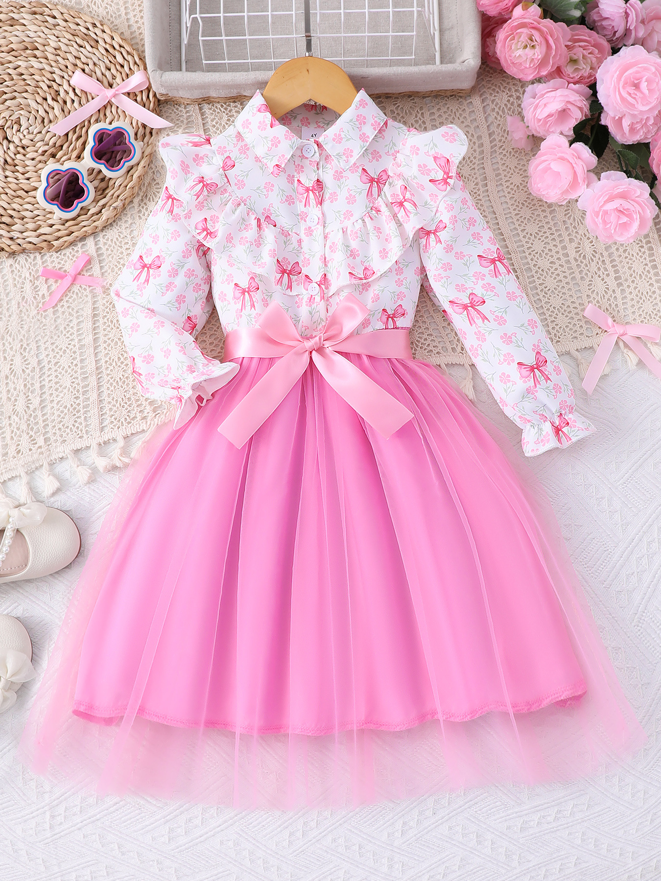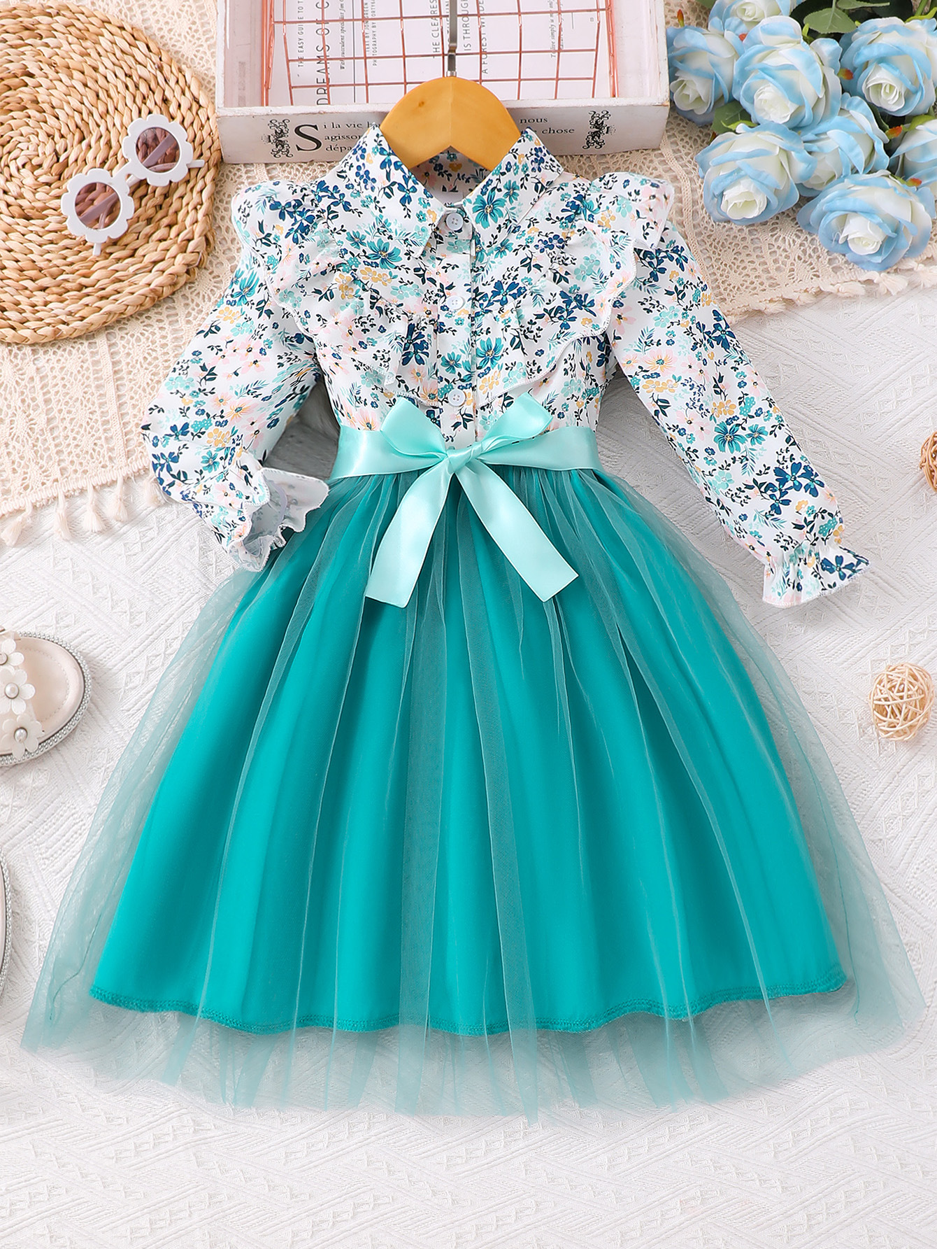 새 소녀의 큰 소년 긴 소매 랩 꽃 인쇄 메쉬 원피스 짠 벨트