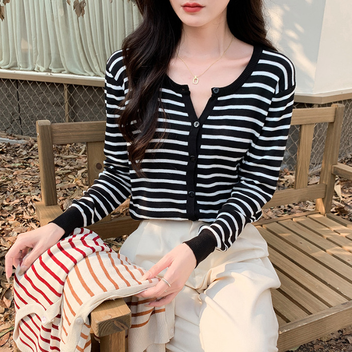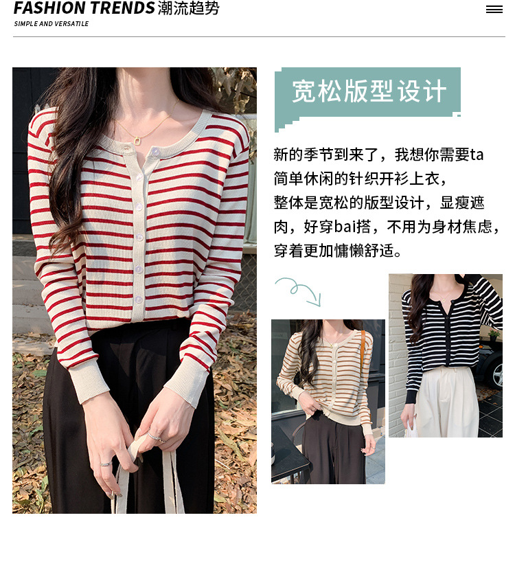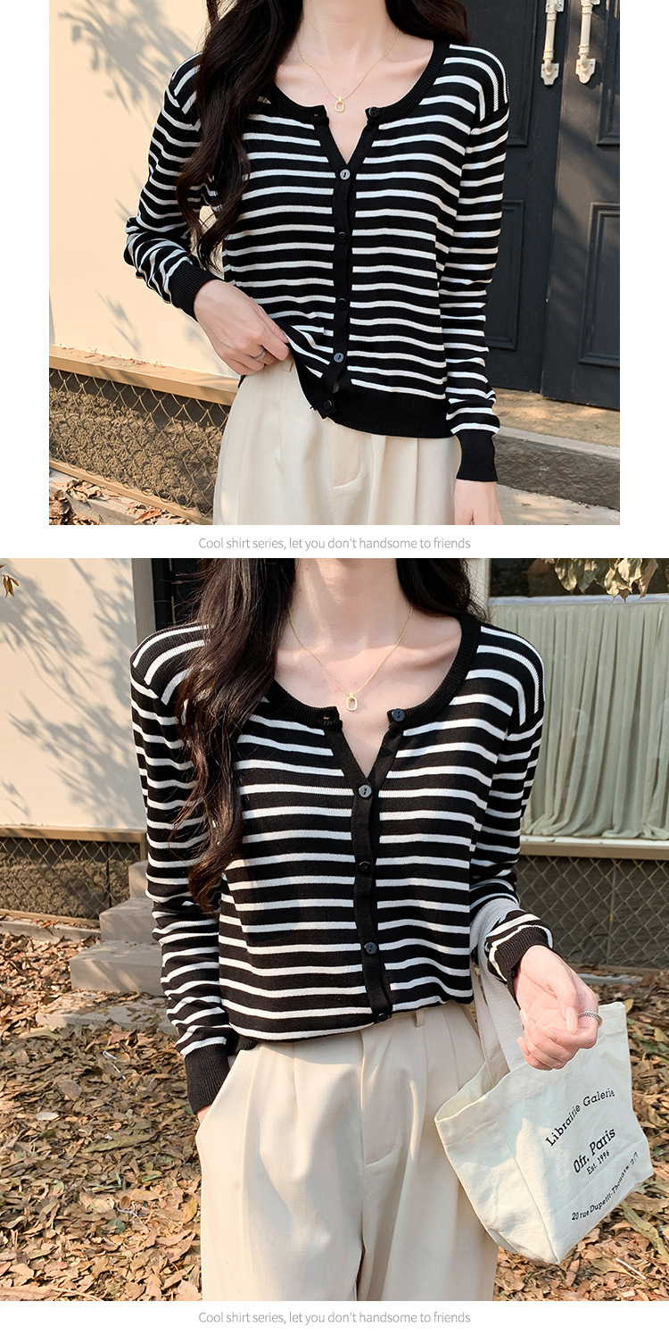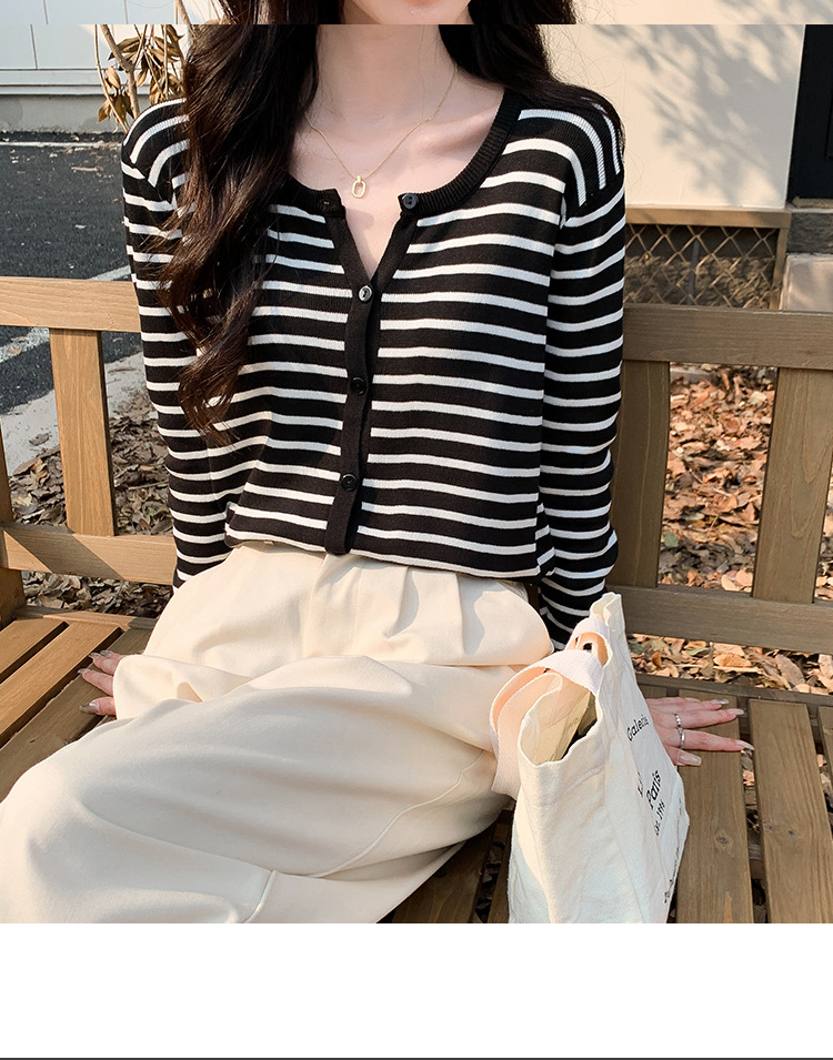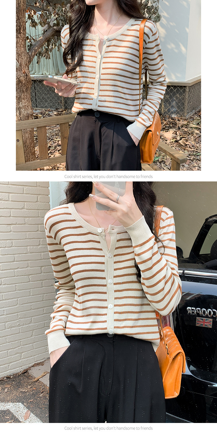 스트라이프 스웨터베이스 작은 카디건 긴팔 티셔츠 여성용 얇은 봄 초가을 코트 2024 새로운스토어 가기