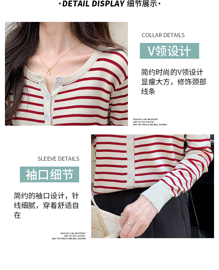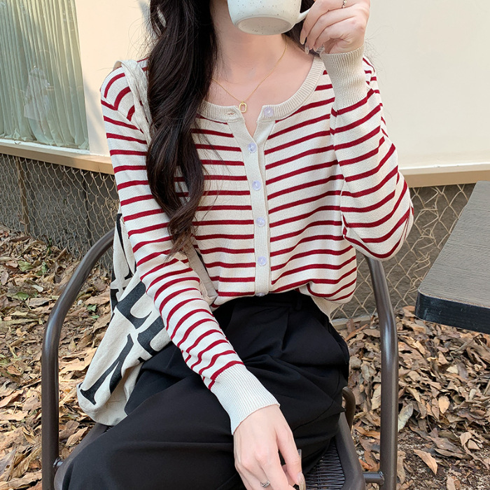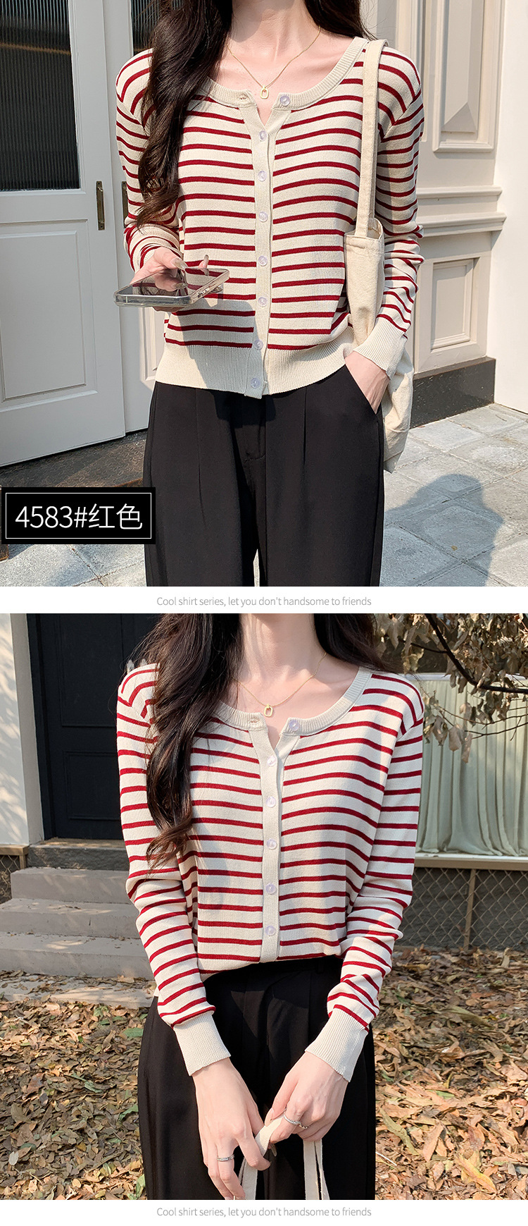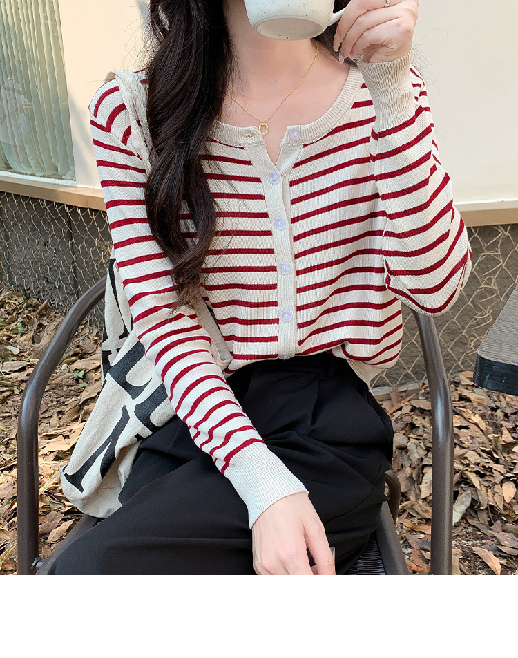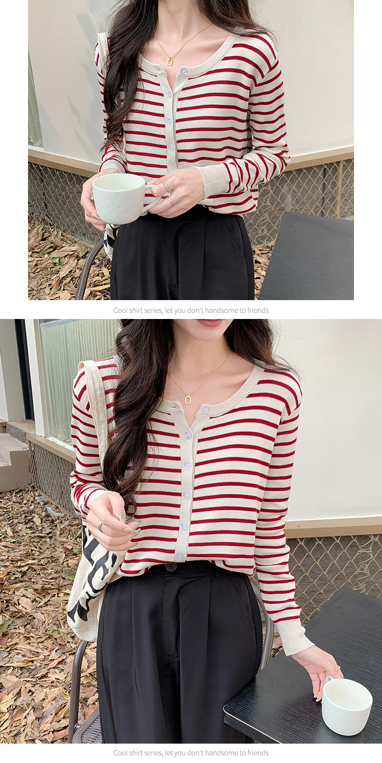 스트라이프 스웨터베이스 작은 카디건 긴팔 티셔츠 여성용 얇은 봄 초가을 코트 2024 새로운스토어 가기