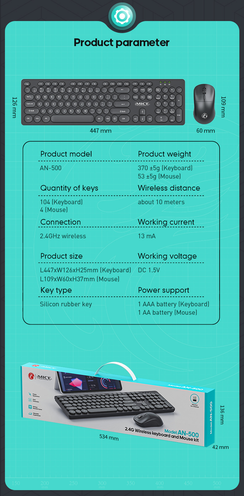 IMICE 브랜드 AN-500 무선 연결 키보드 마우스 세트 흑백 라운드 펑크 키캡 오피스 세트