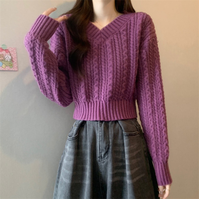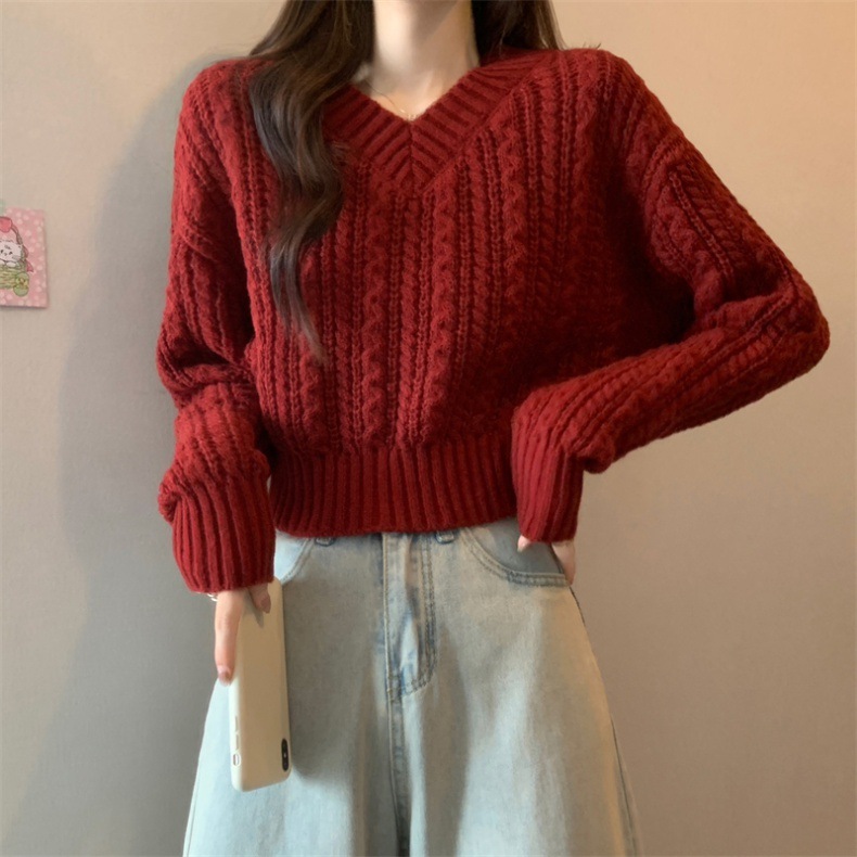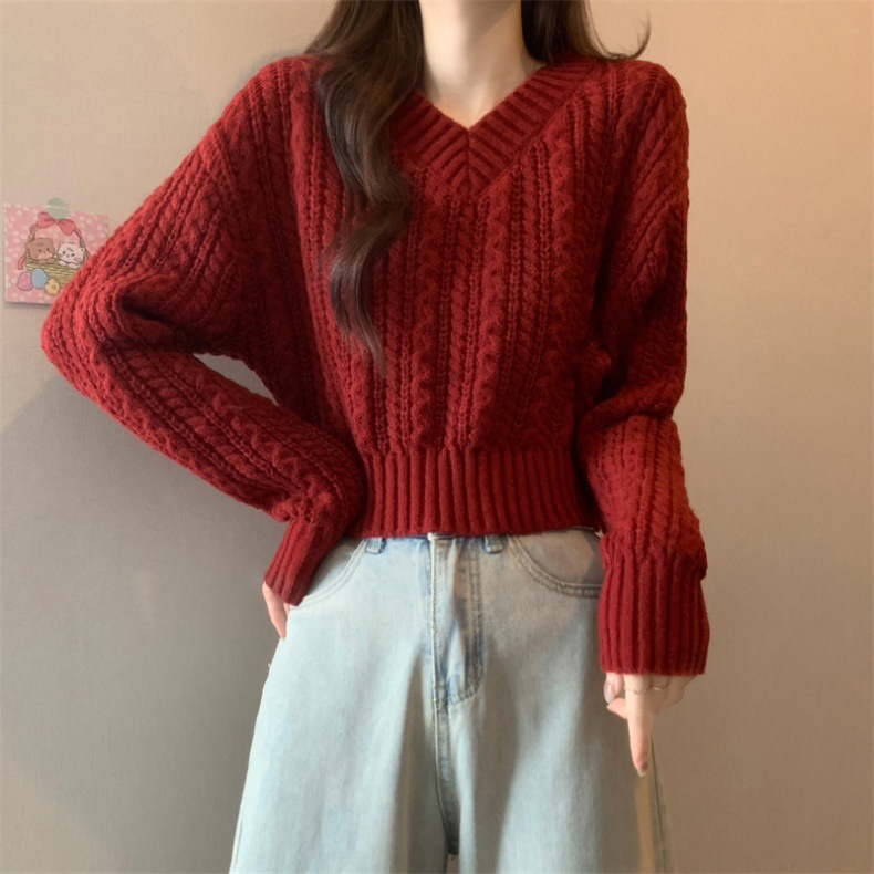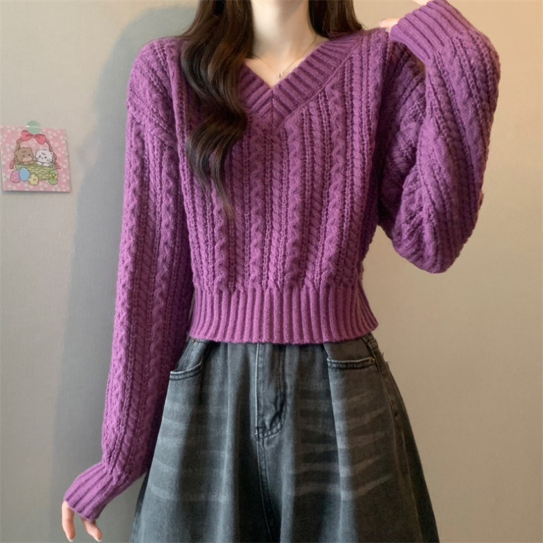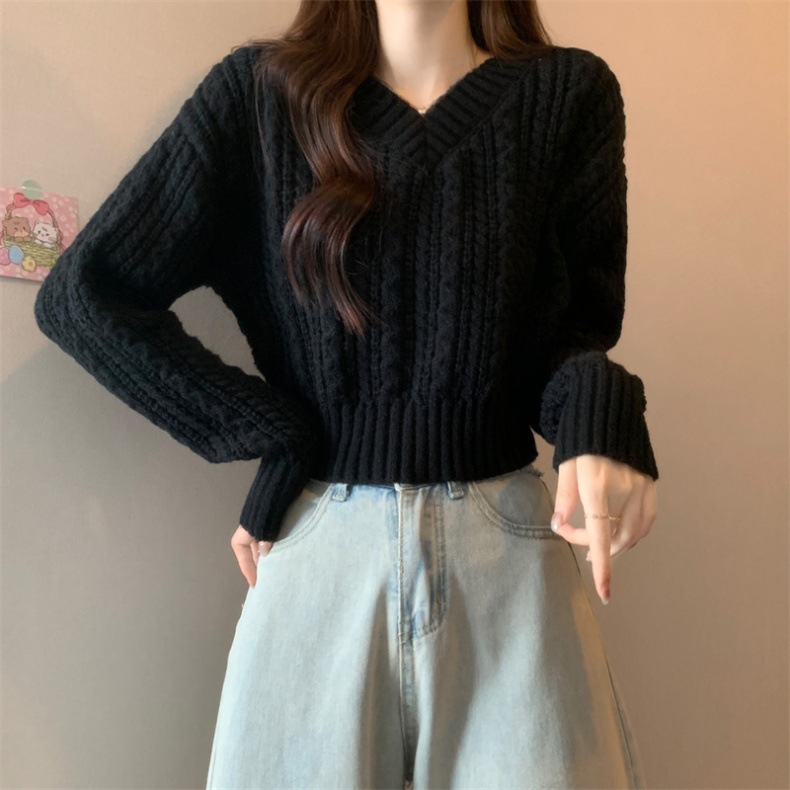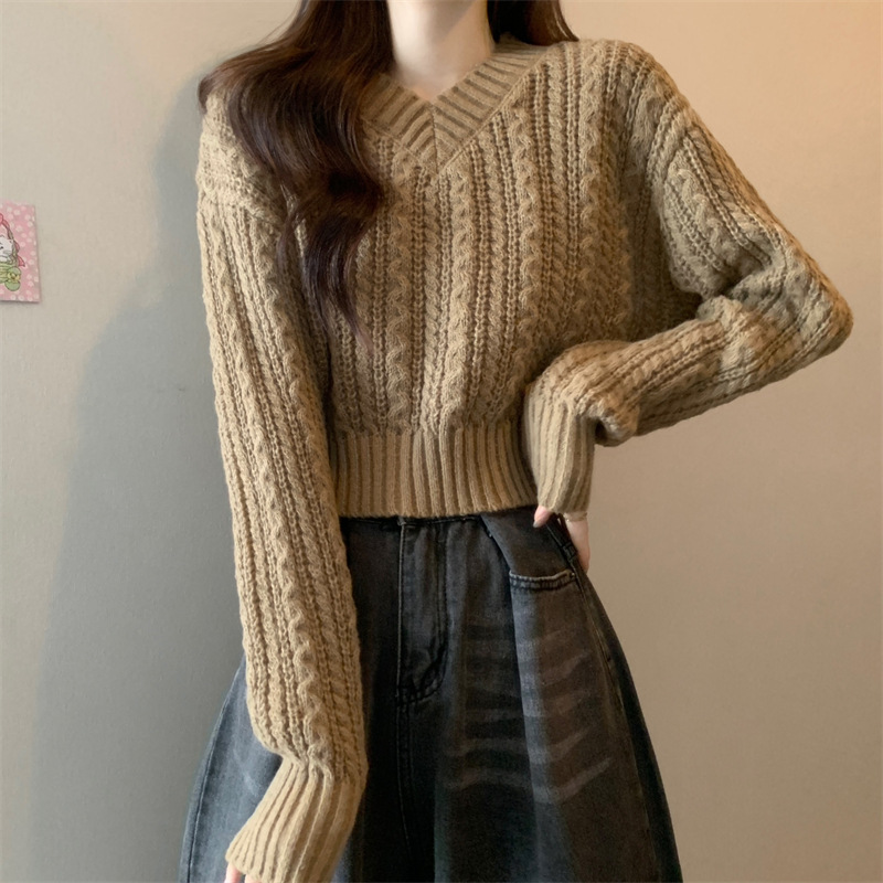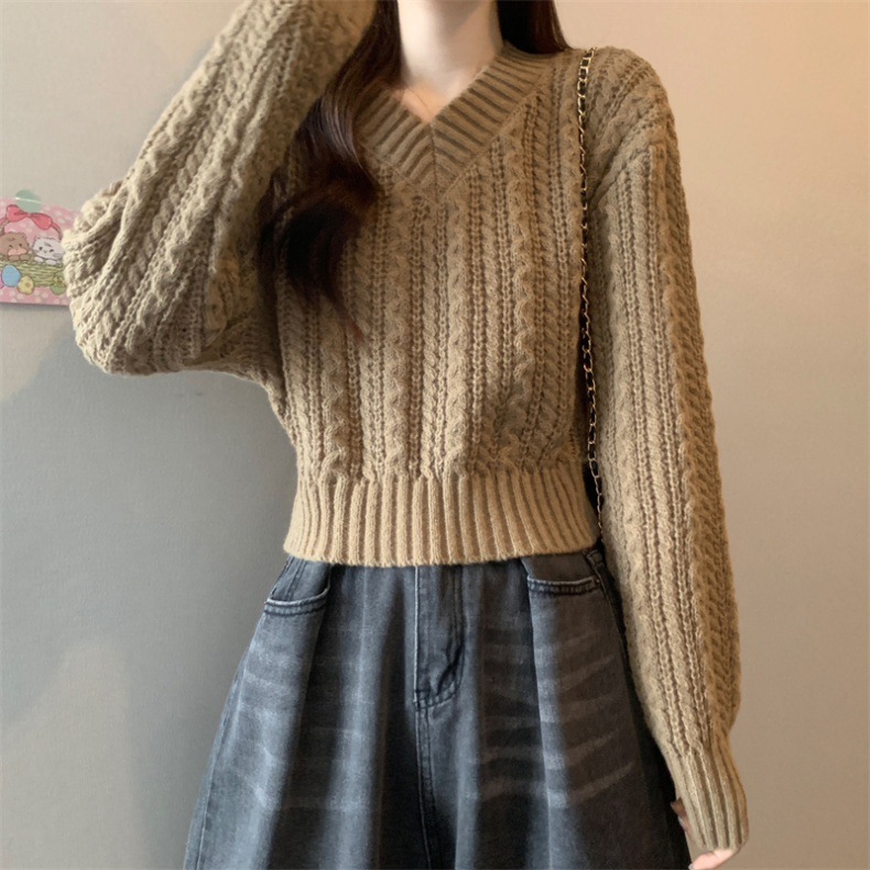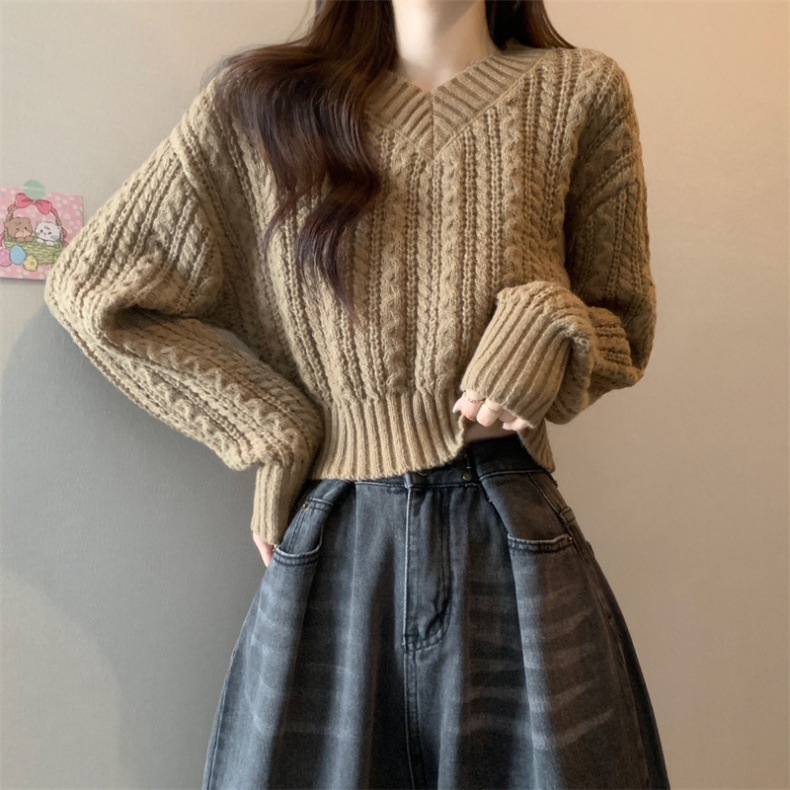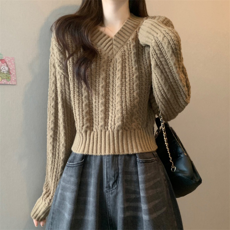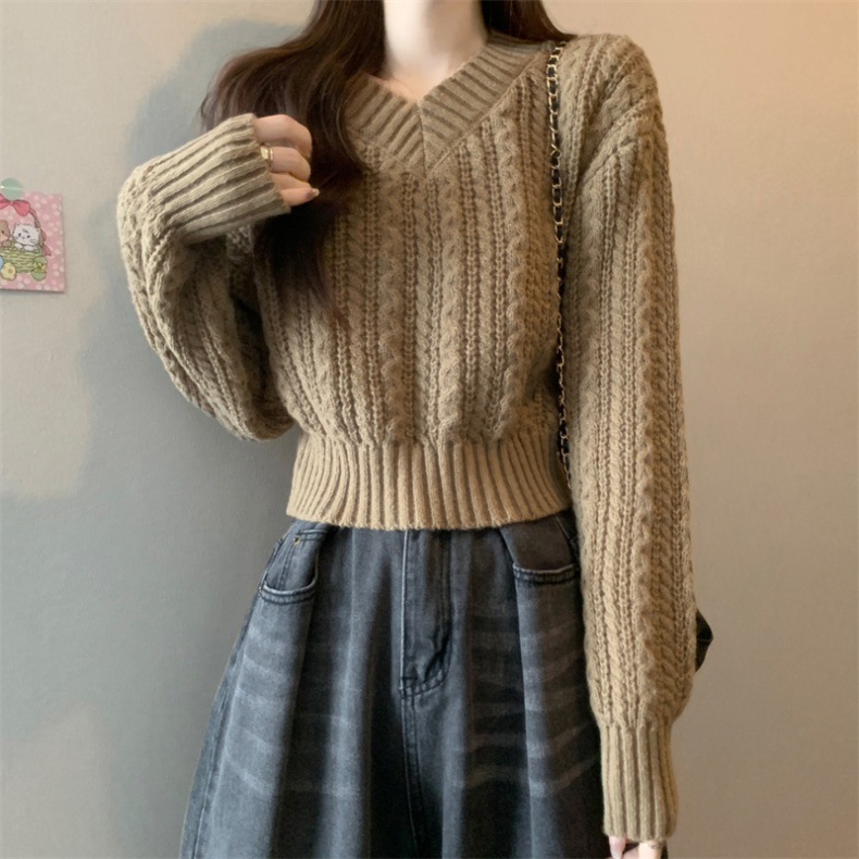 세련된 V 넥 트위스트 높은 허리 짧은 스웨터 여성의 가을과 겨울 2024 새로운 작은 풀오버 두꺼운 니트 탑스토어 가기
