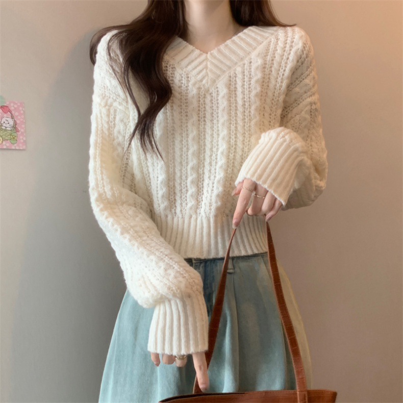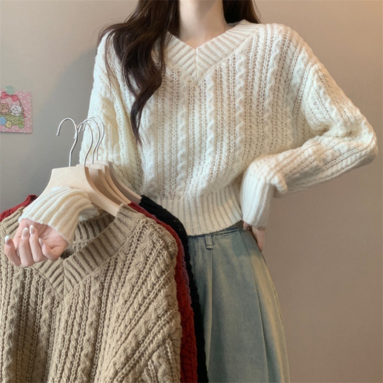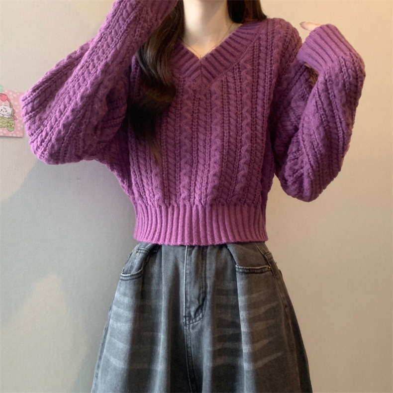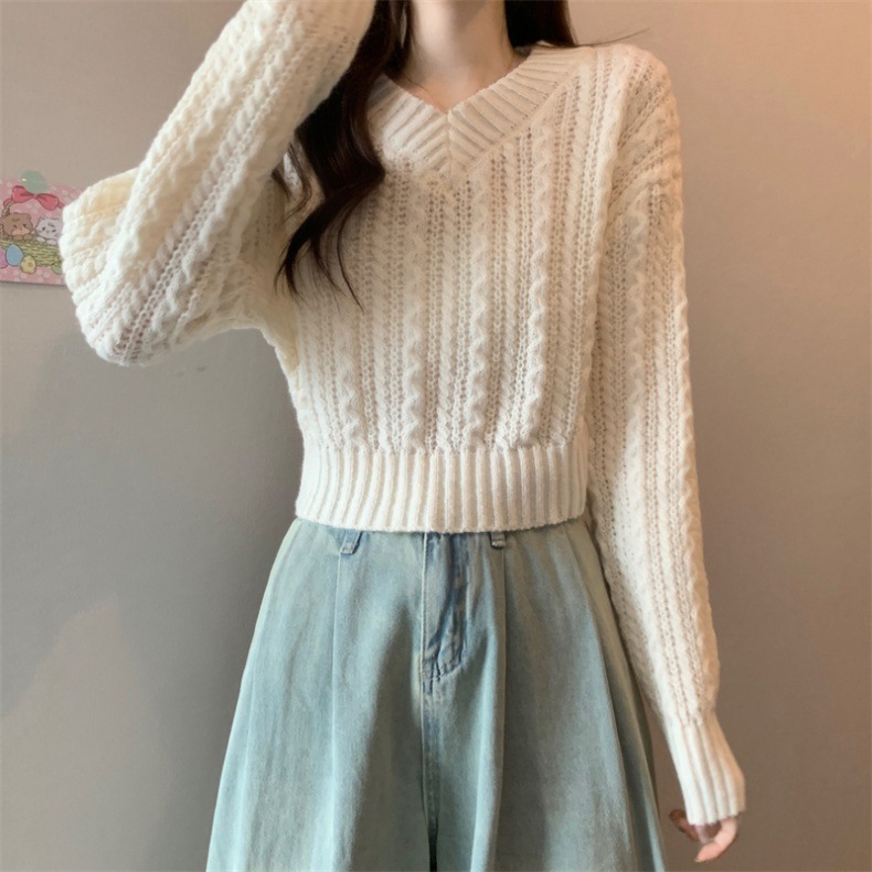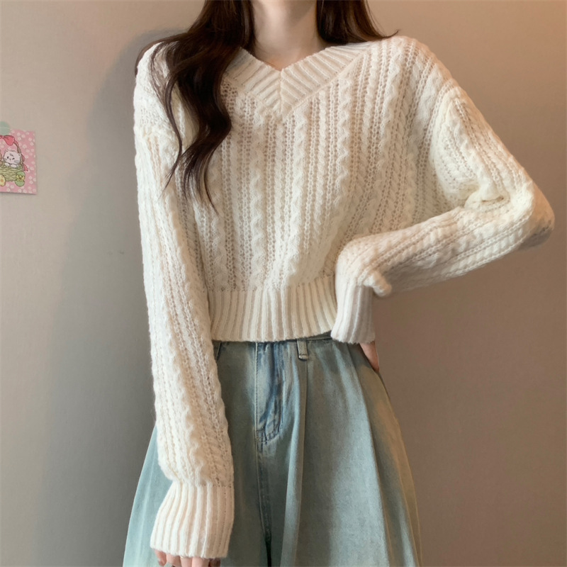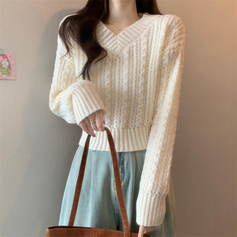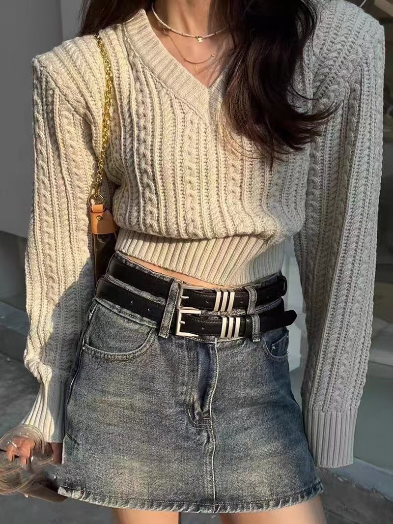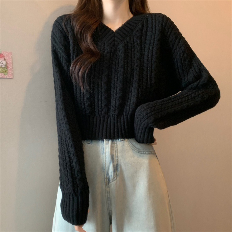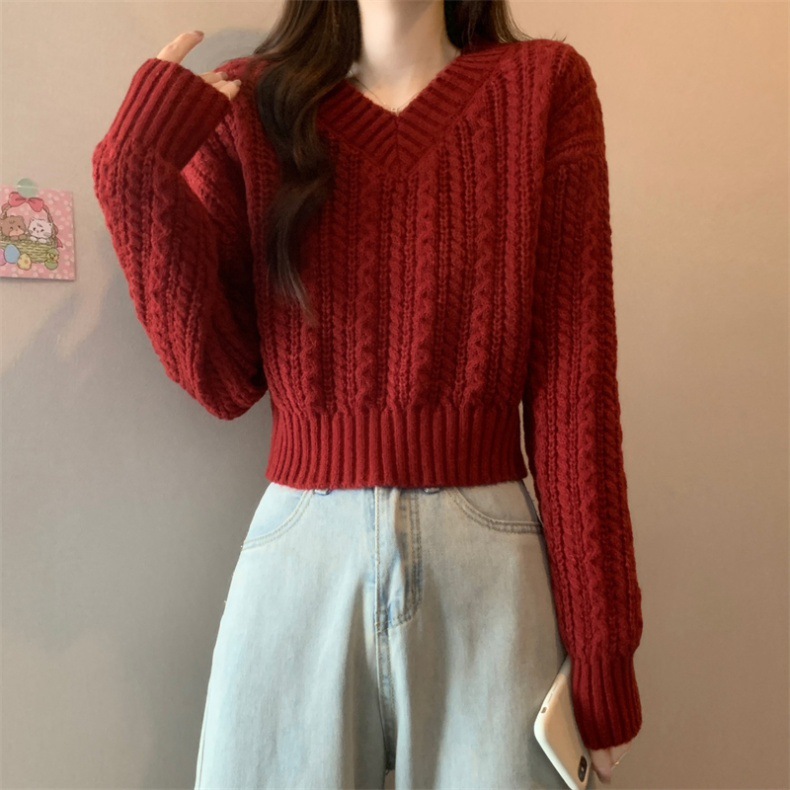 세련된 V 넥 트위스트 높은 허리 짧은 스웨터 여성의 가을과 겨울 2024 새로운 작은 풀오버 두꺼운 니트 탑스토어 가기