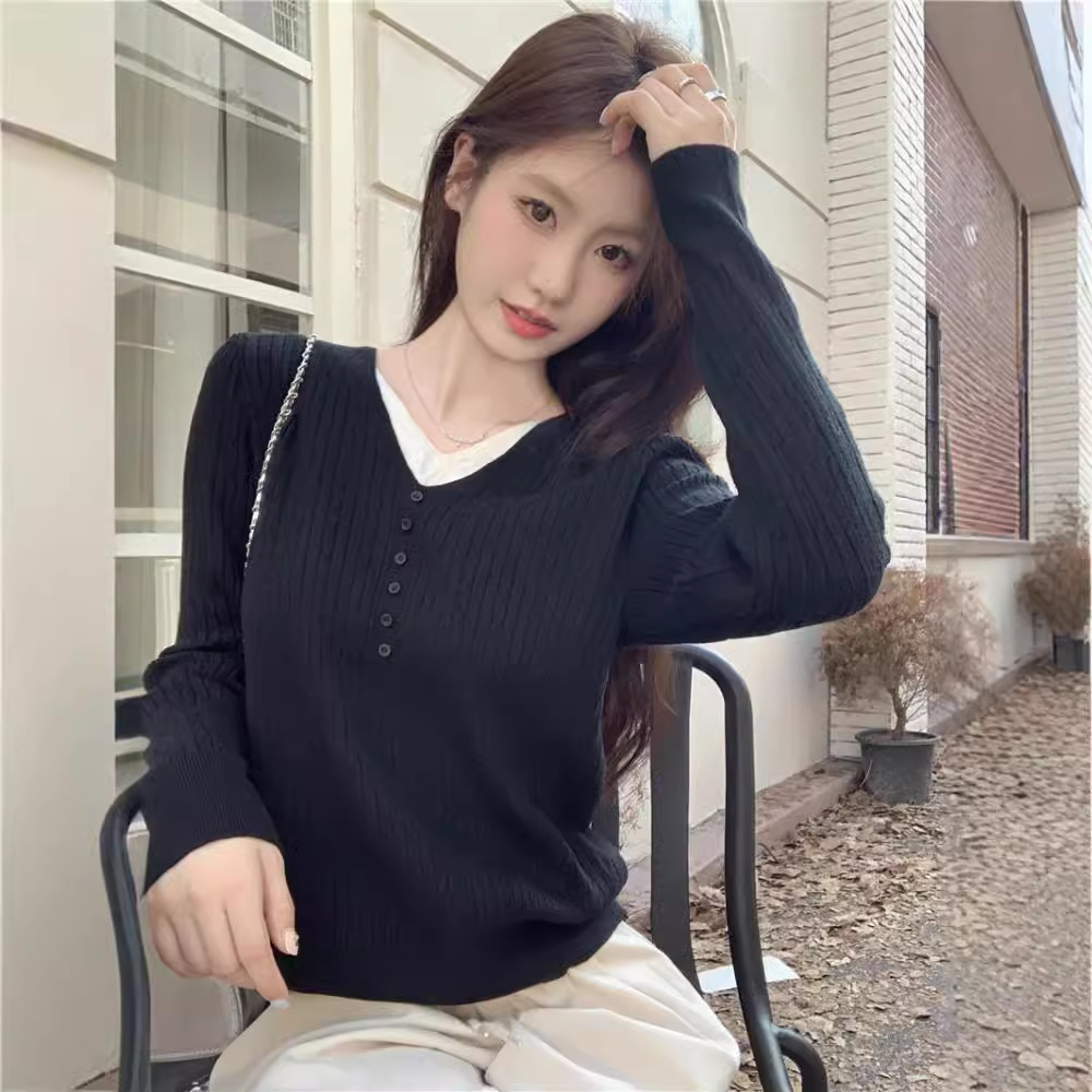 가을과 겨울 2024 새로운 가짜 투피스 내베이스 스웨터 외부 착용 여성용 샤넬 스타일 니트웨어 살구색 탑스토어 가기