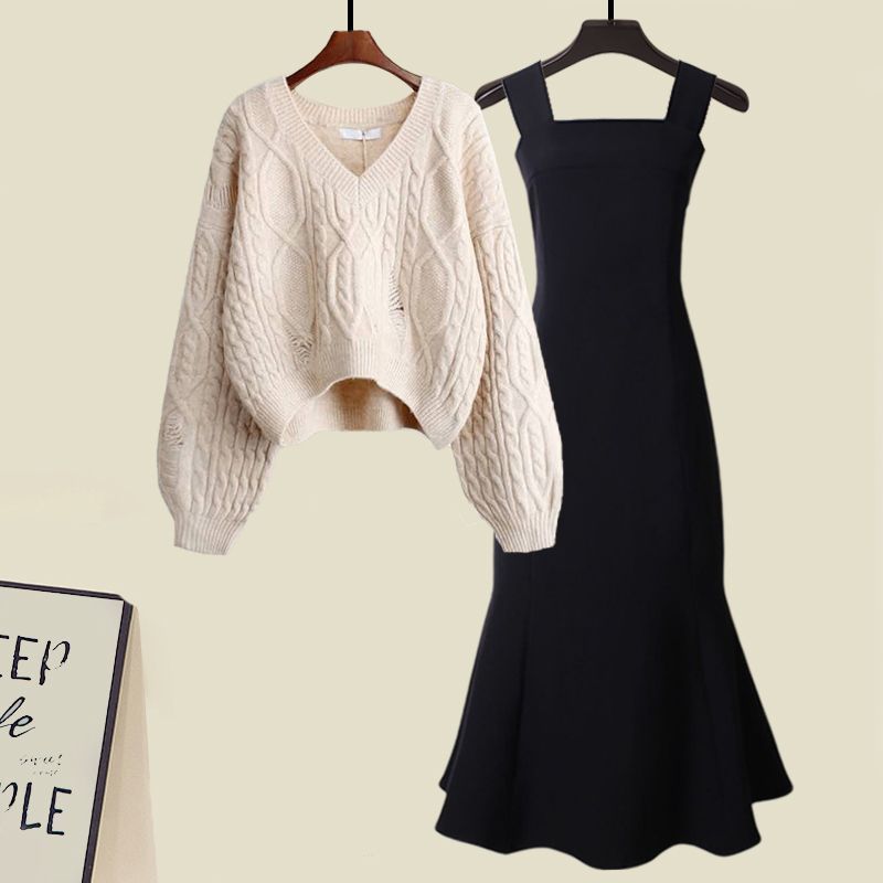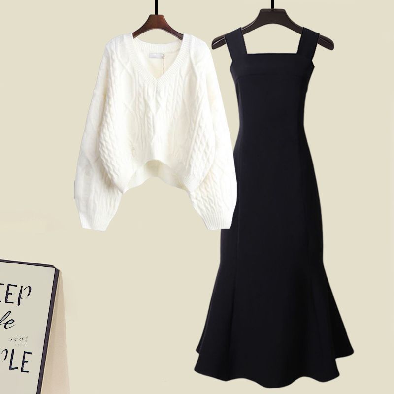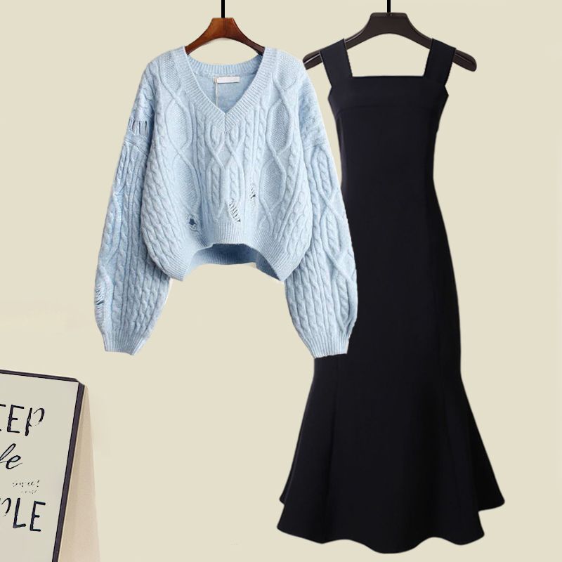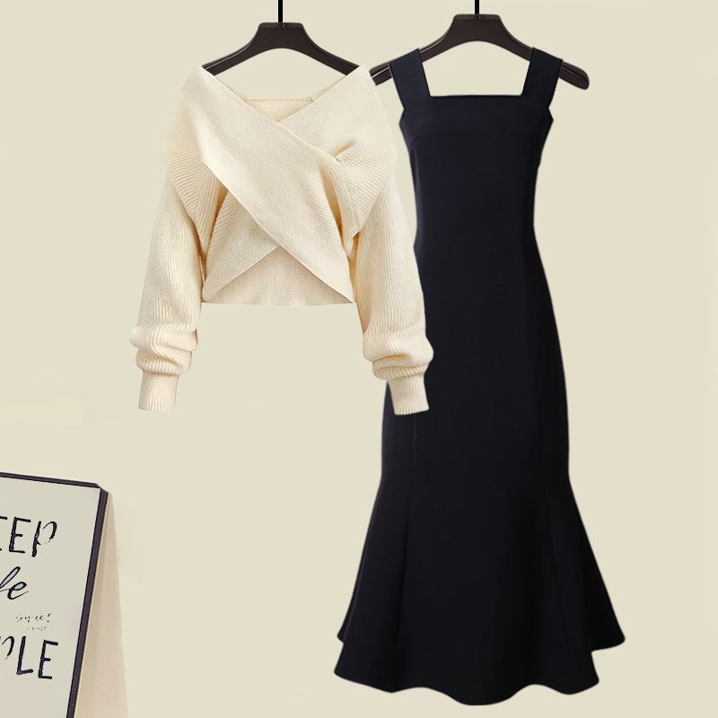 G 가을 세트 여성의 새로운 피쉬 테일 원피스 투피스 서양식 프랑스 스타일 크로스 니트 스웨터스토어 가기