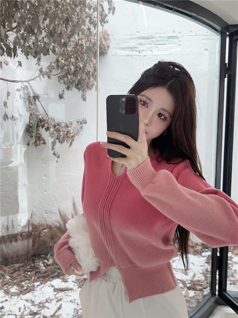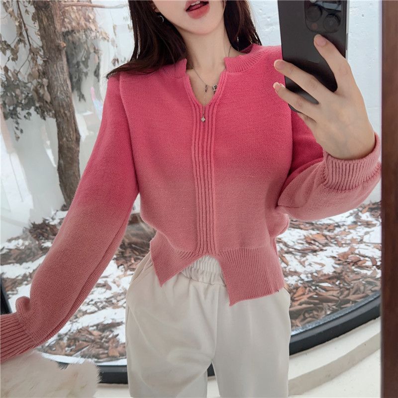 그라디언트 V-넥 스웨터 여성의 가을과 겨울 새로운 디자인 틈새 니트웨어 높은 허리 슬리밍 짧은 긴 소매 탑스토어 가기